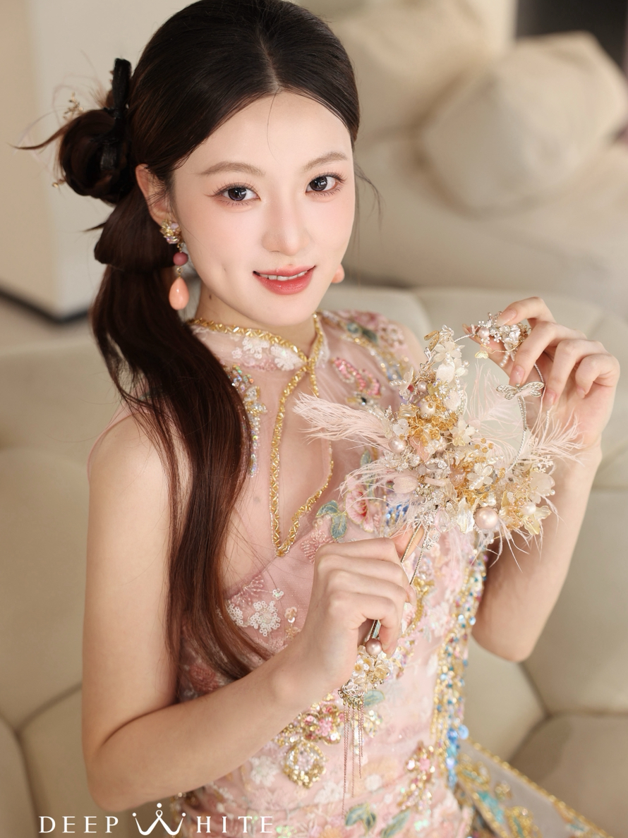 “救命!这次新娘跟妆妆造绝了!化妆师超懂我想要的清冷高级感,清透底妆+低饱和眼妆,整个人像会发光!发型和婚纱适配度100%,珍珠配饰点缀得恰到好处。全天跟妆超贴心,随时补妆调整,婚礼上被夸爆,太值了!