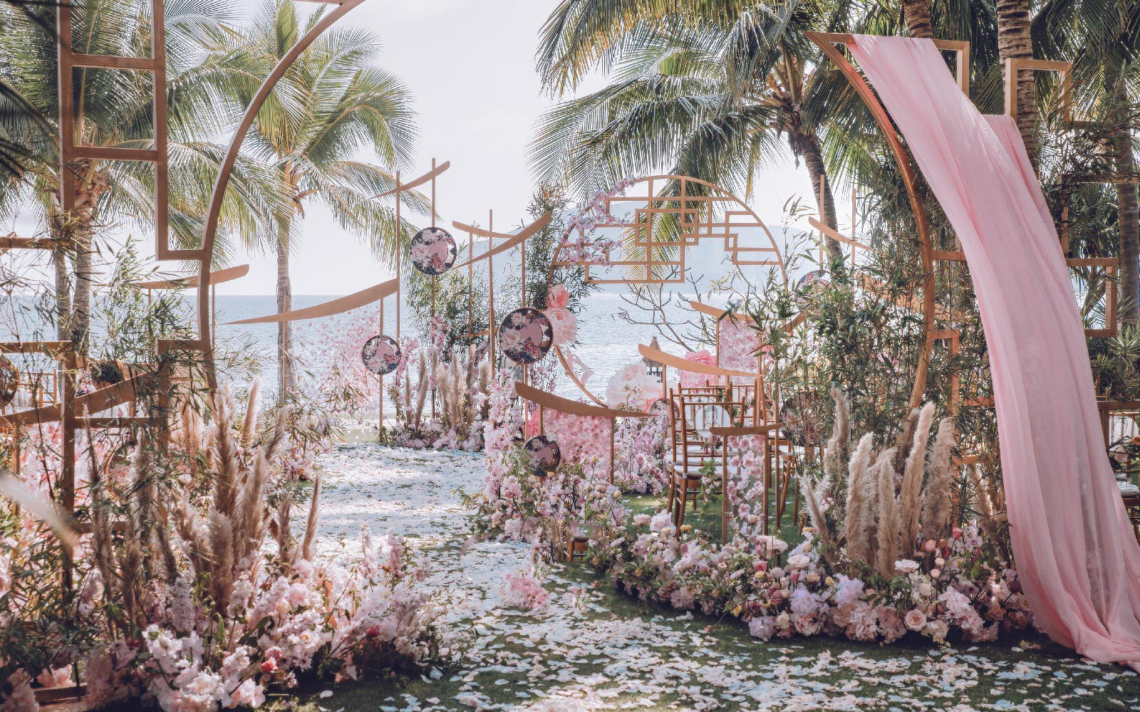 户外草坪唯美粉色系中式婚礼