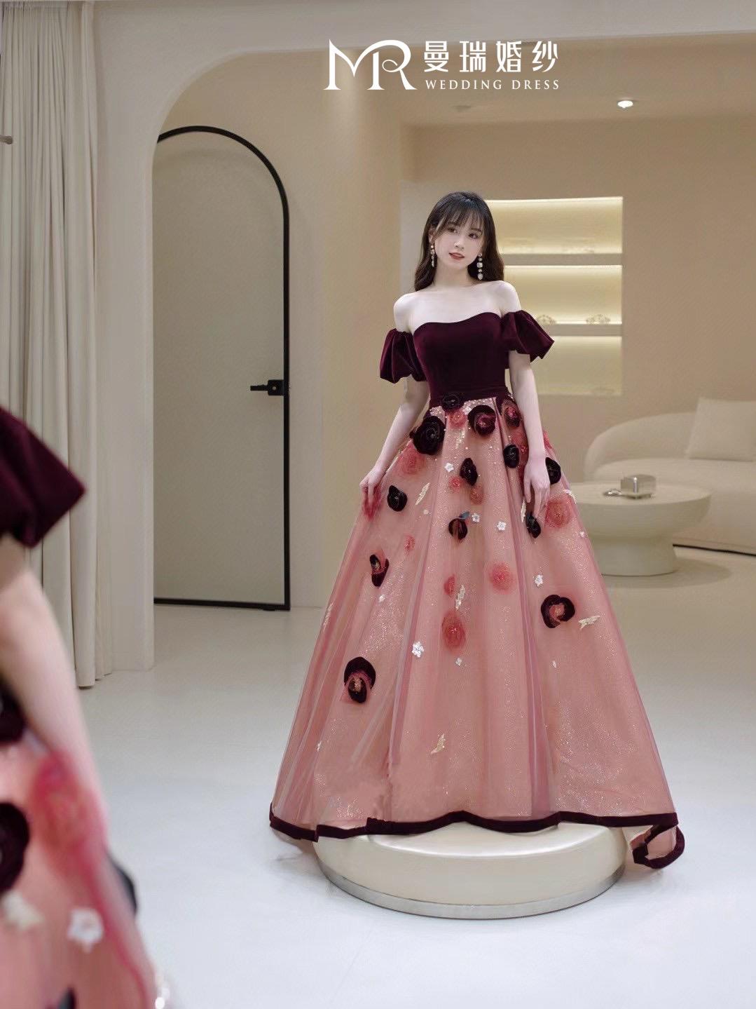粉色优雅一字肩敬酒服