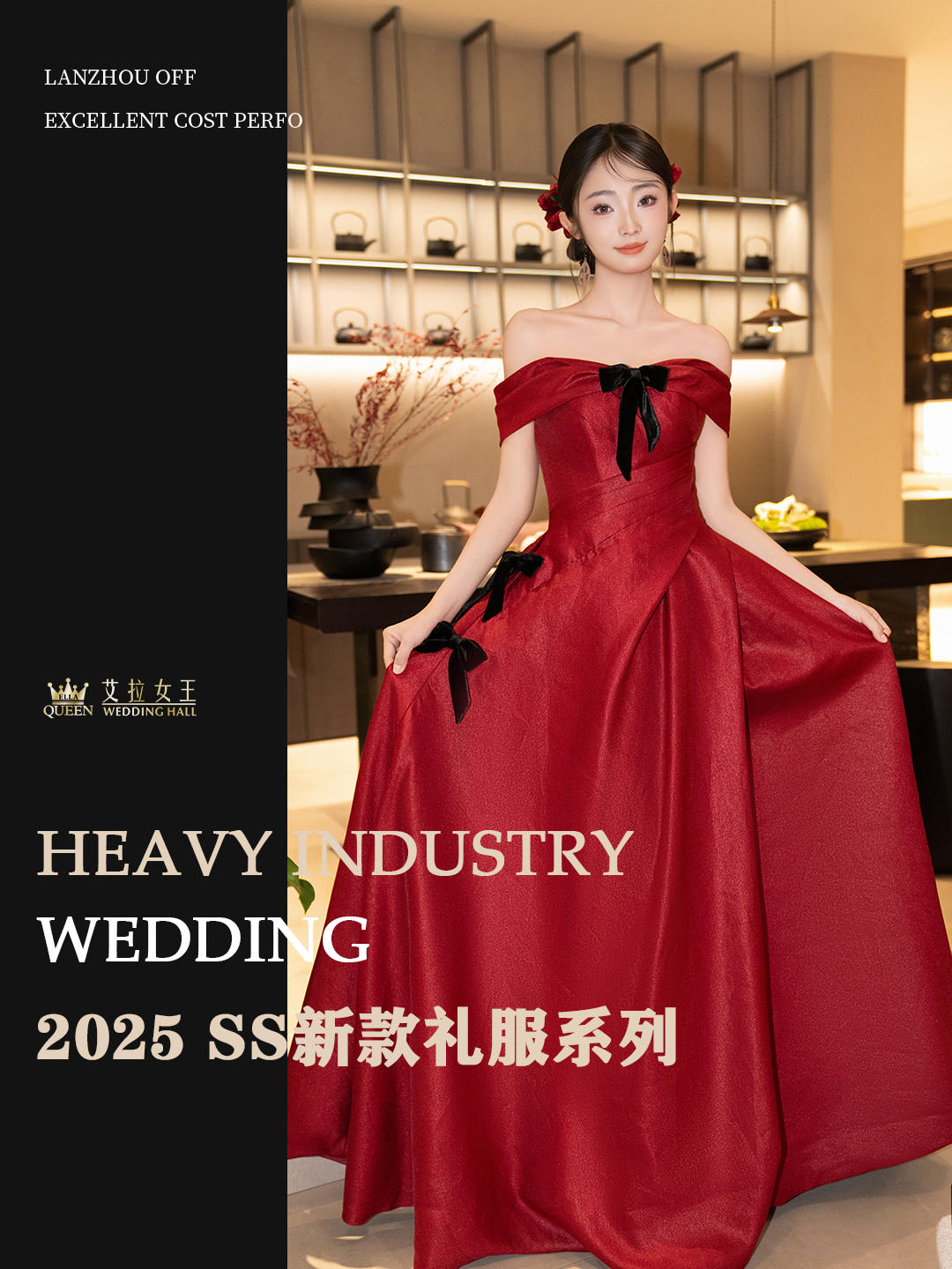 【减龄可爱】缎面一字肩红色礼服裙