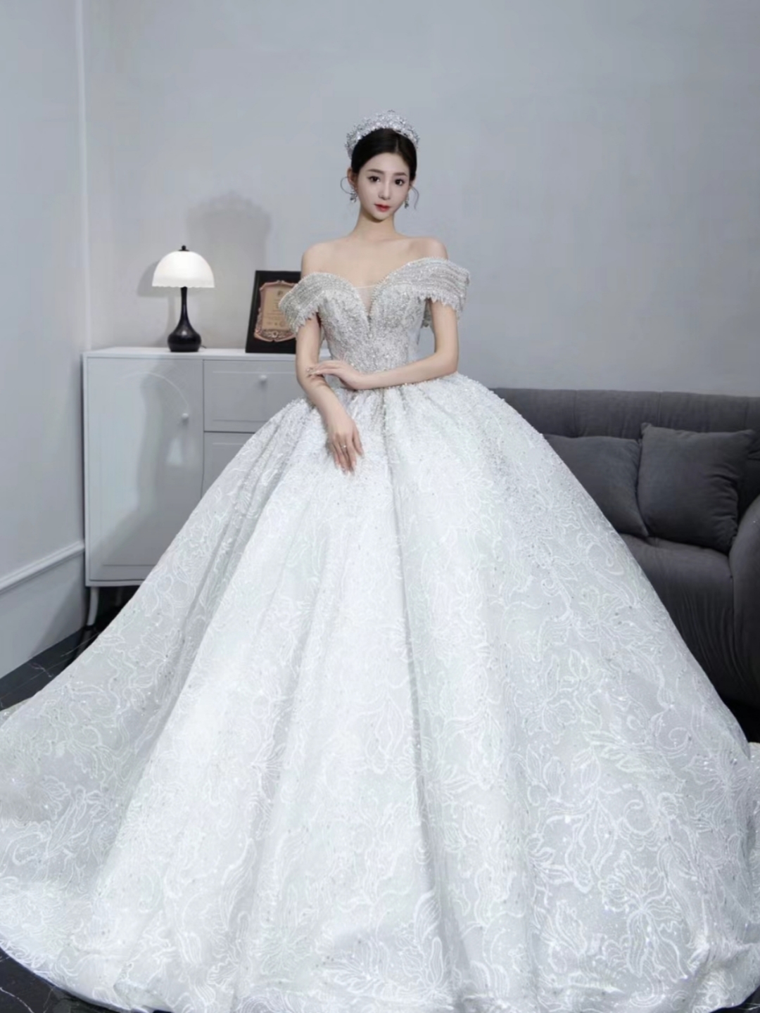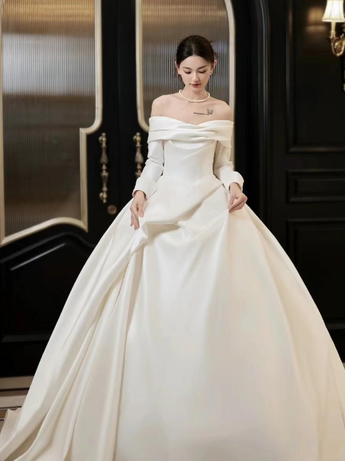 超级显瘦的一字肩婚纱