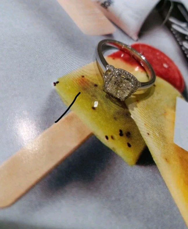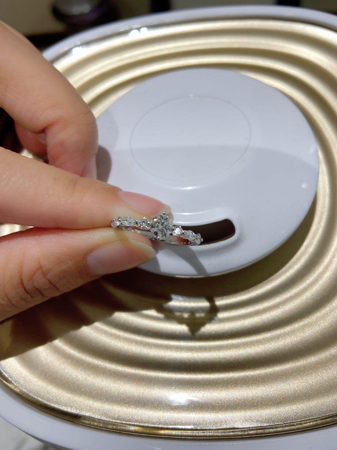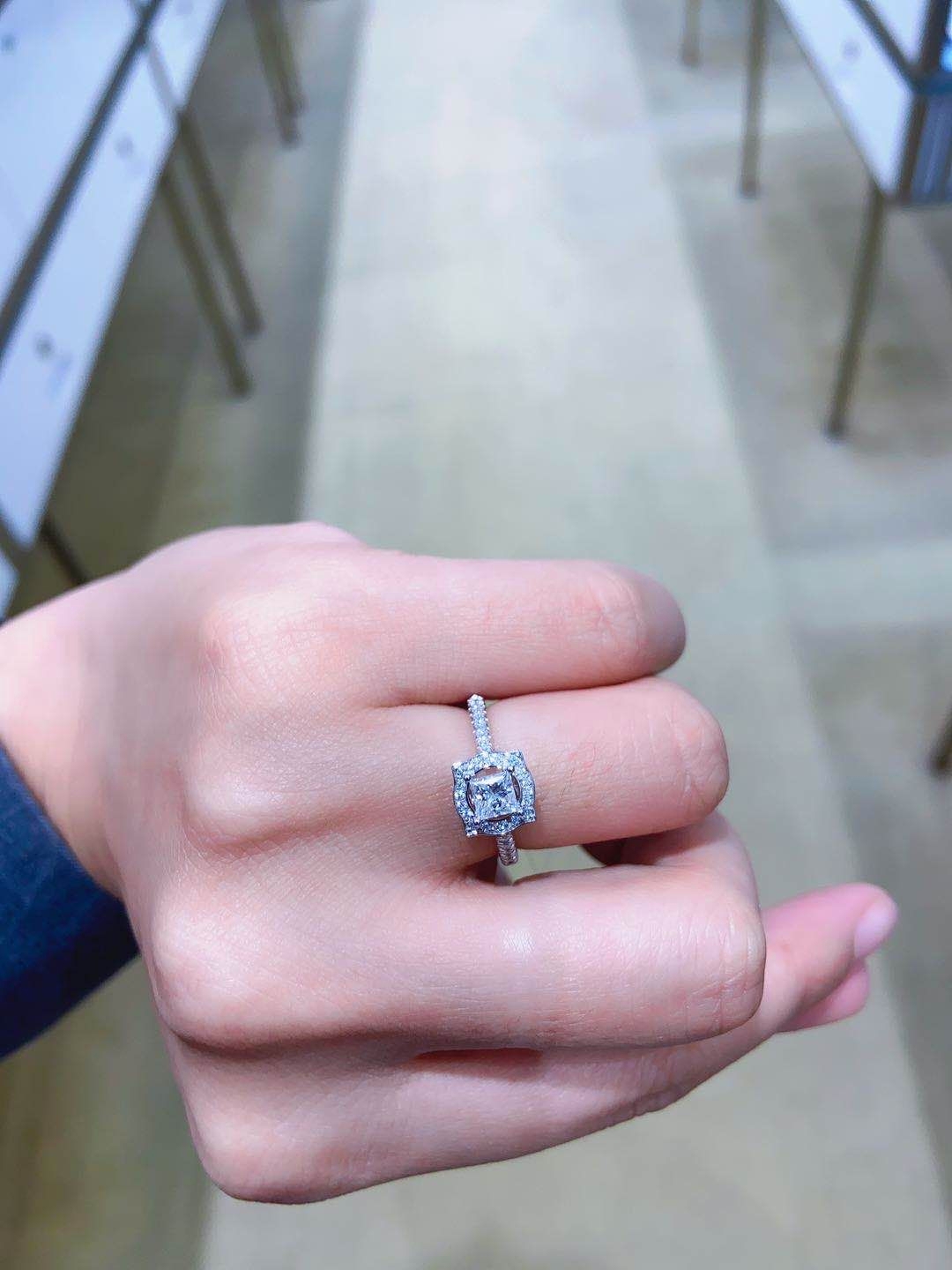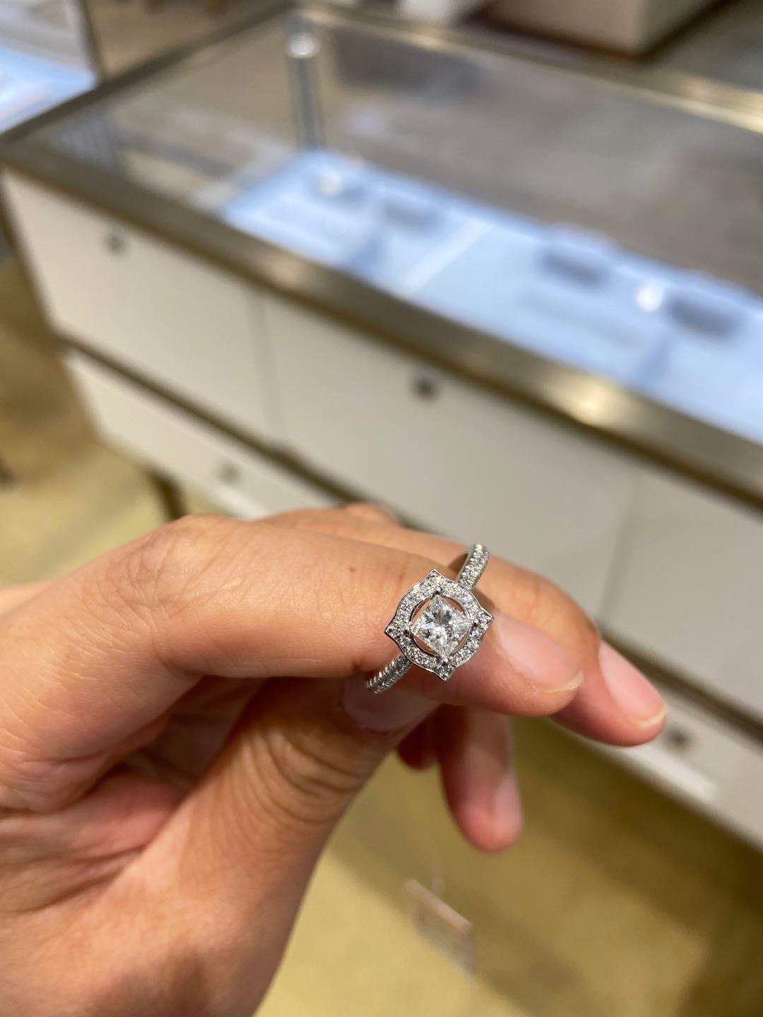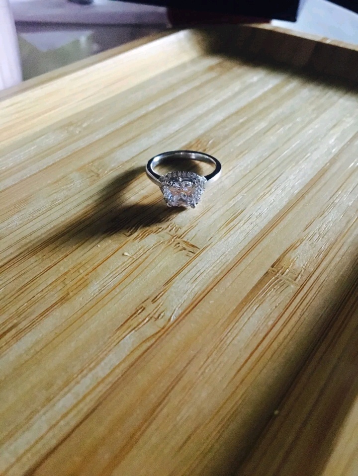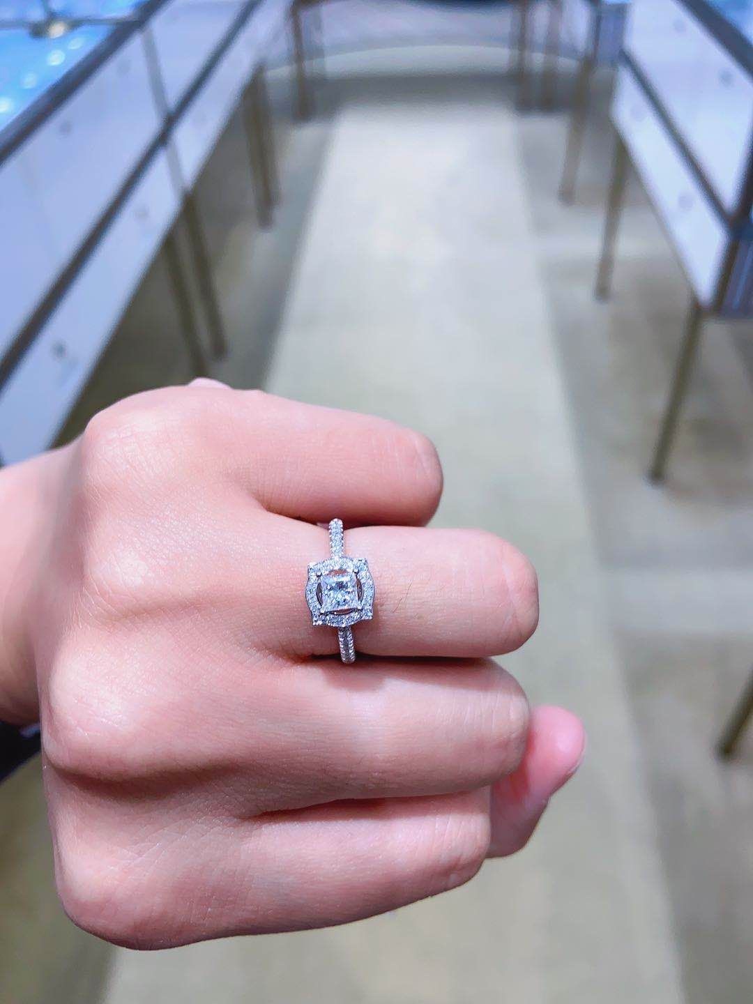 对好看的饰品都毫无抵抗力,这款钻戒,大家猜猜是多少分的呢,超级显大呢,而且不同于外面的圆形钻石,这款是方形的,销售介绍说火彩可以媲美圆形,成品真的很漂亮,就喜欢特别一点的款式