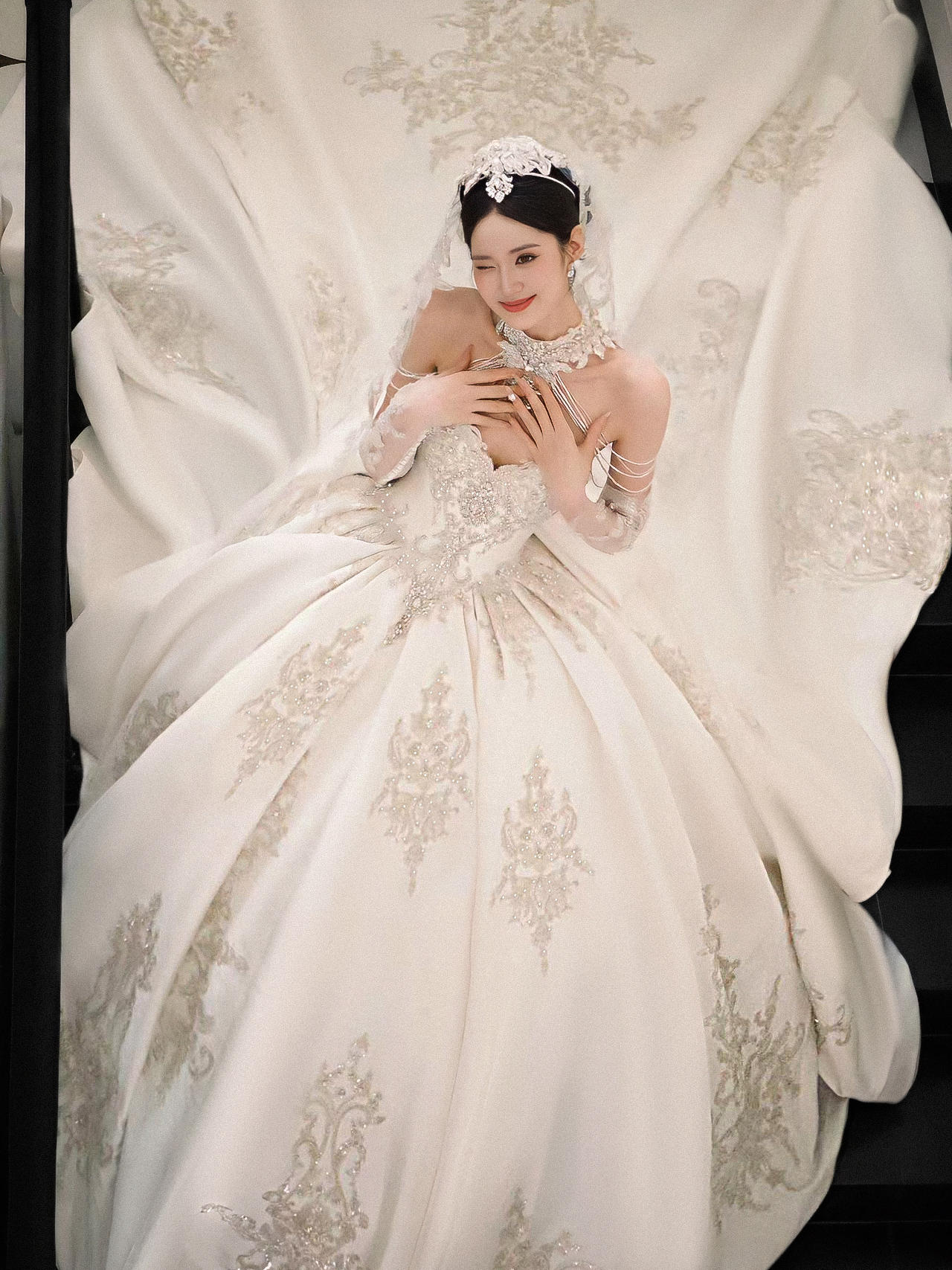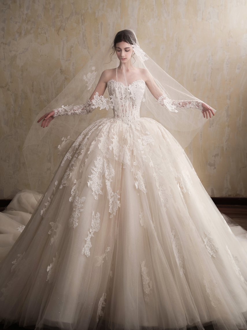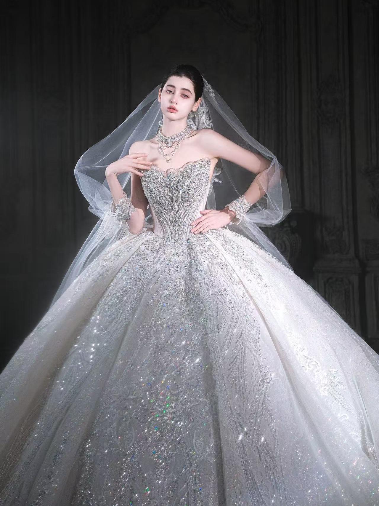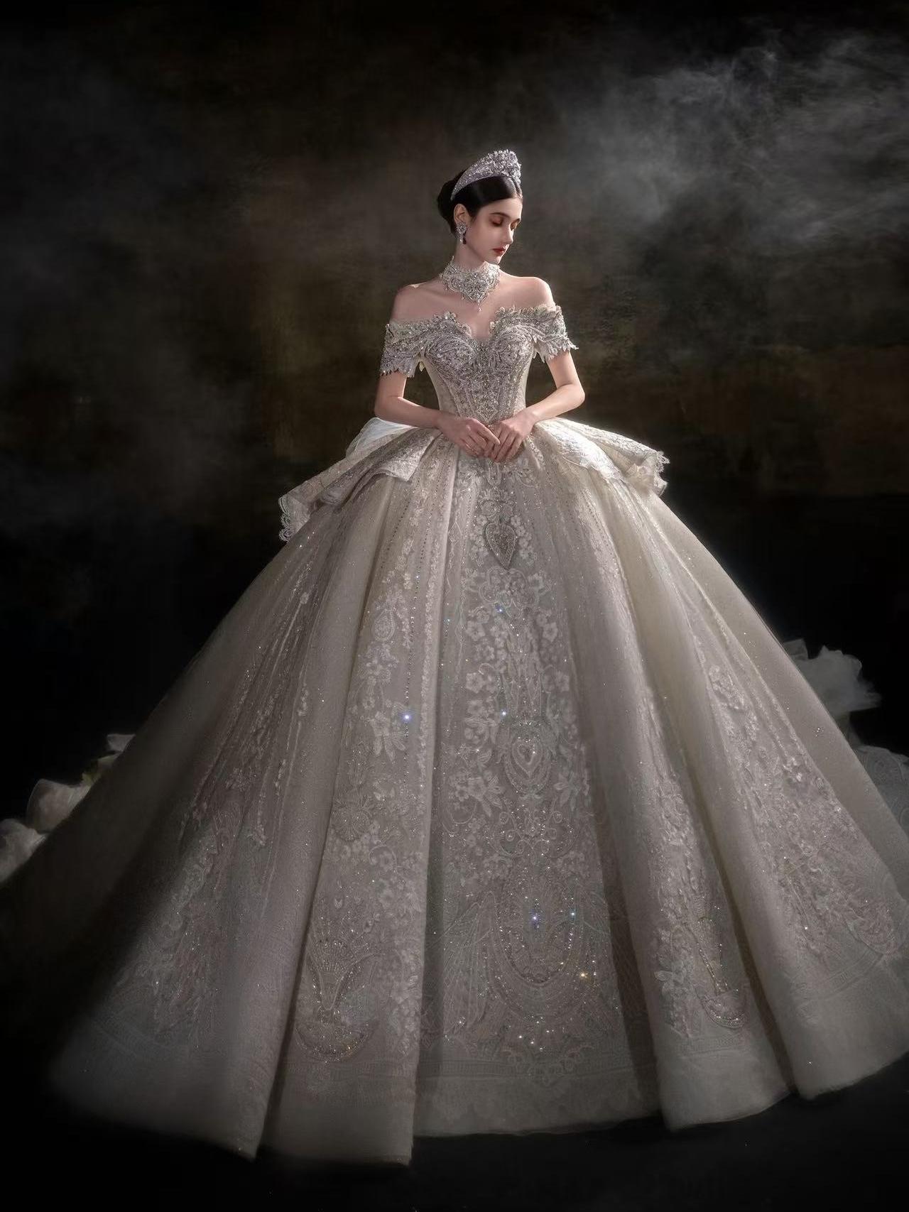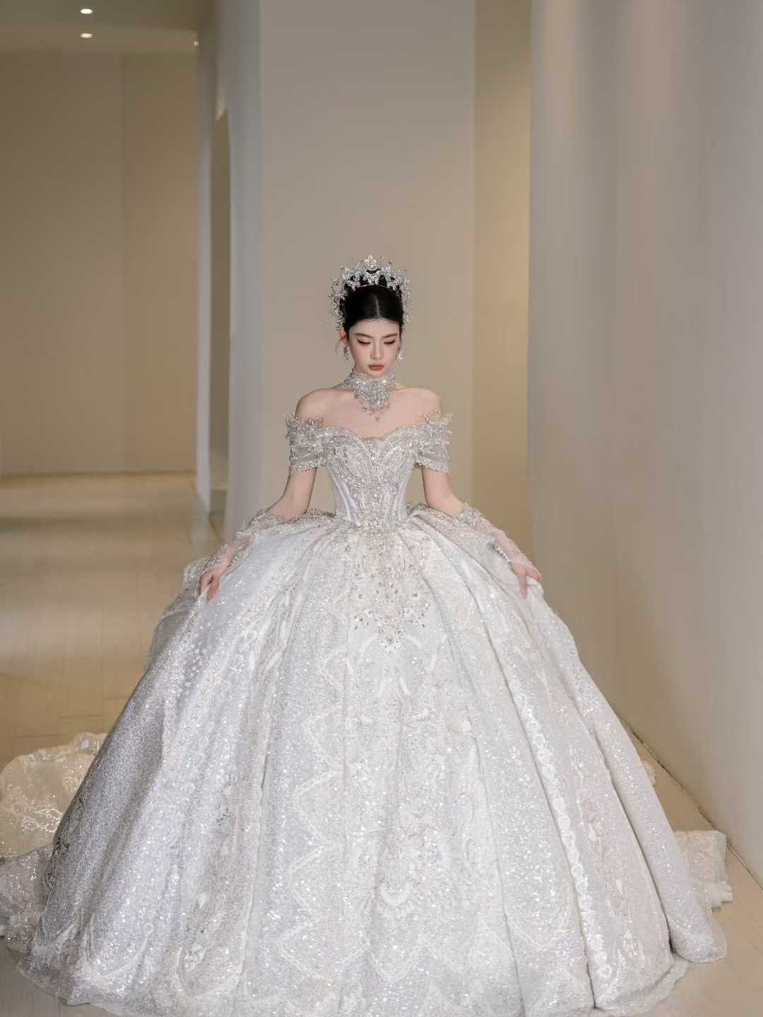 钻石加冕:一字肩闪钻宫廷拖尾婚纱