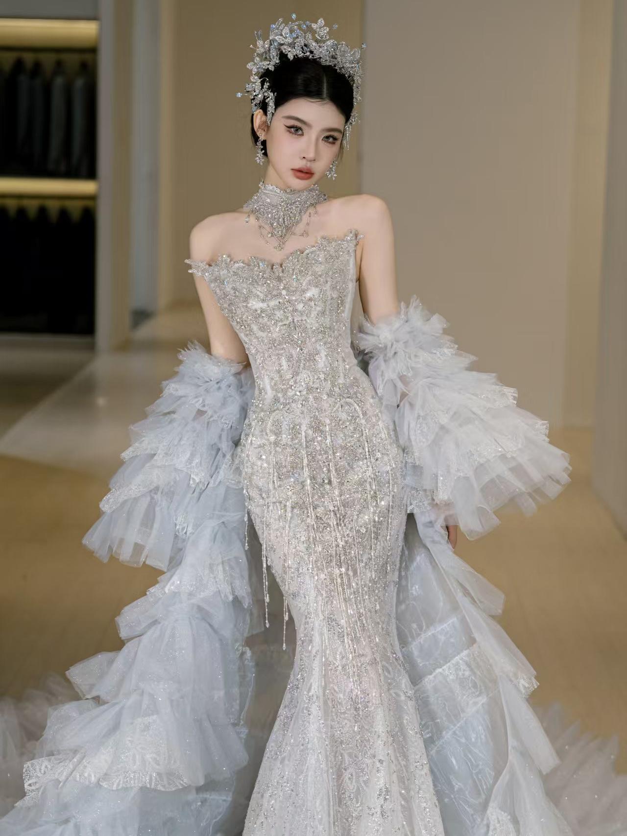 银闪人鱼婚纱:羽袖缀钻