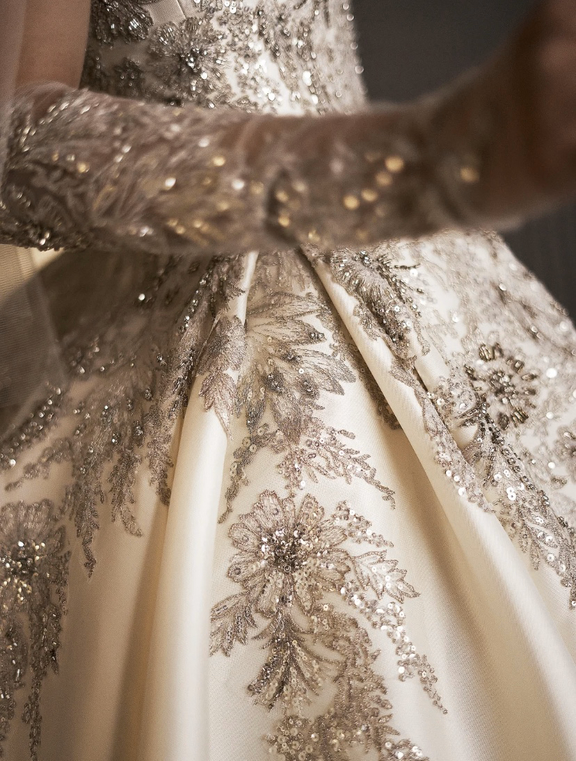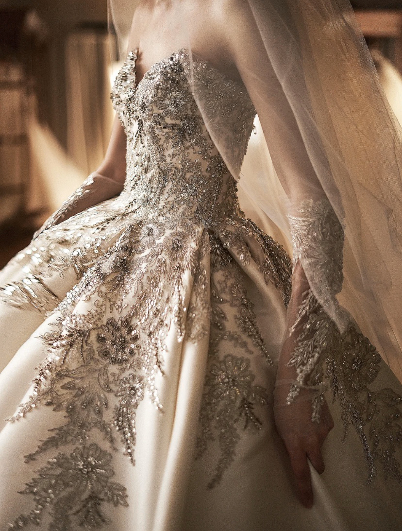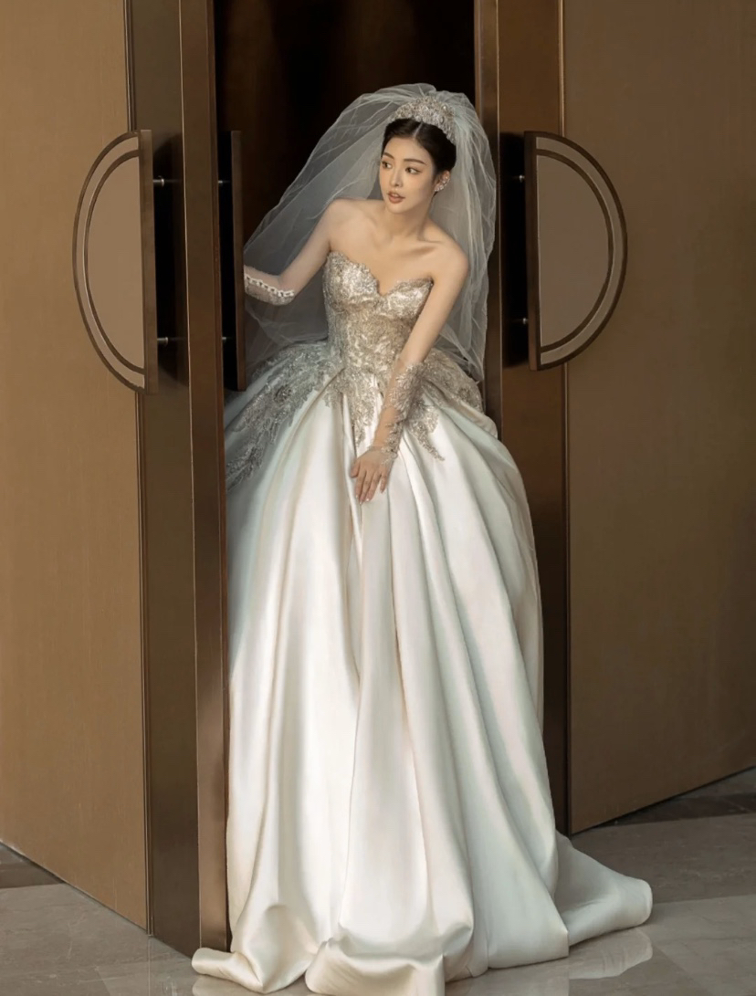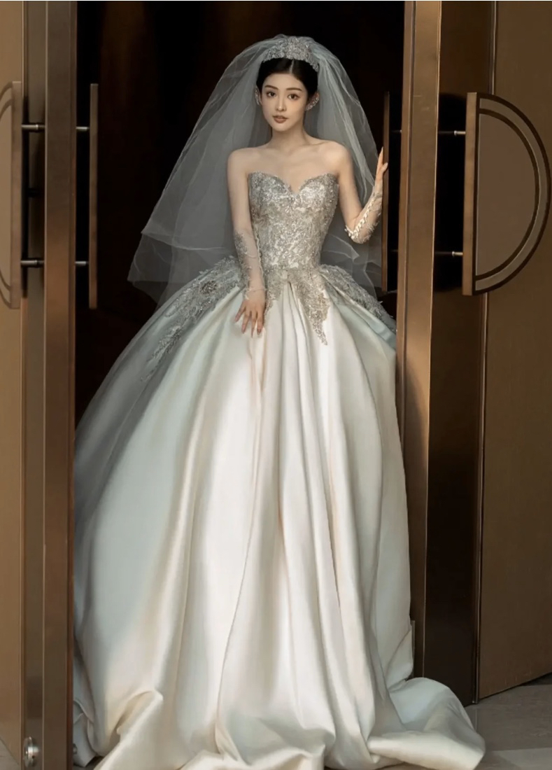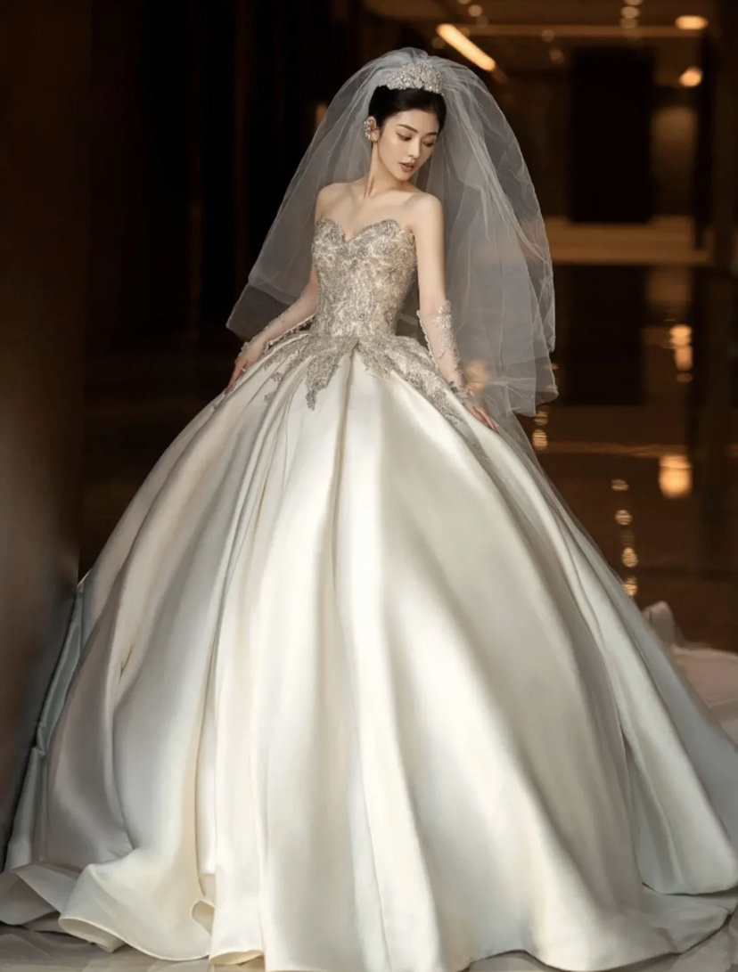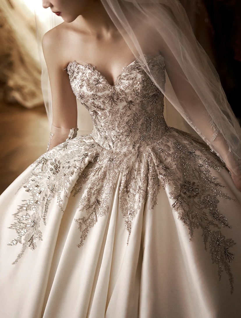 鎏金幻昼缎面钉珠蕾丝大拖尾主婚纱