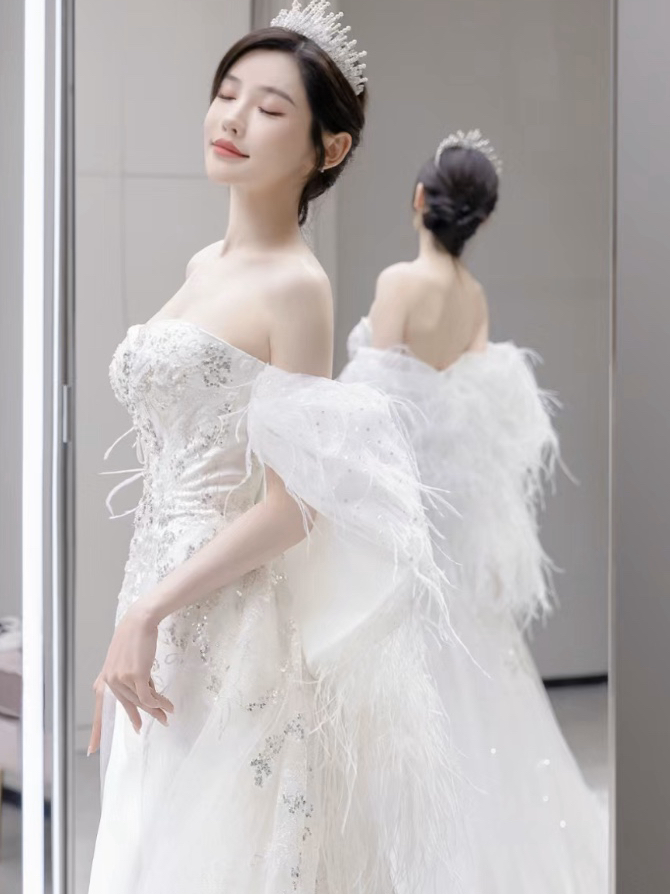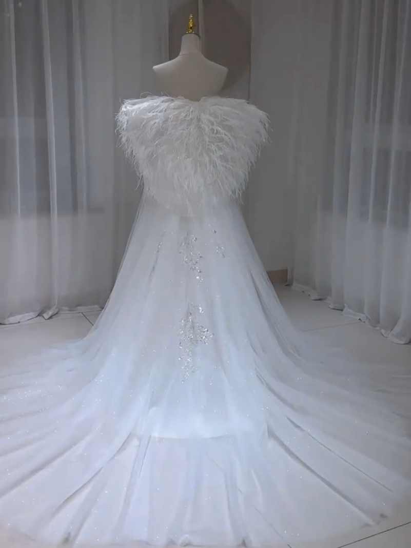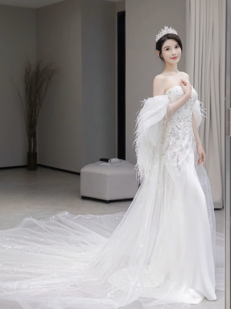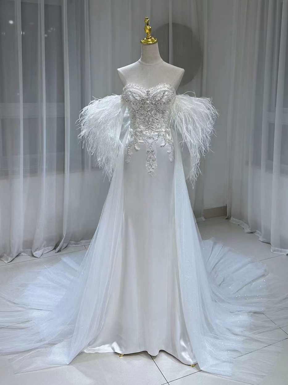 天使翅膀鸵鸟羽毛缎面钉珠鱼尾婚纱