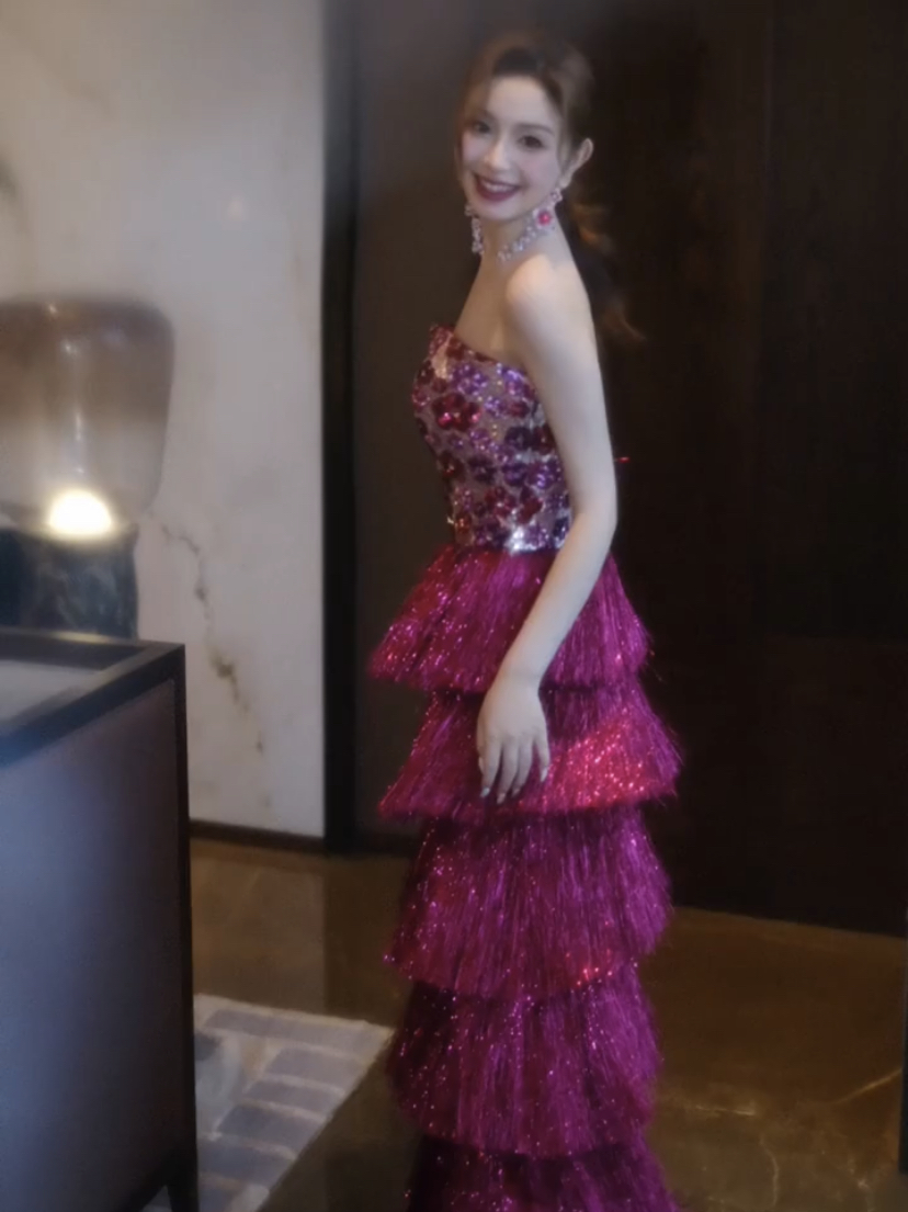 玫红鎏金抹胸流苏鱼尾蛋糕裙礼服