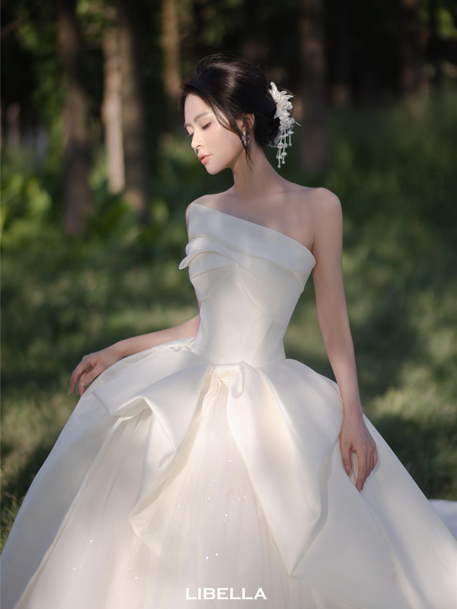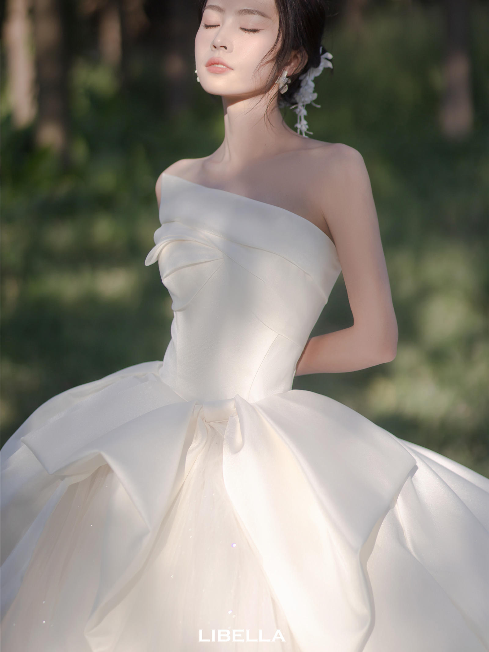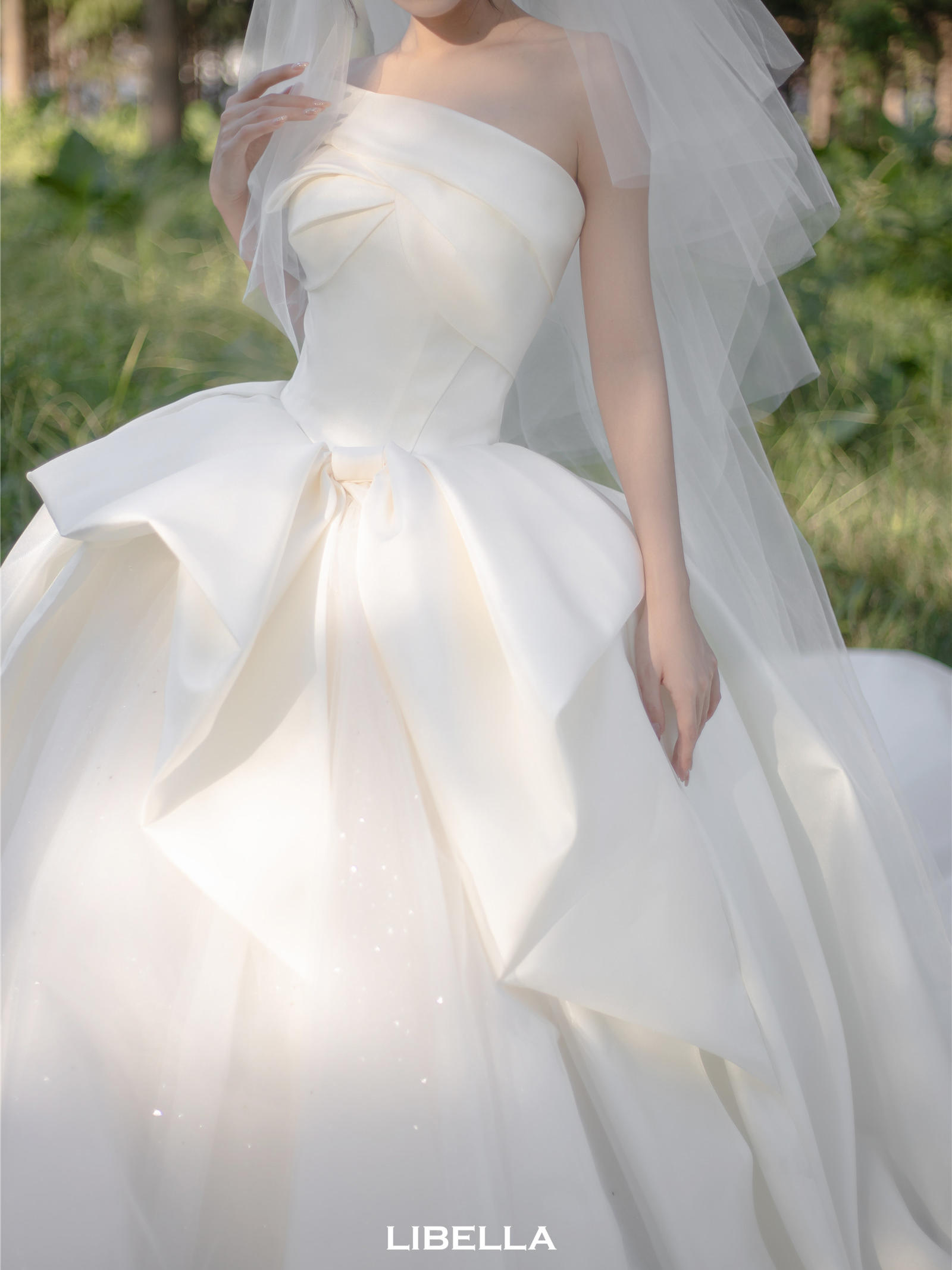 LIBELLA丨一字肩缎面迎宾纱