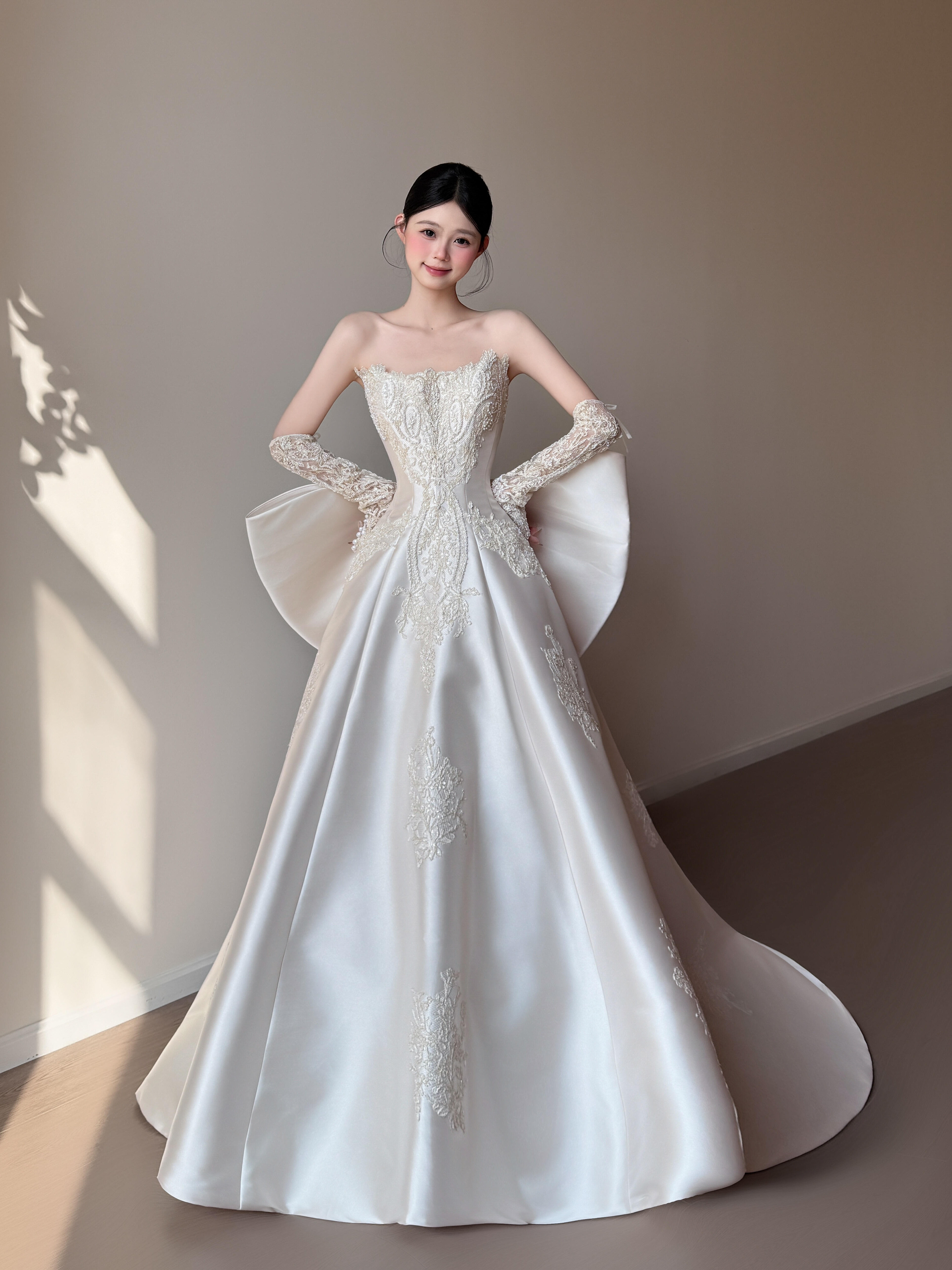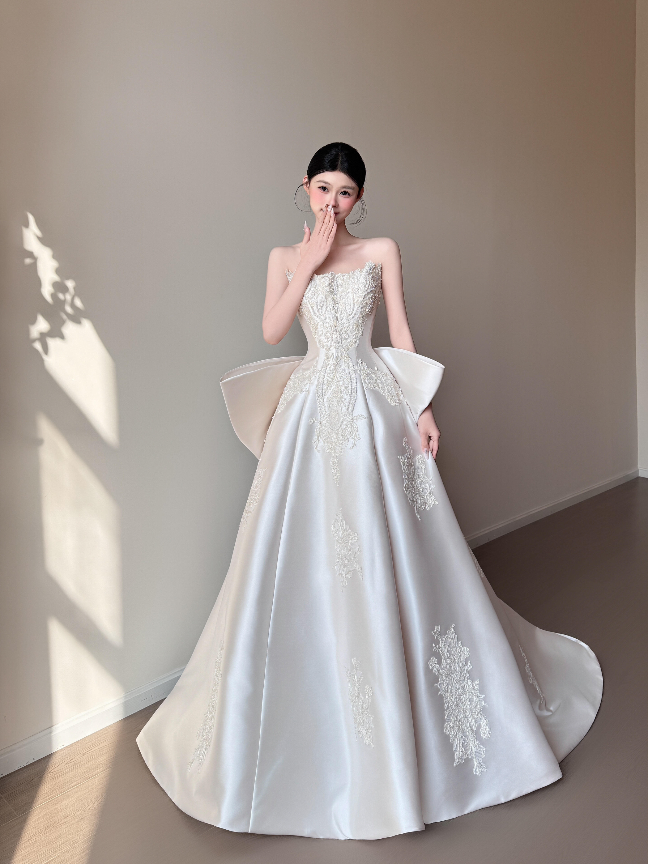 抹胸/一字肩两穿缎面婚纱「浅云」