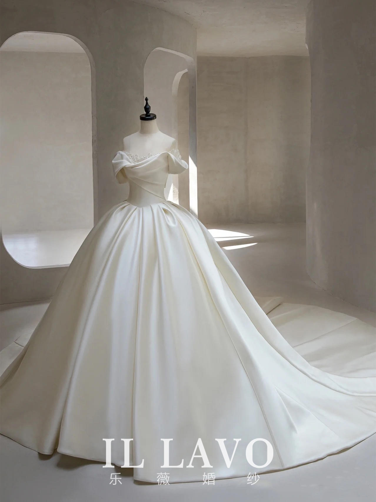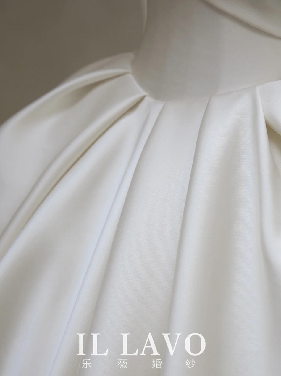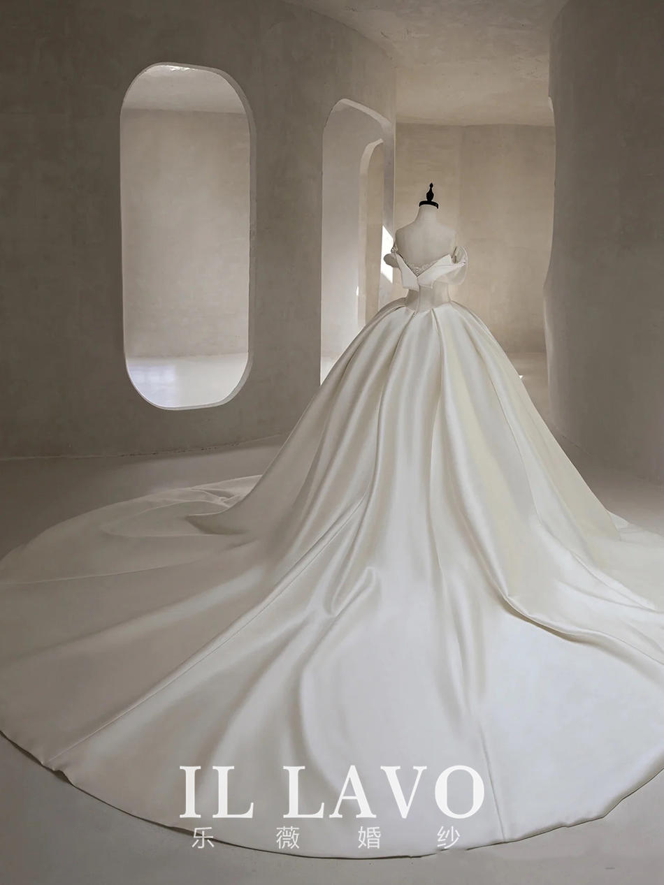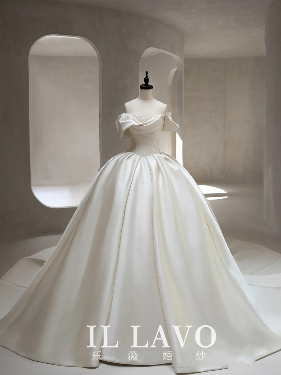 「凝脂」一字肩缎面文艺风拖尾婚纱