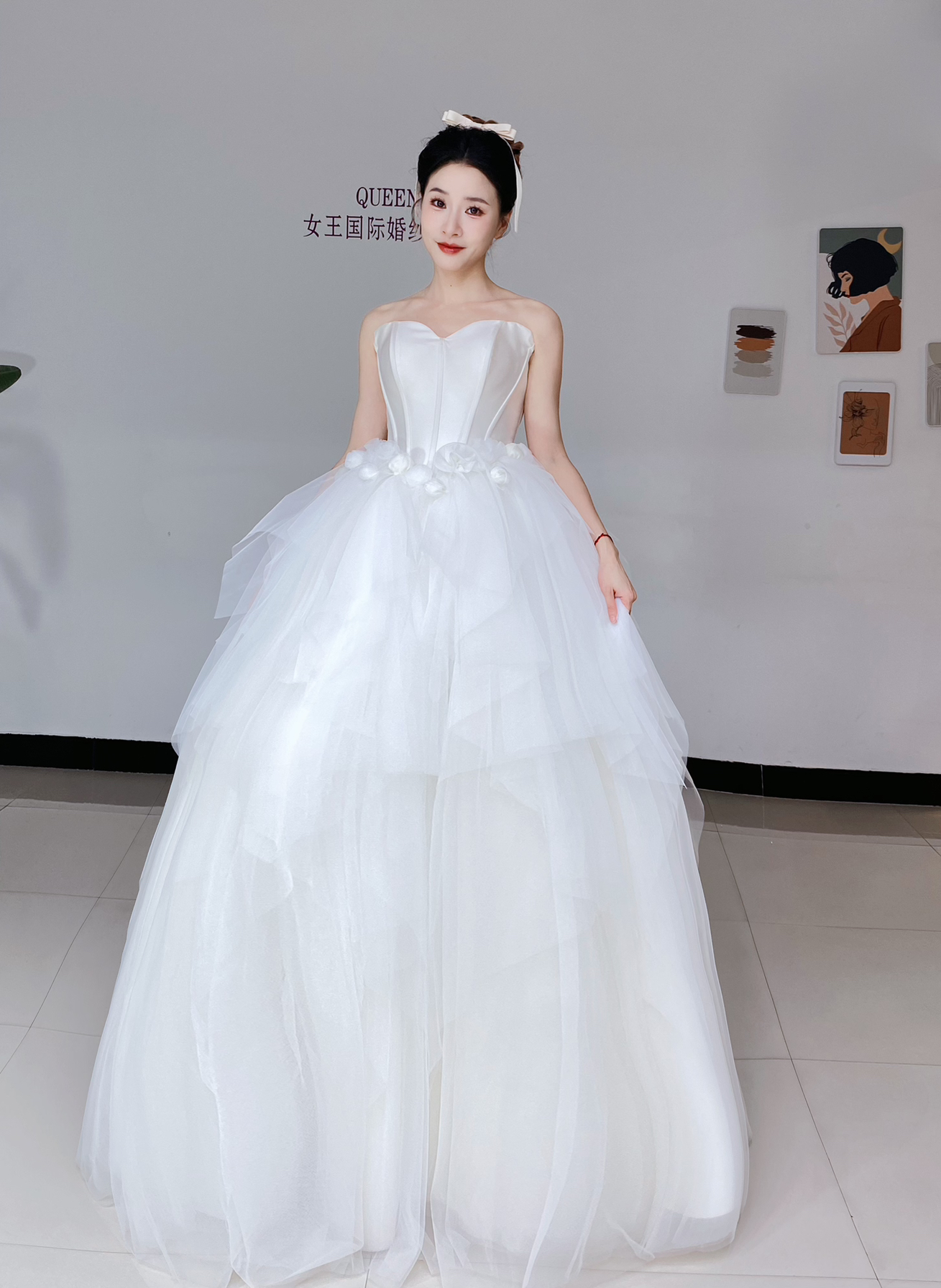 抹胸花朵齐地婚纱