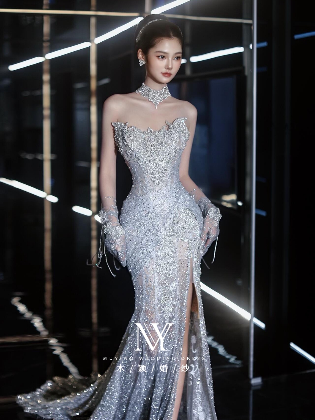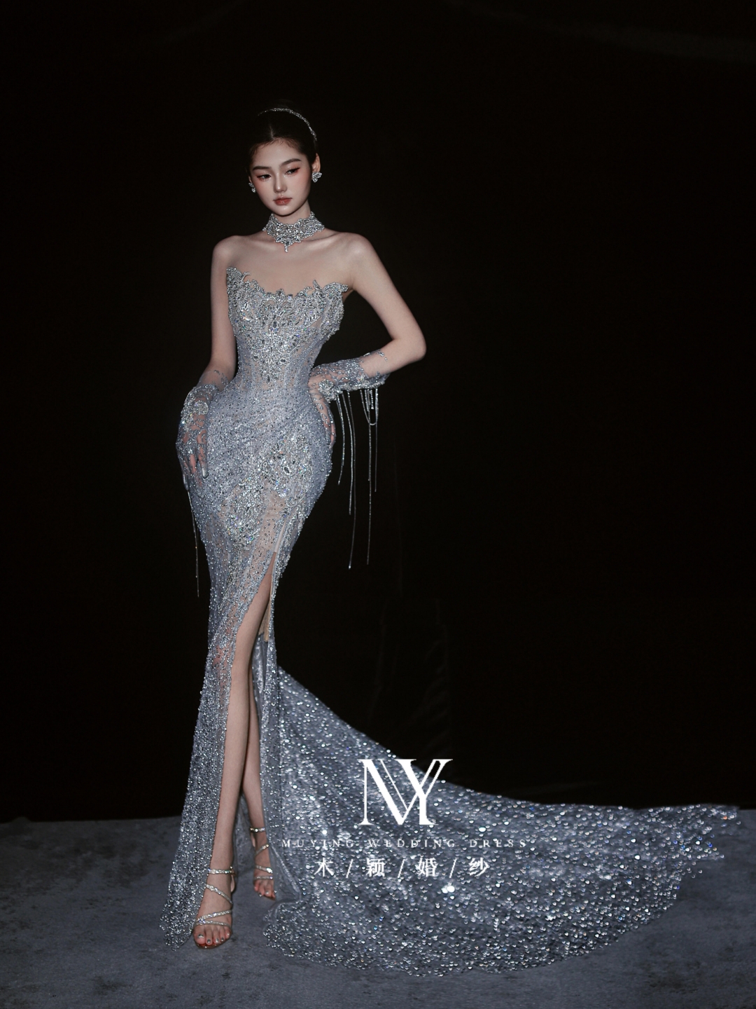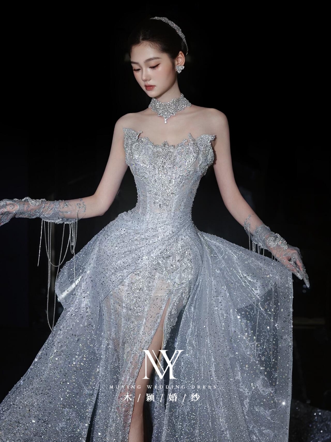 银色爆闪一字肩v领长拖尾主纱