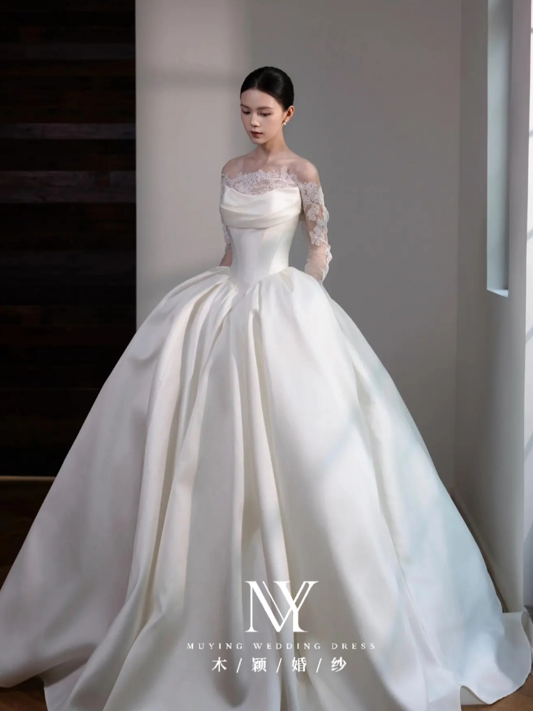 长袖蕾丝缎面长拖尾主纱
