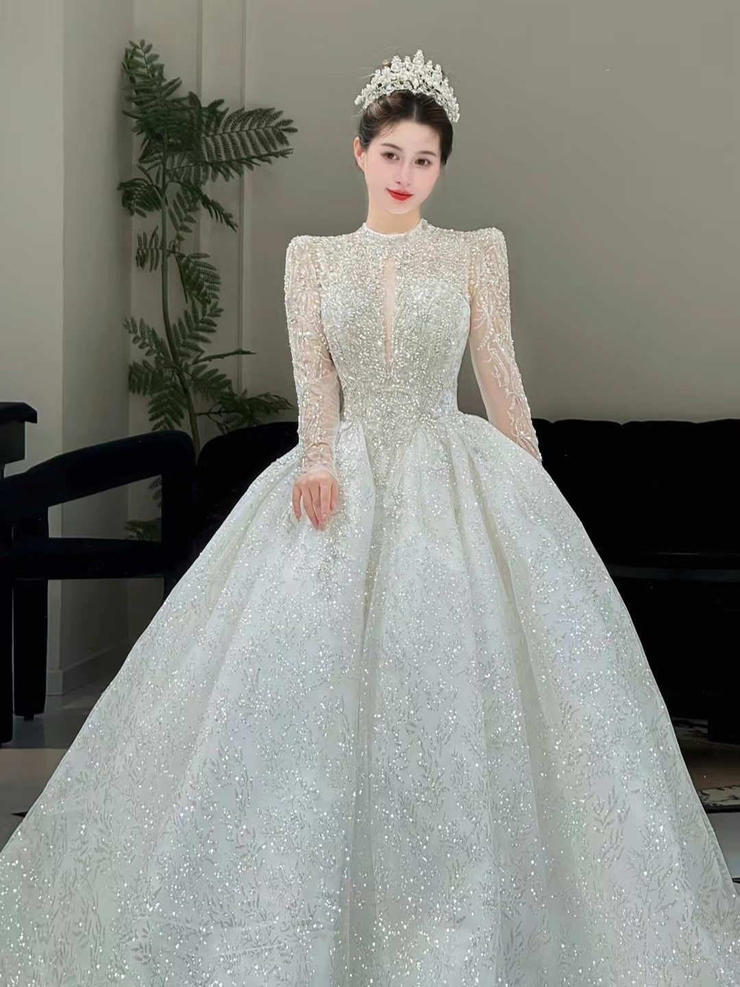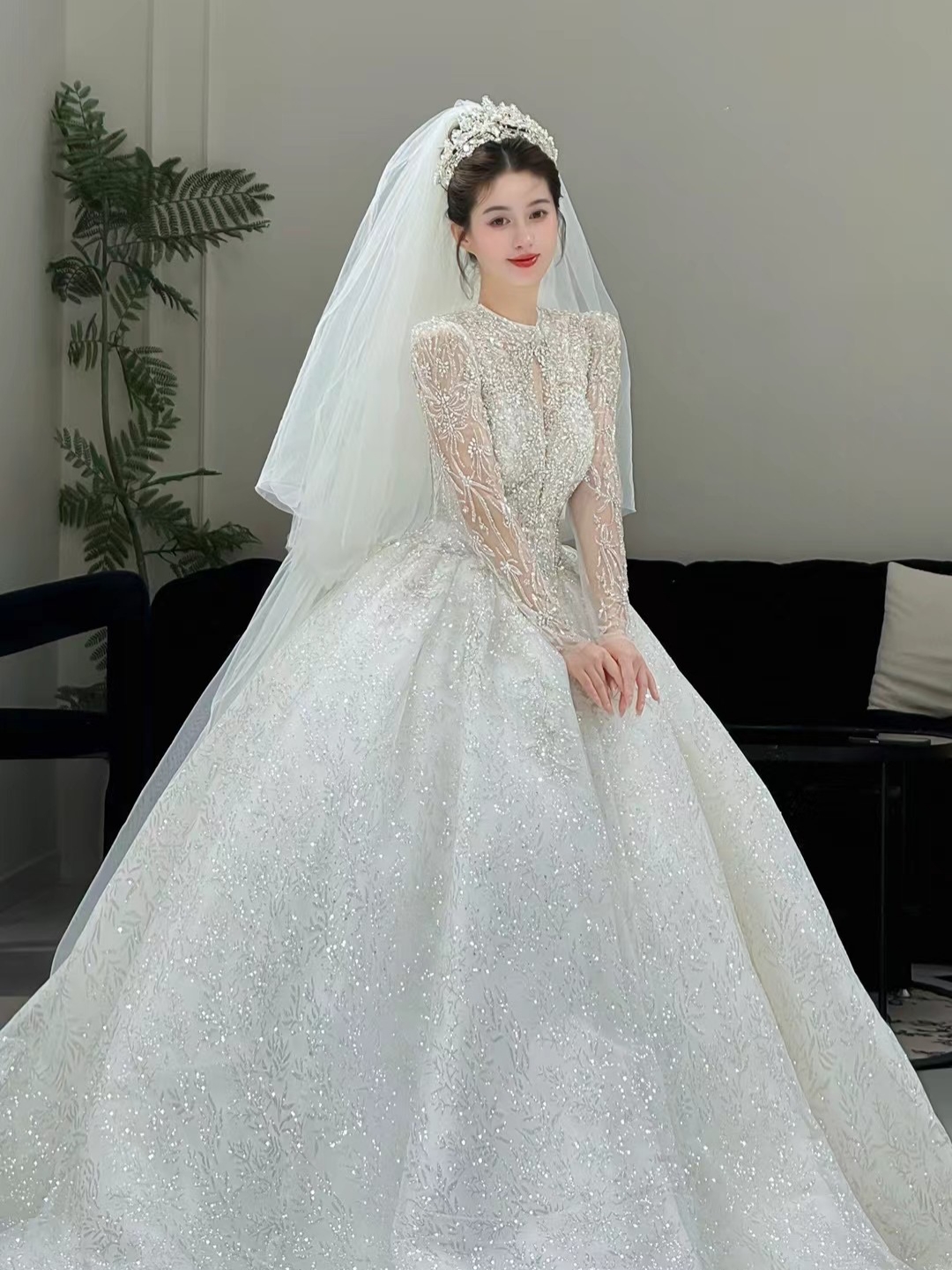 精致推荐/气质长袖/闪闪拖尾纱