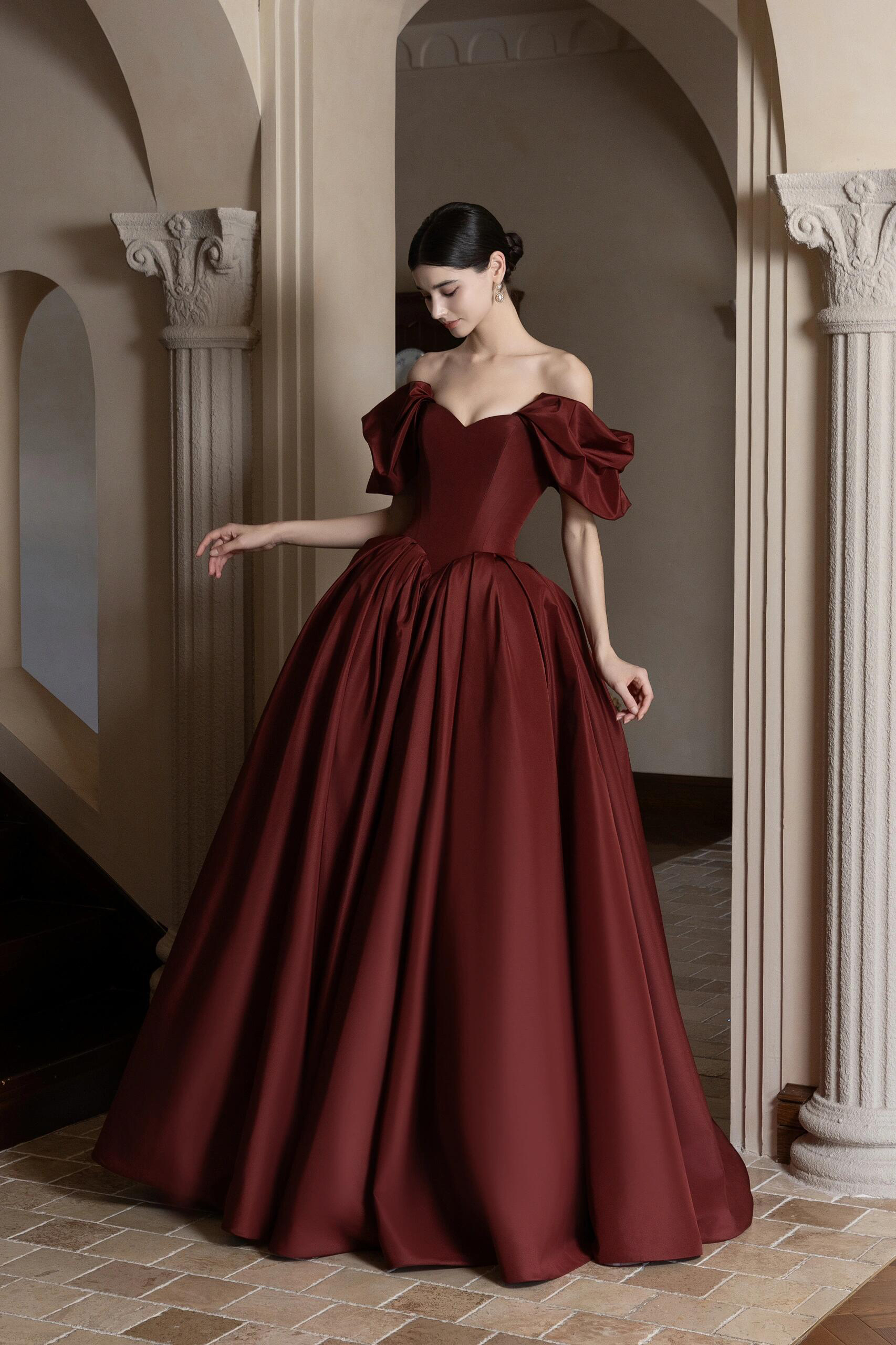 显白神器 !酒红色抹胸礼服