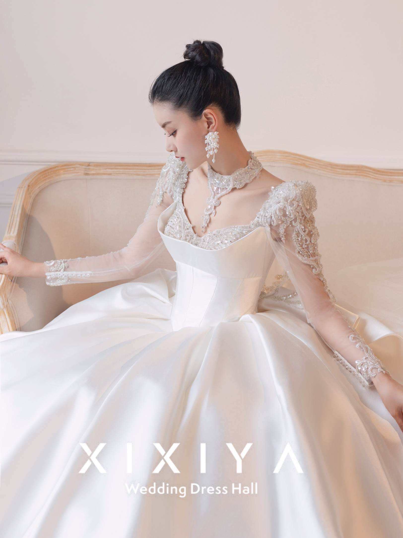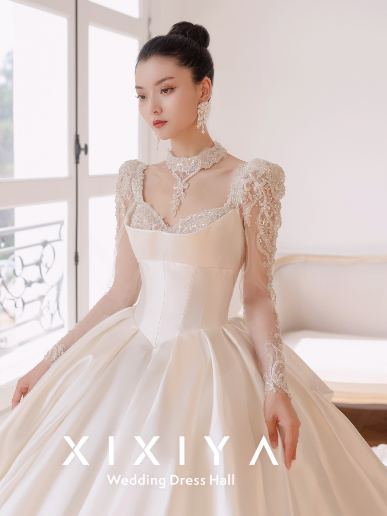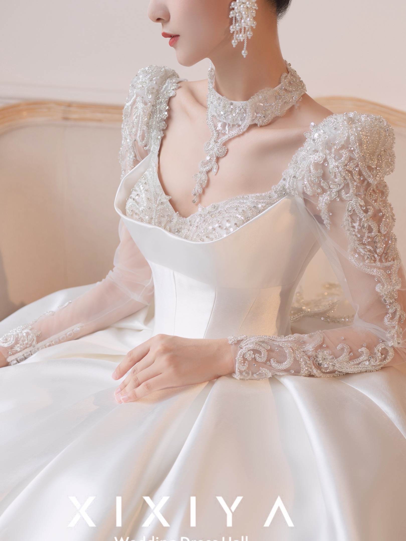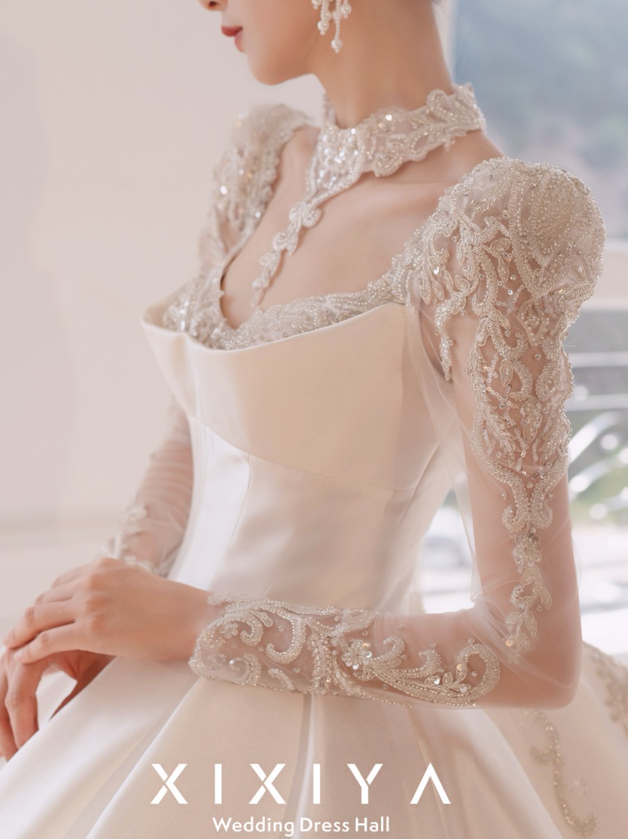 长袖气质缎面婚纱 白皇后