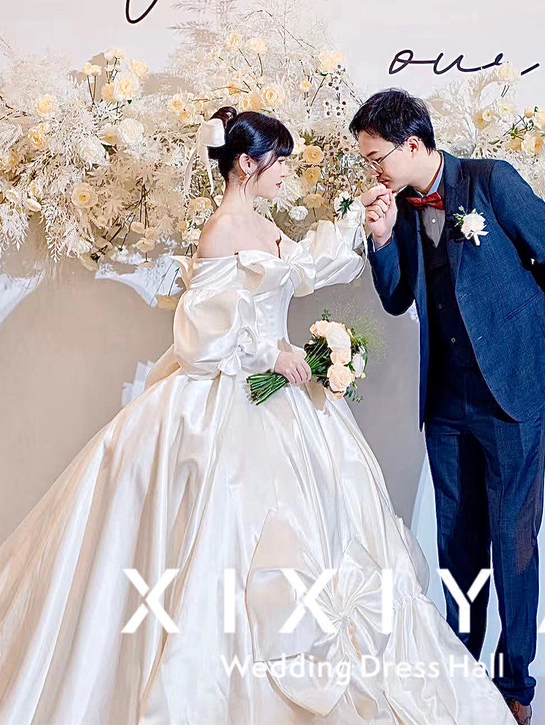 长袖气质缎面婚纱 白皇后