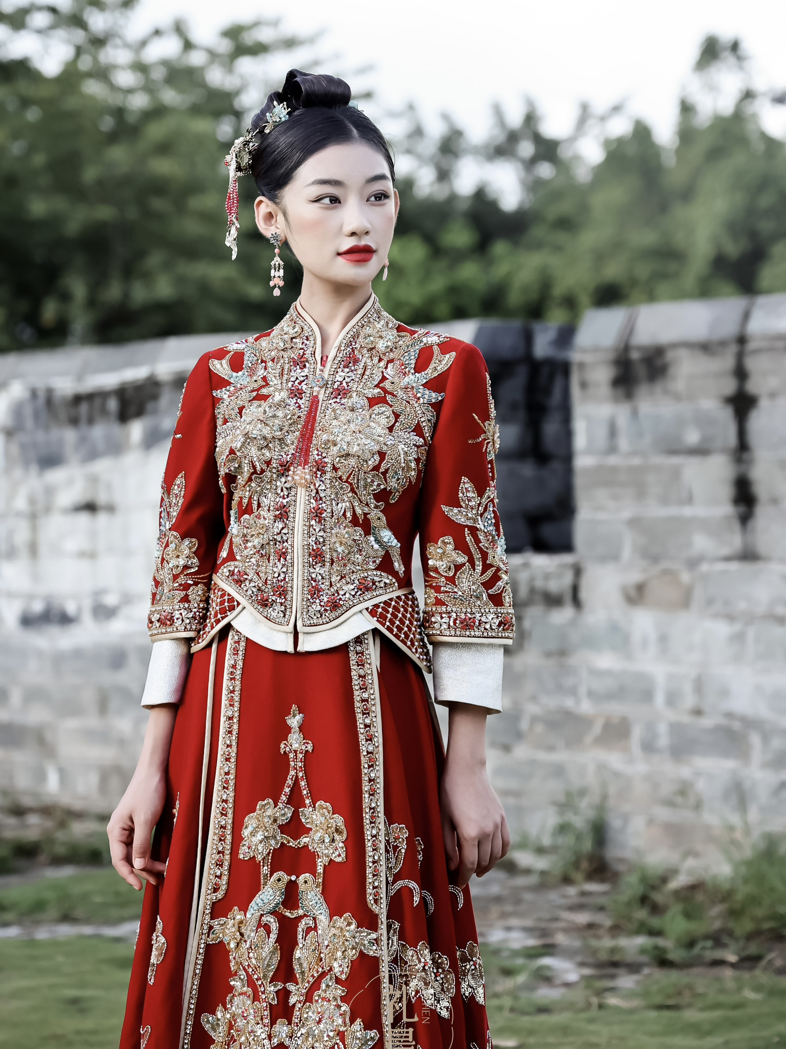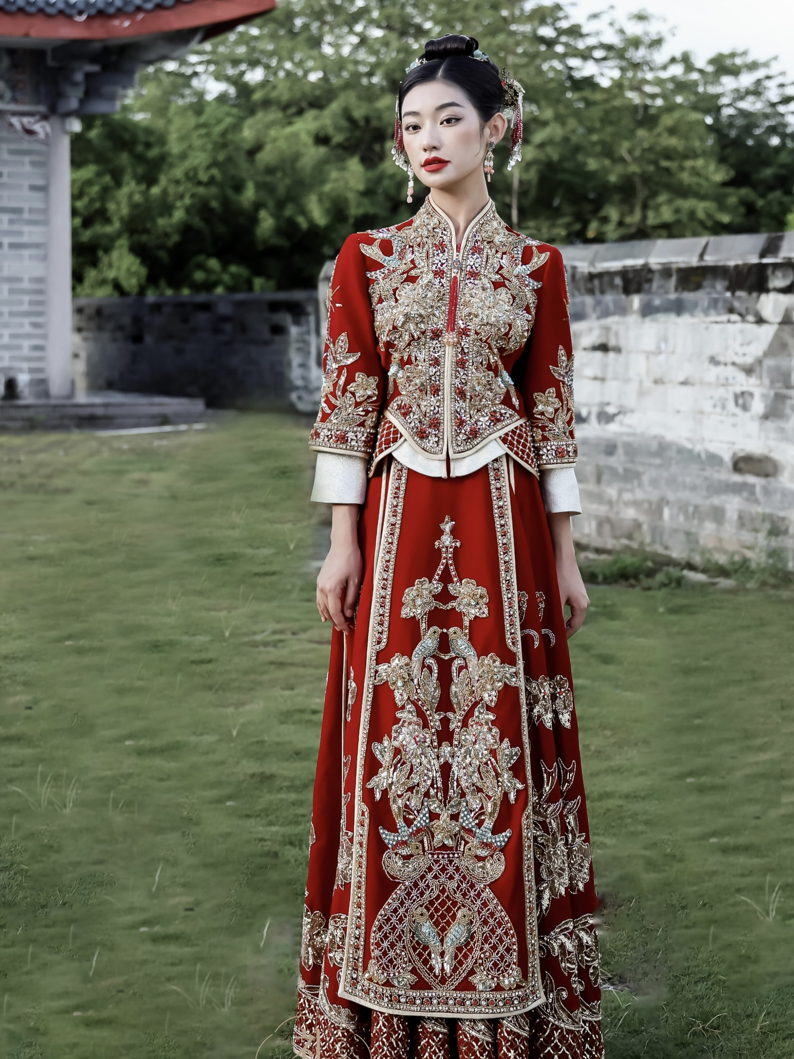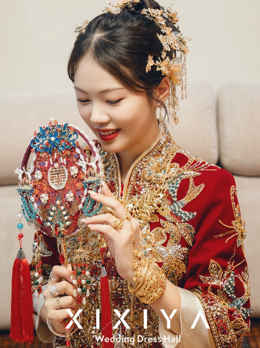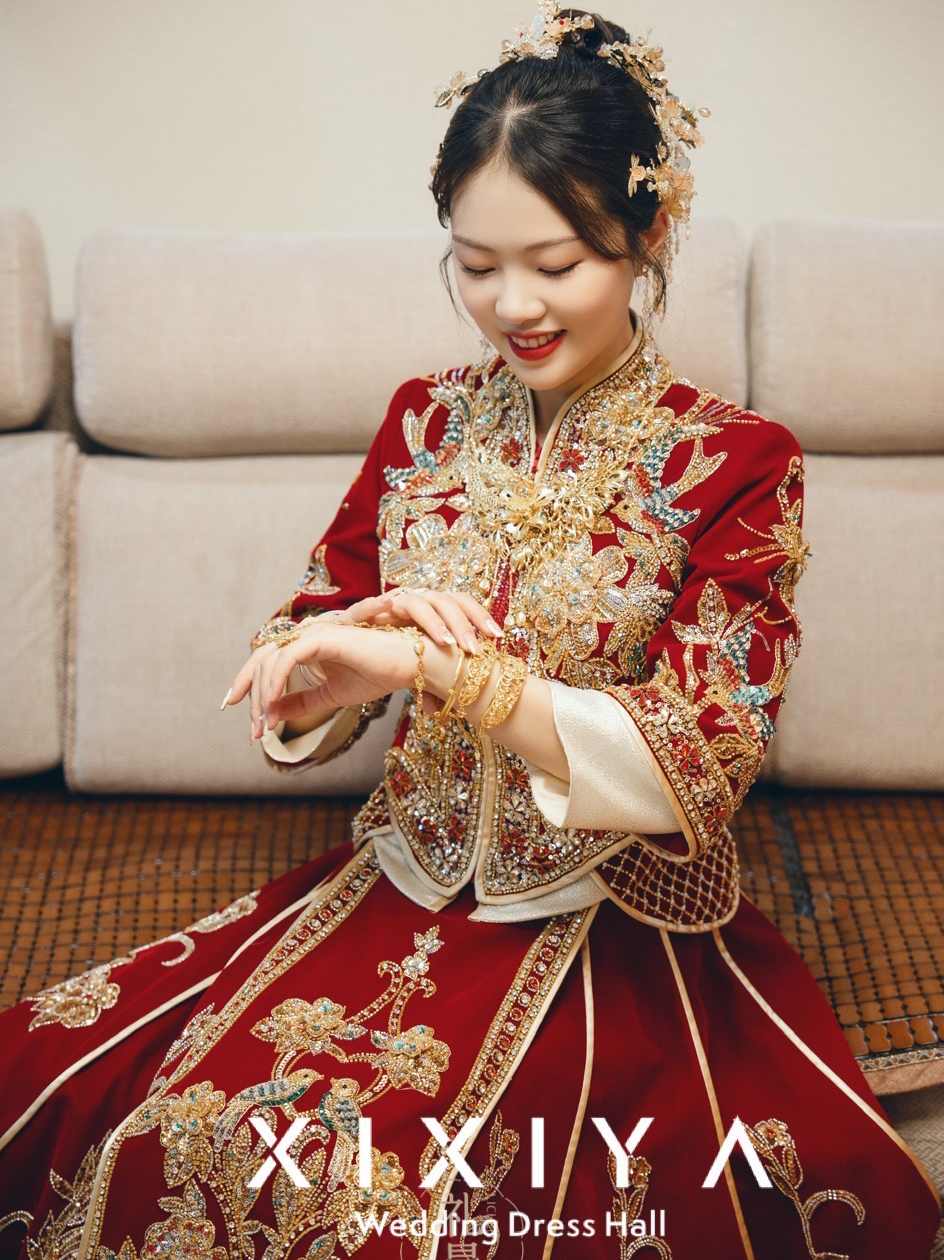 红色重工钉珠丝绒出门中式秀禾