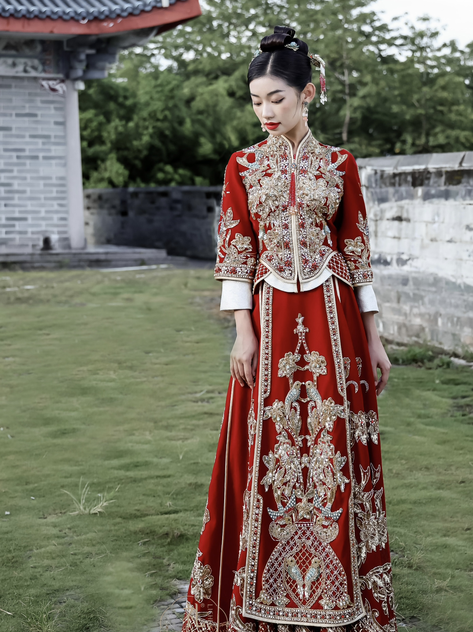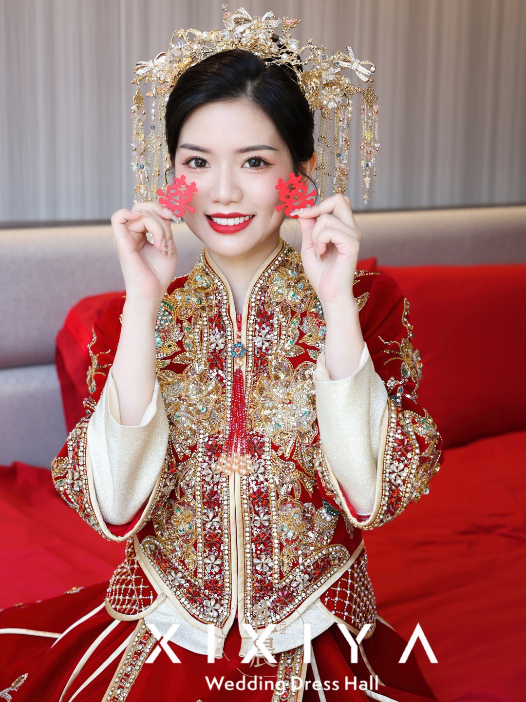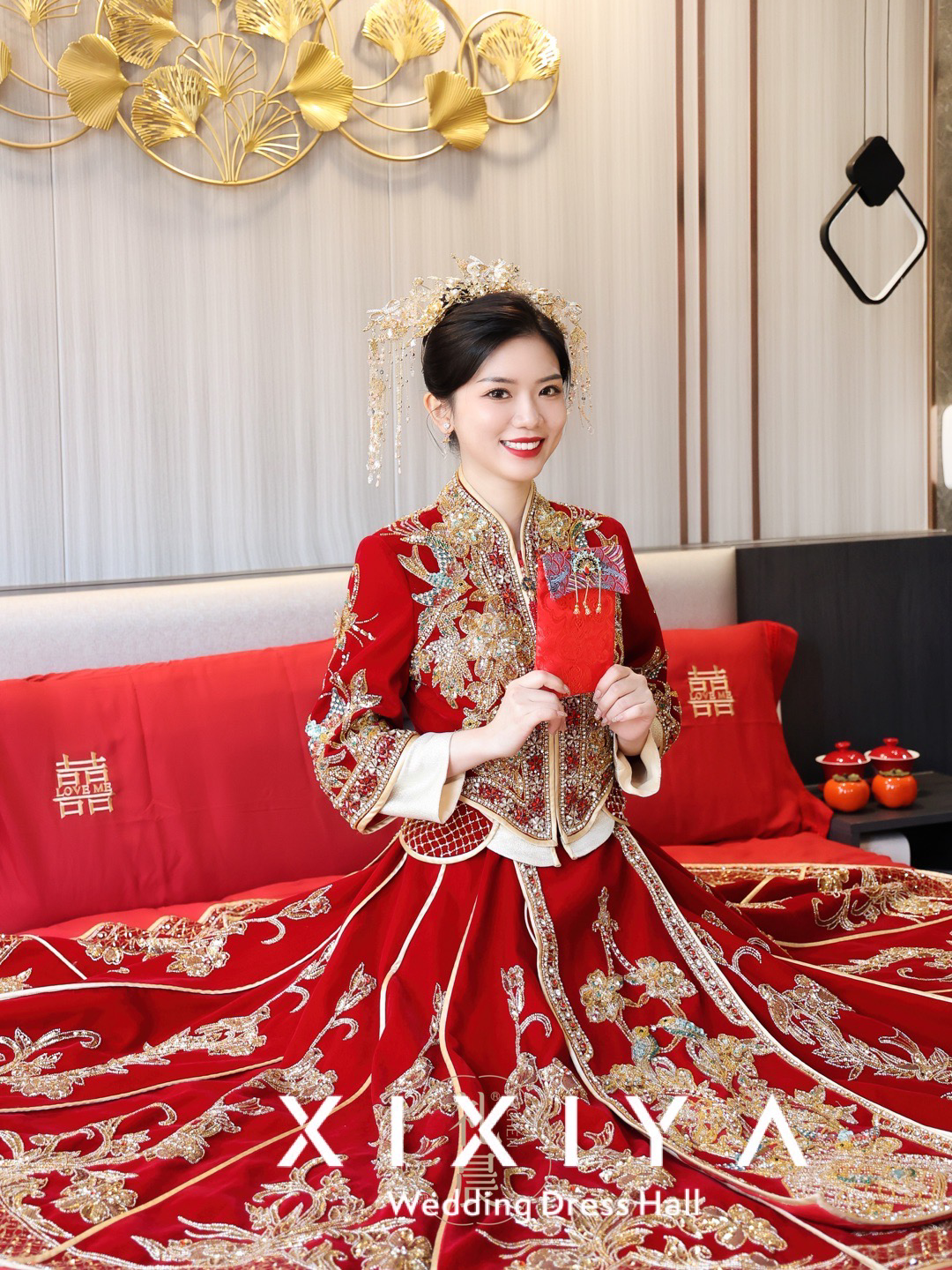 红色重工钉珠丝绒出门中式秀禾