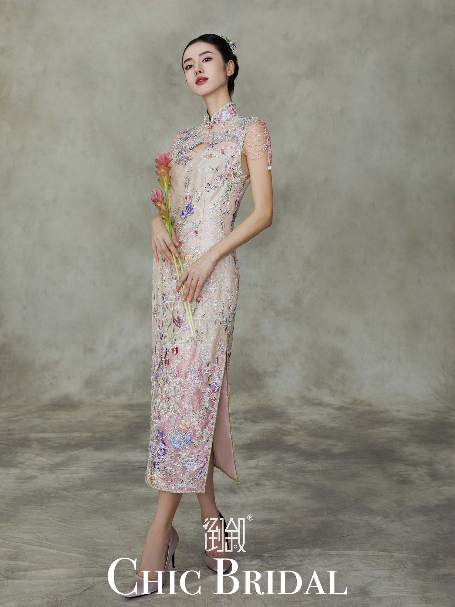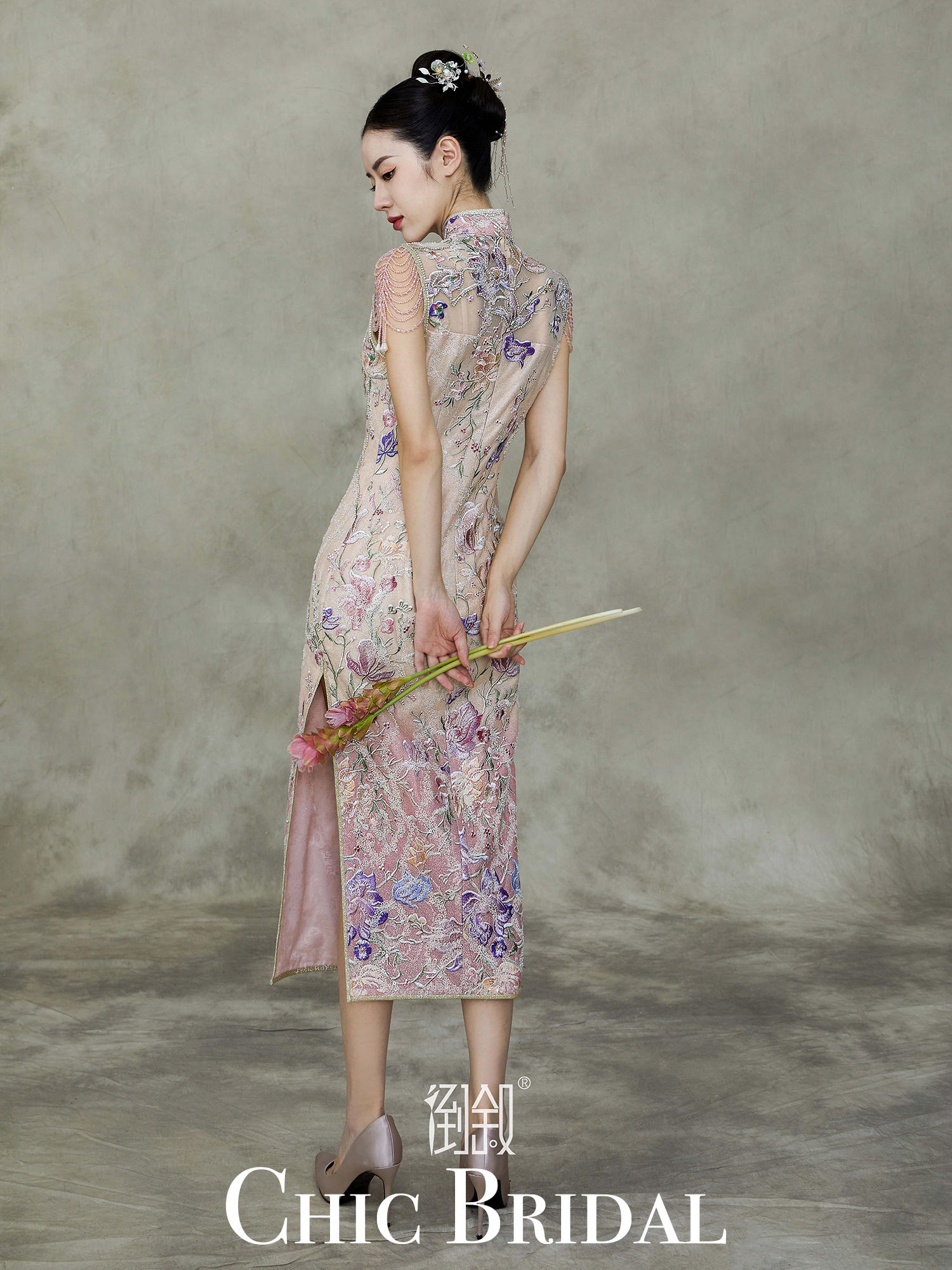 镂空珠绣珠串袖旗袍