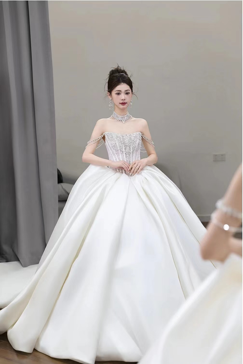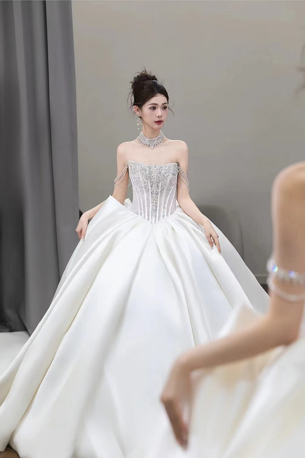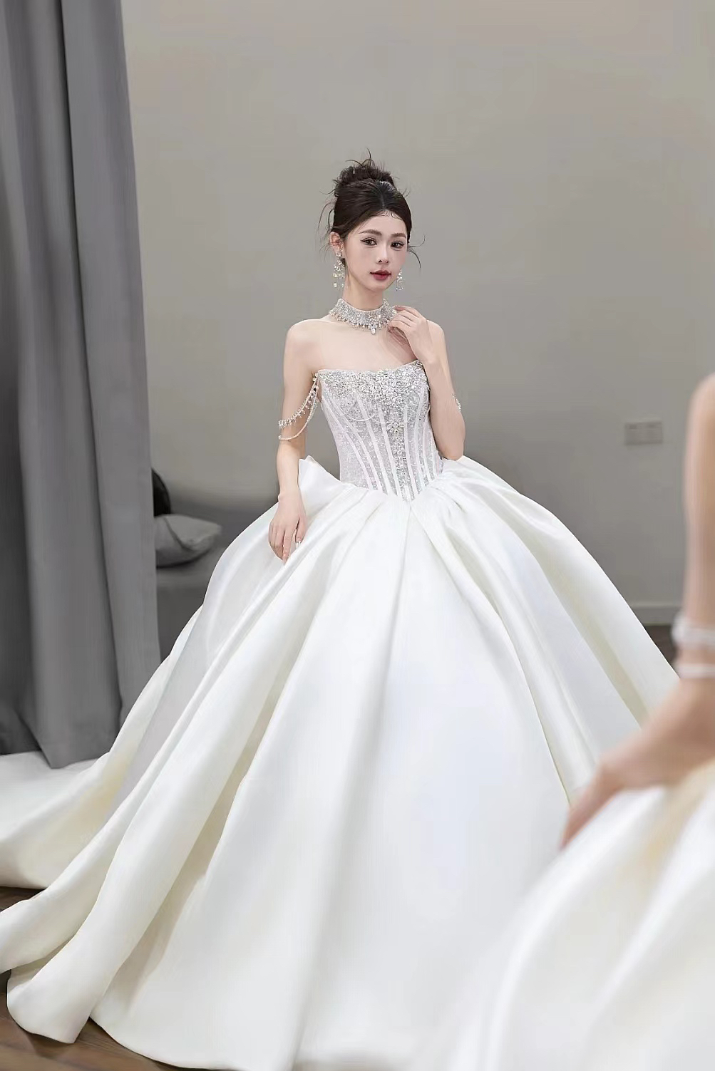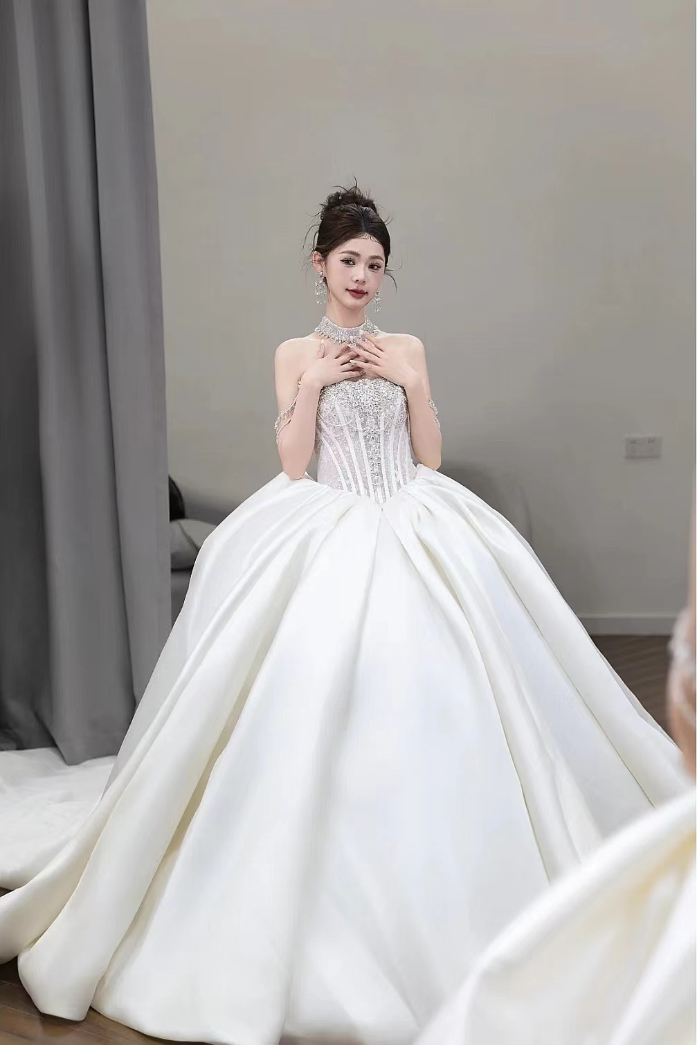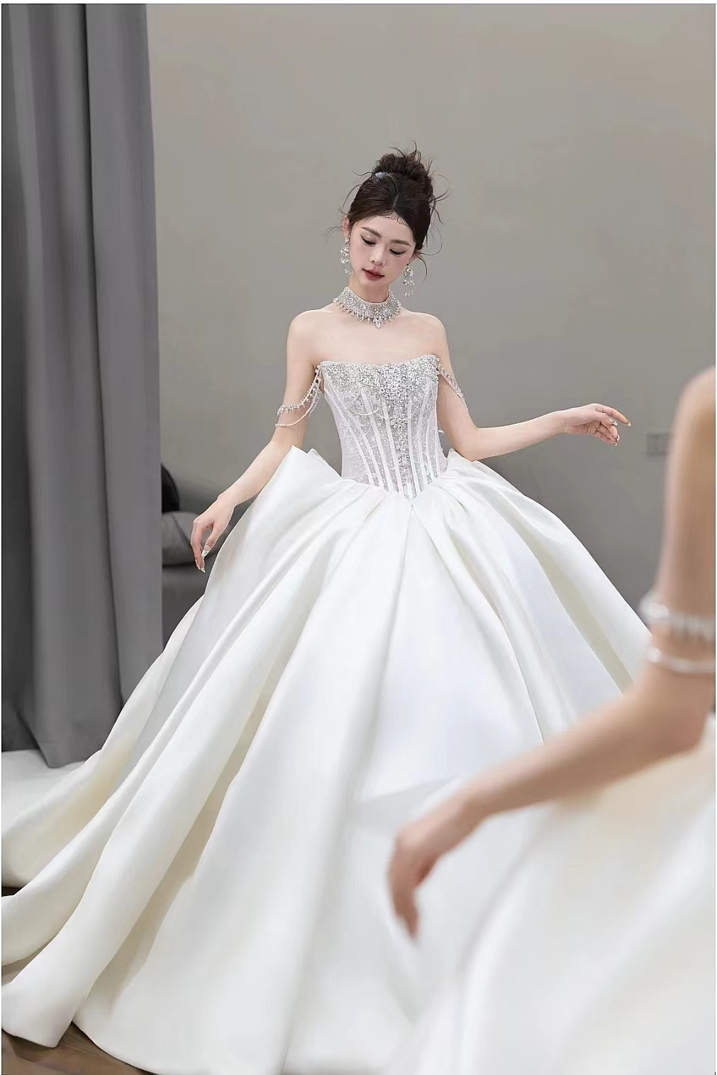 抹胸缎纱拖尾主纱