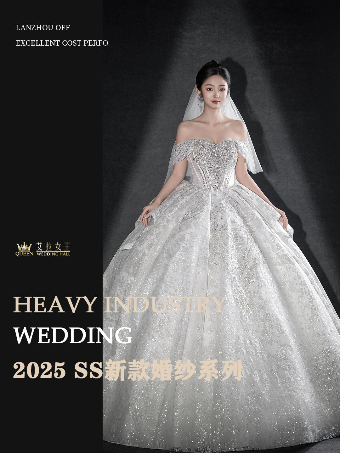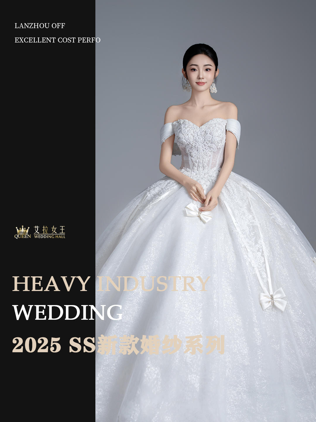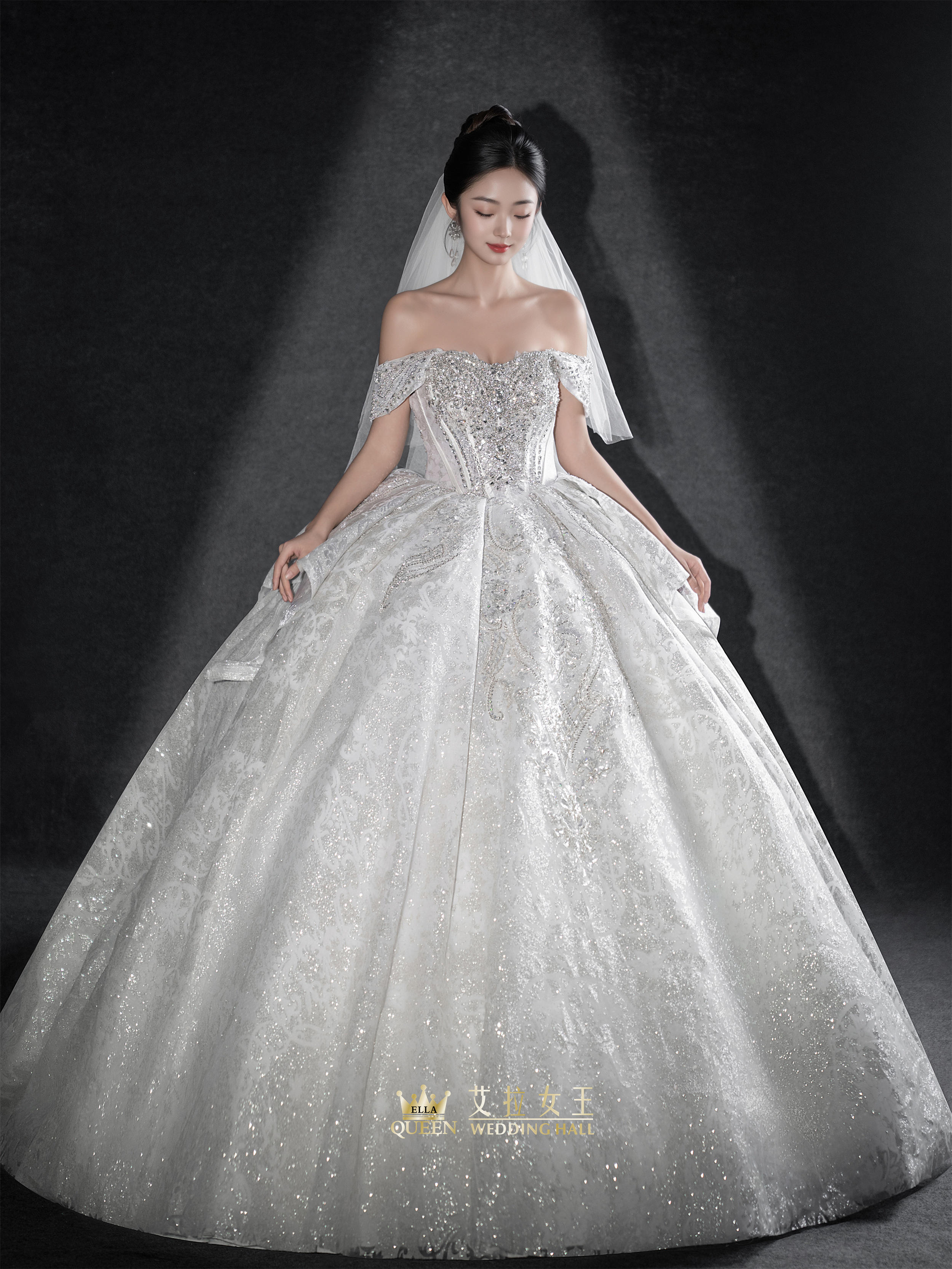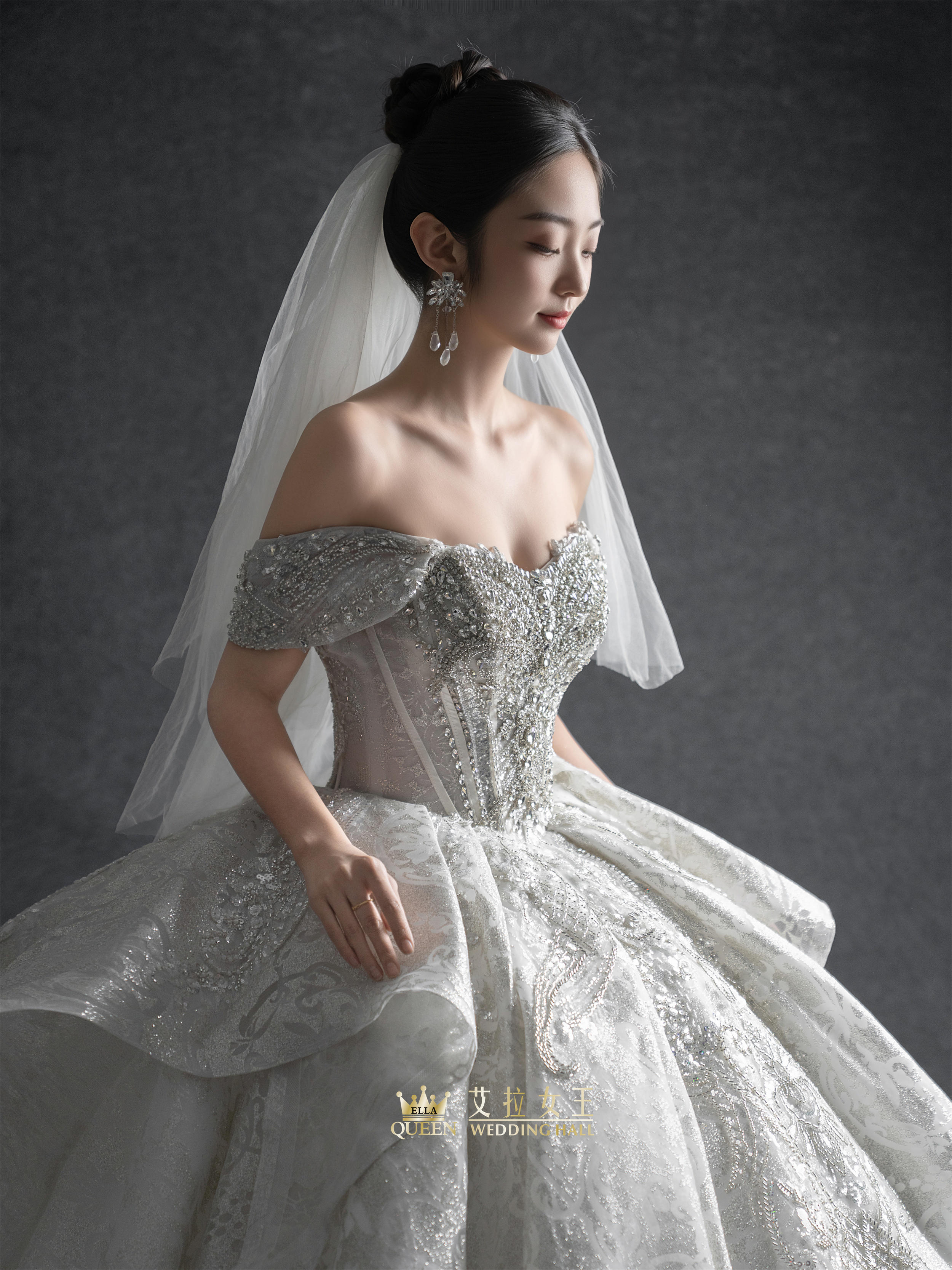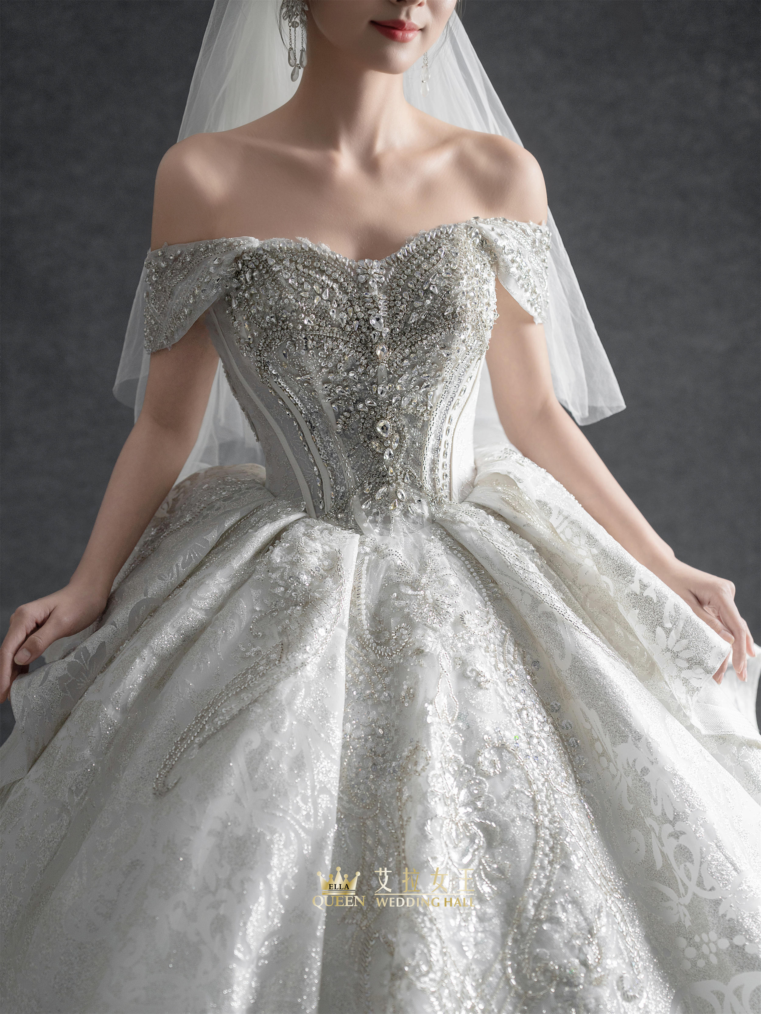 【优雅气质】一字肩缎纱拖尾婚纱