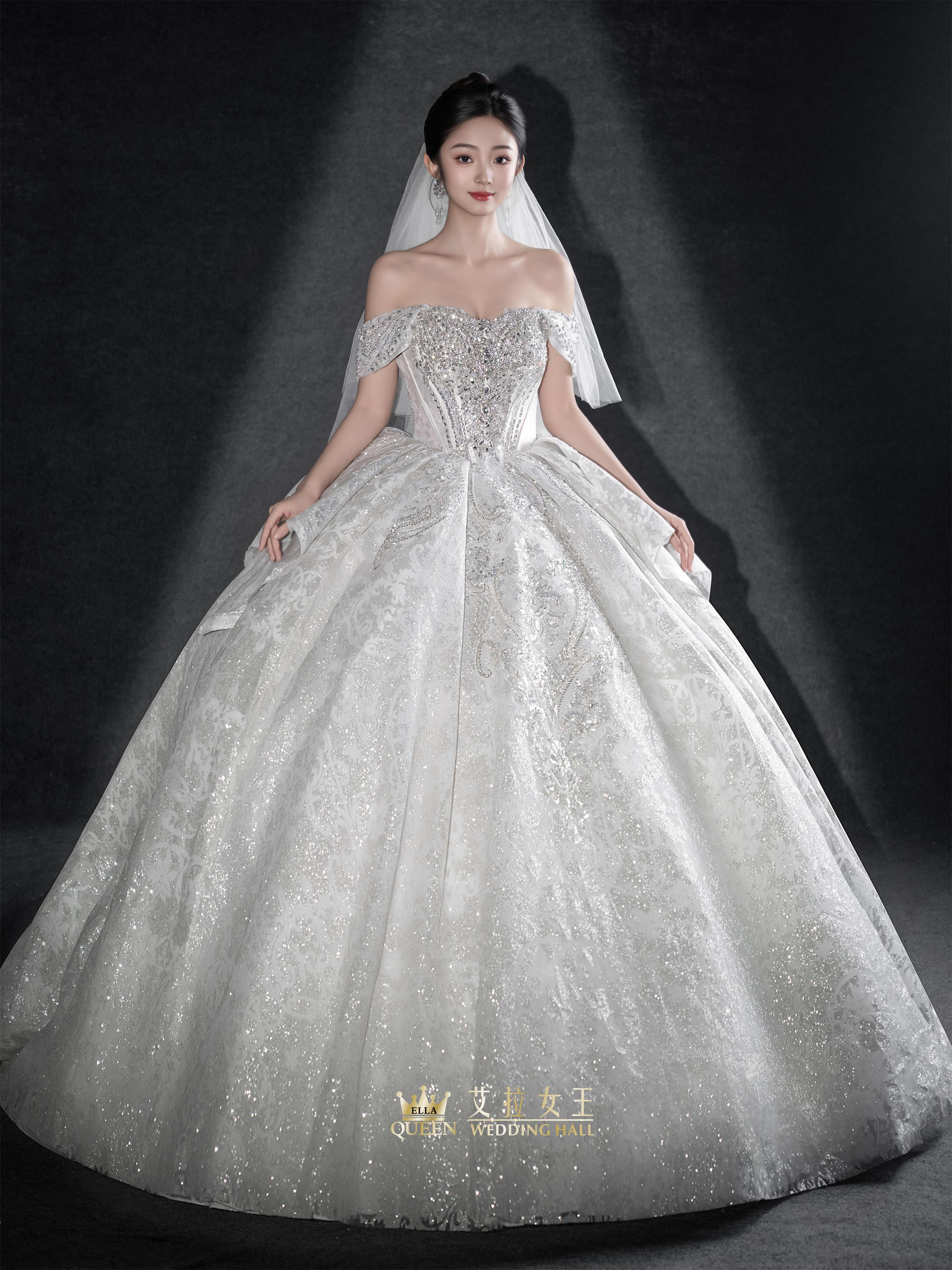 【华丽感】一字肩公主风大拖尾婚纱