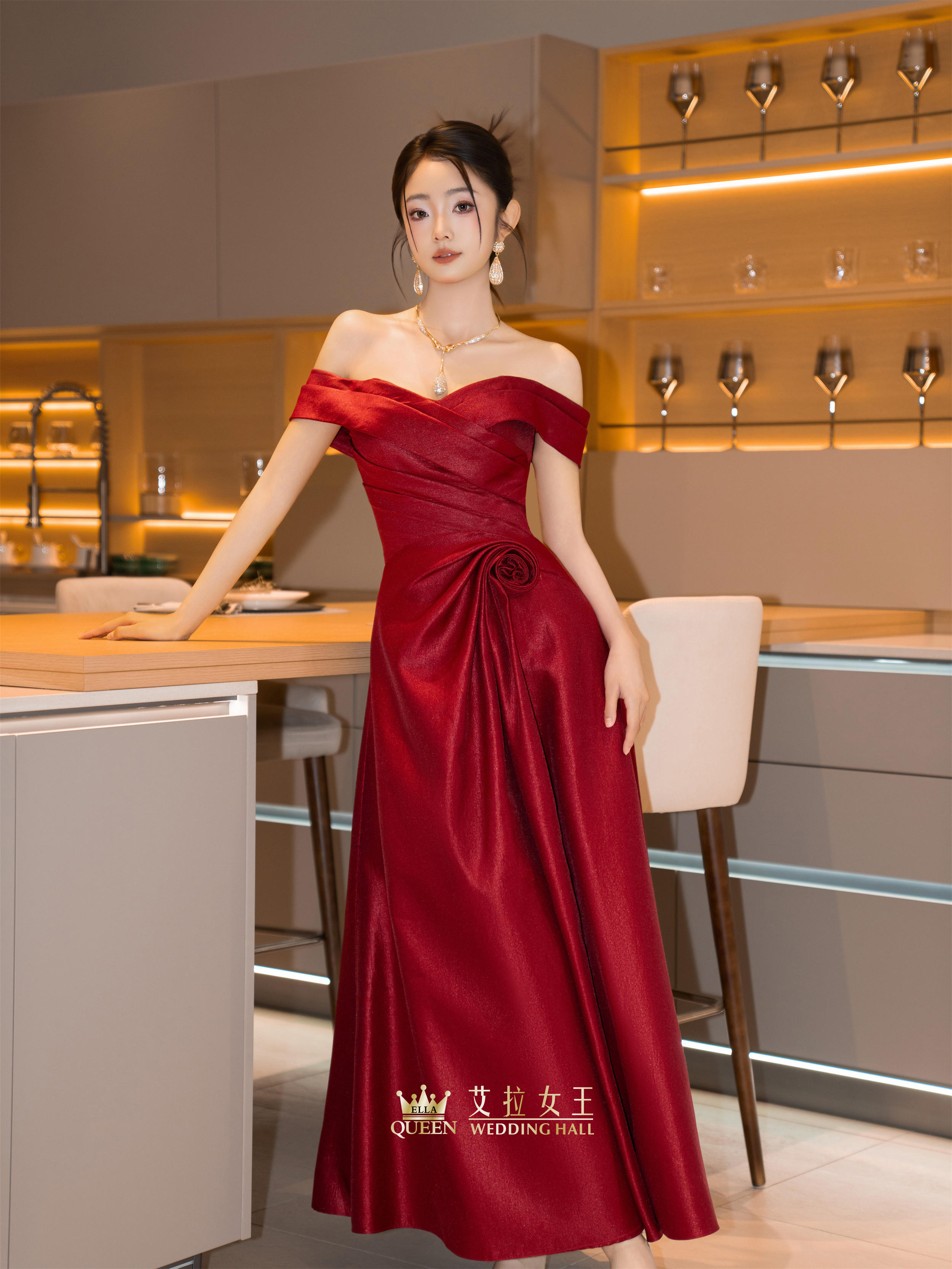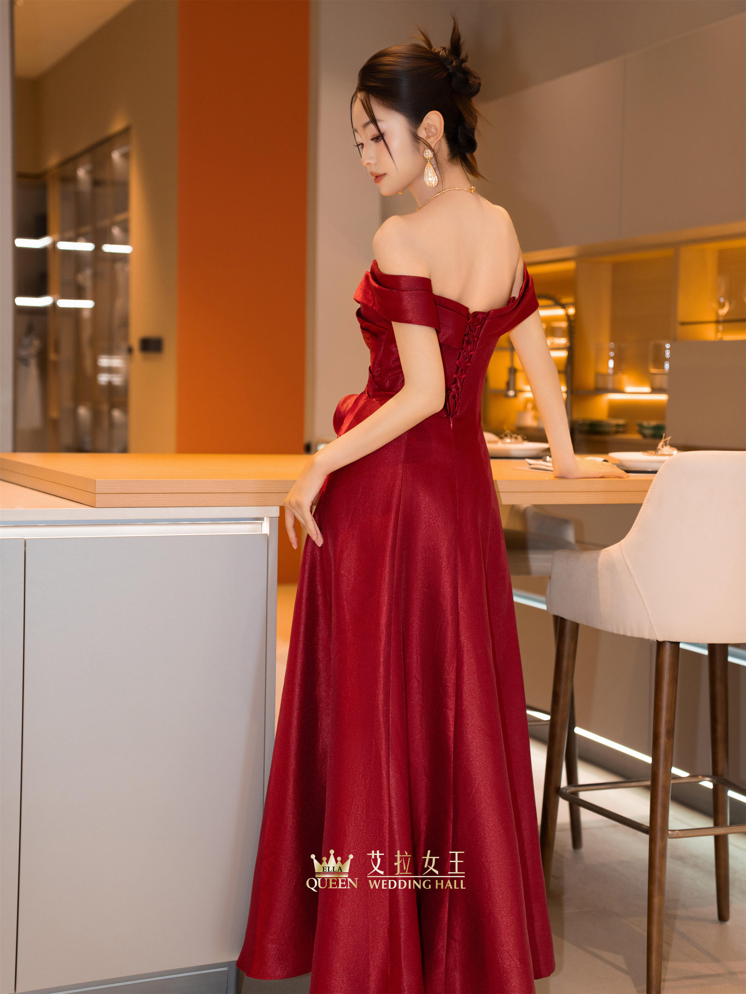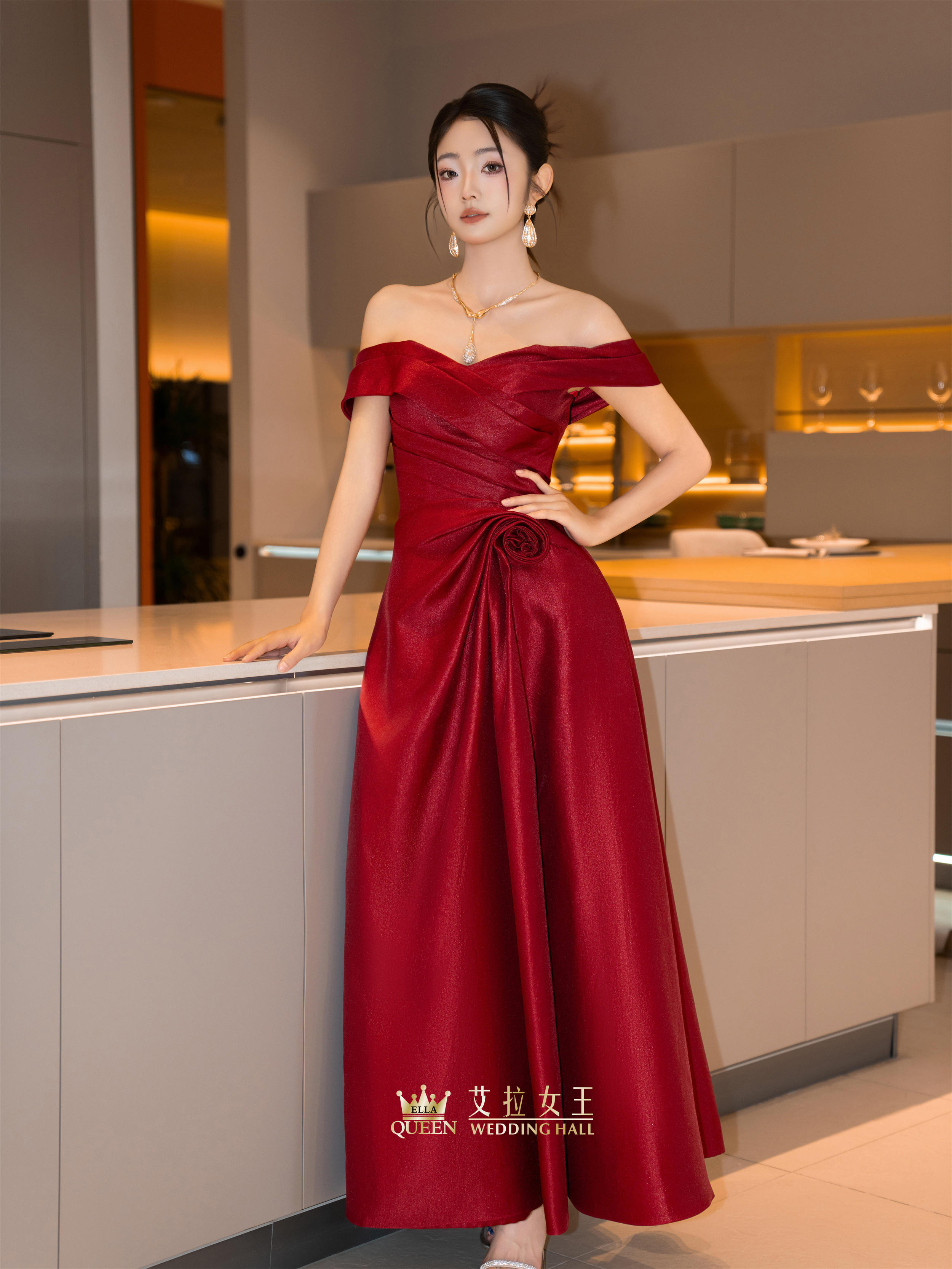 【明艳大女主】红色缎闪一字肩礼服