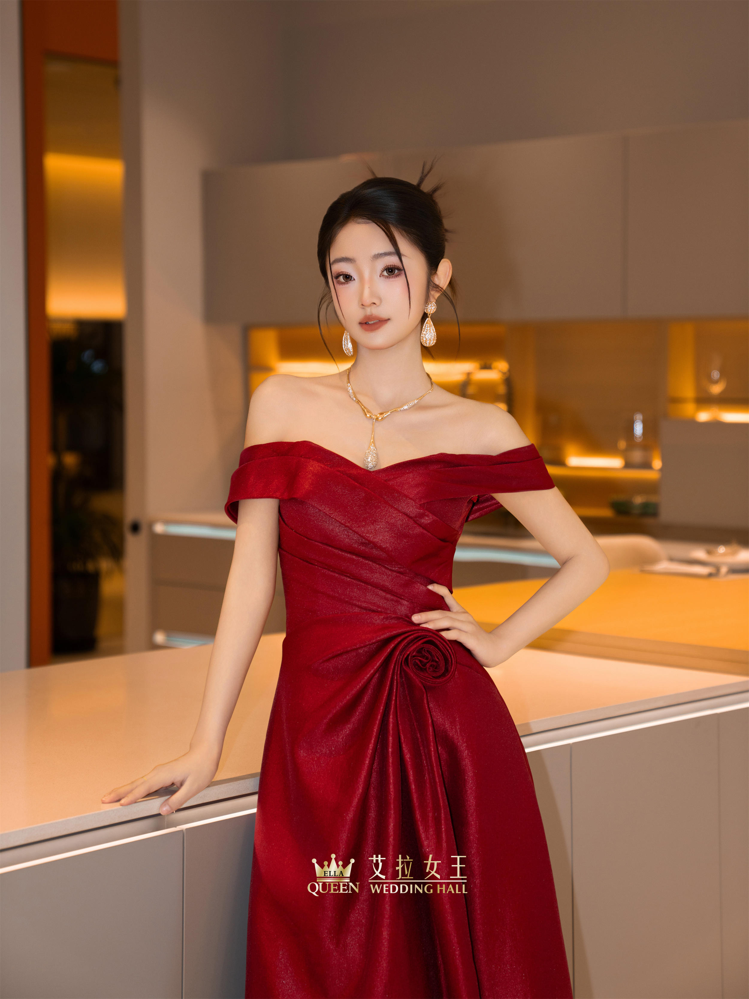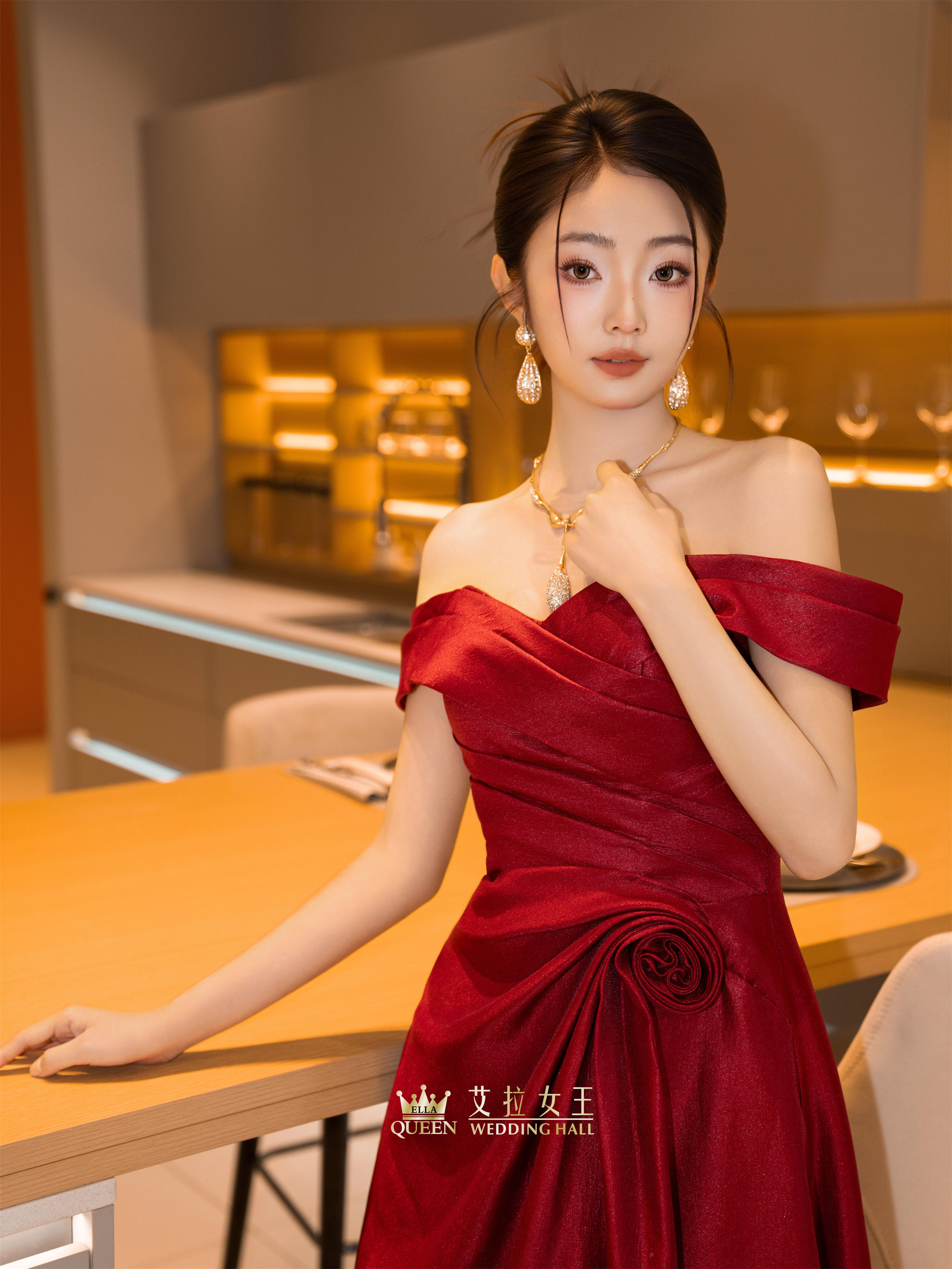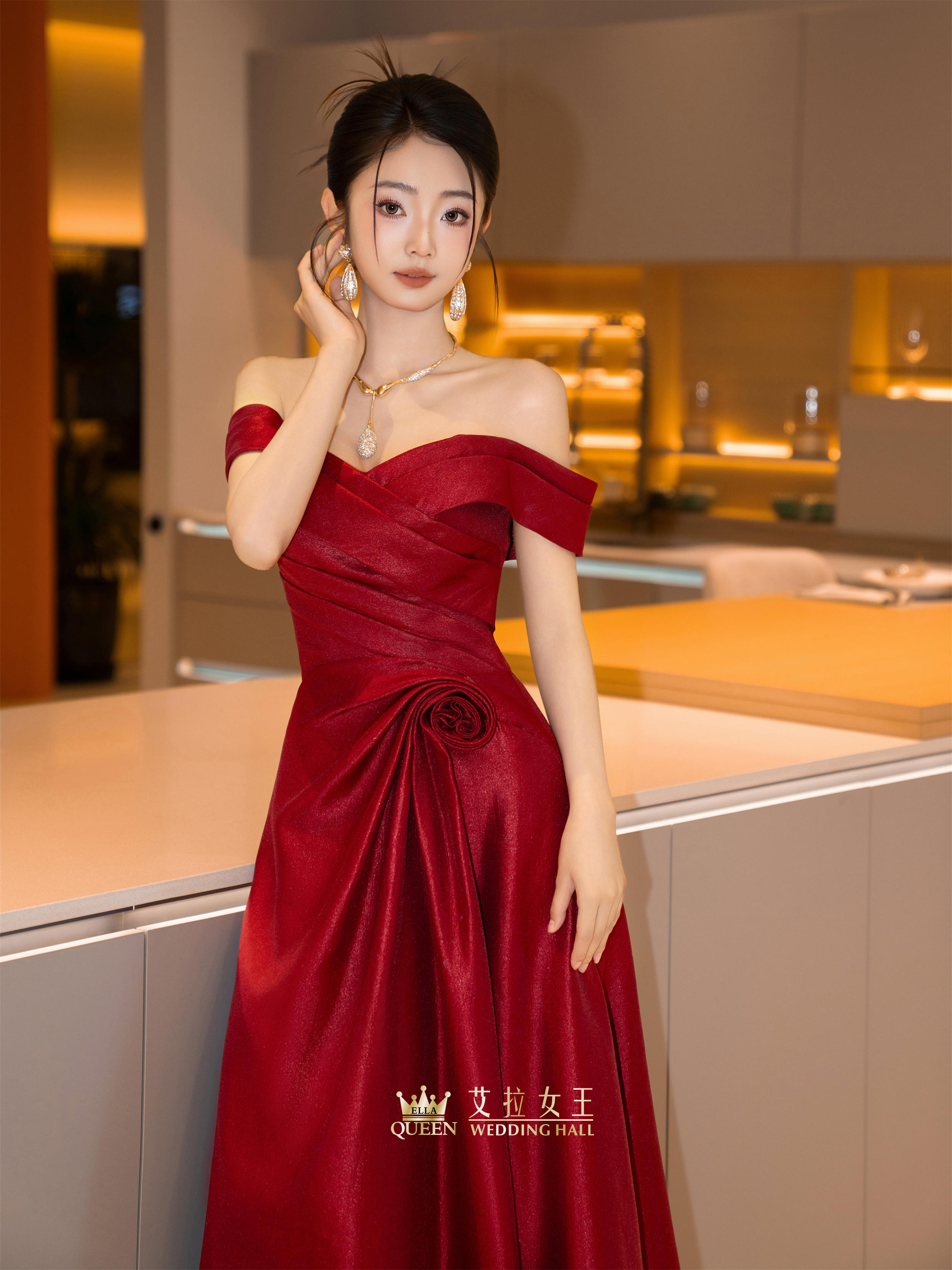 【明艳大女主】红色缎闪一字肩礼服