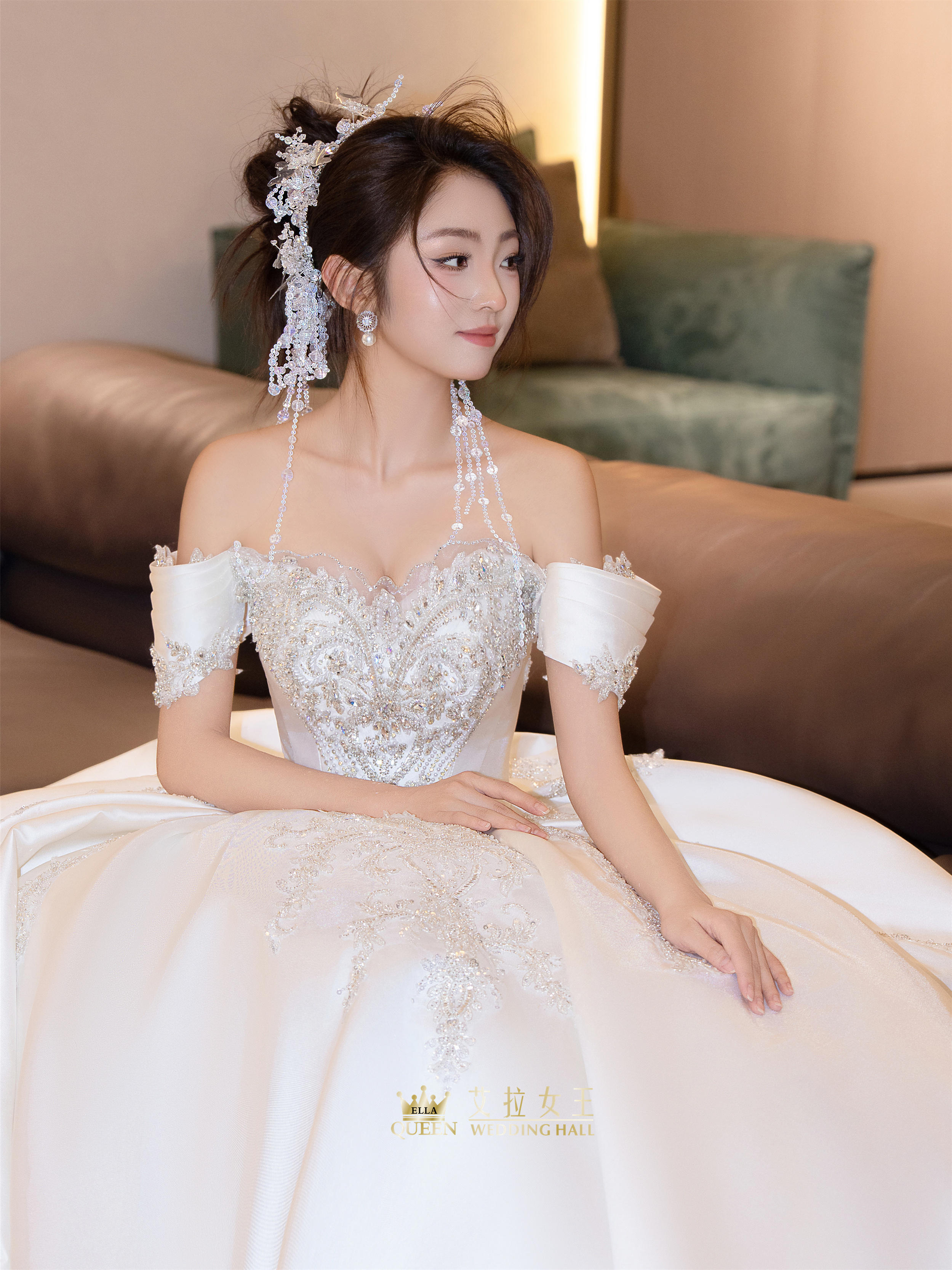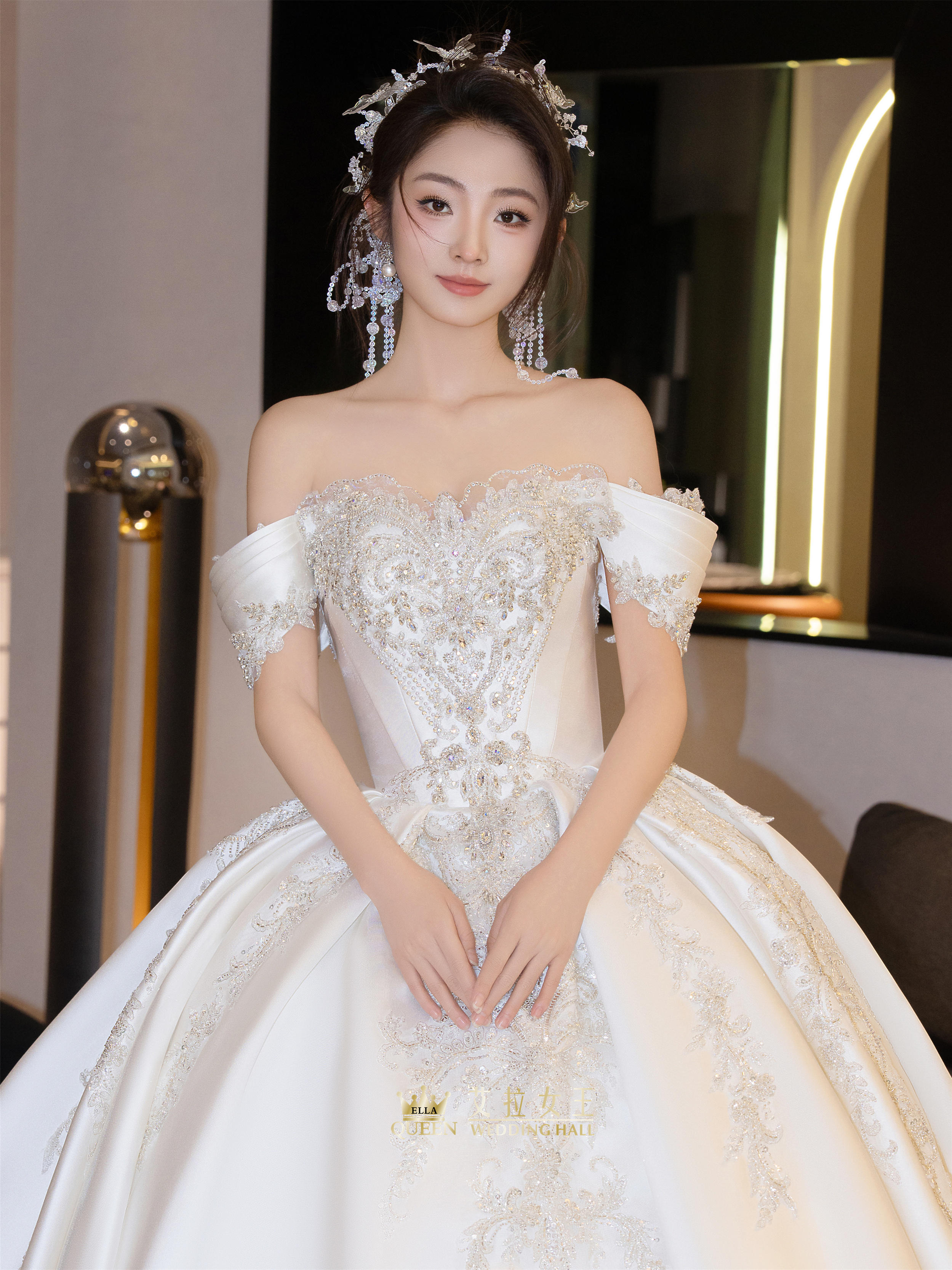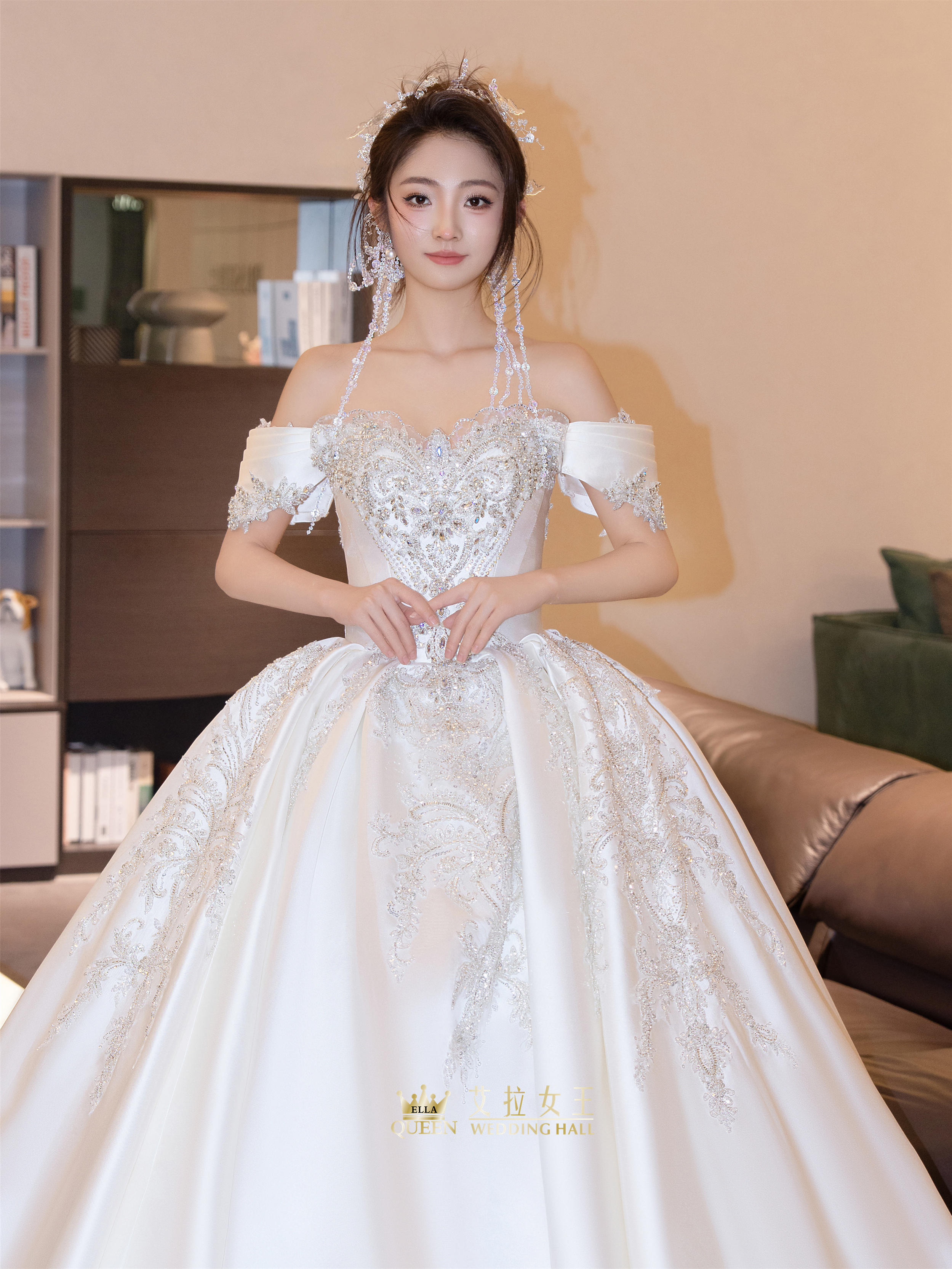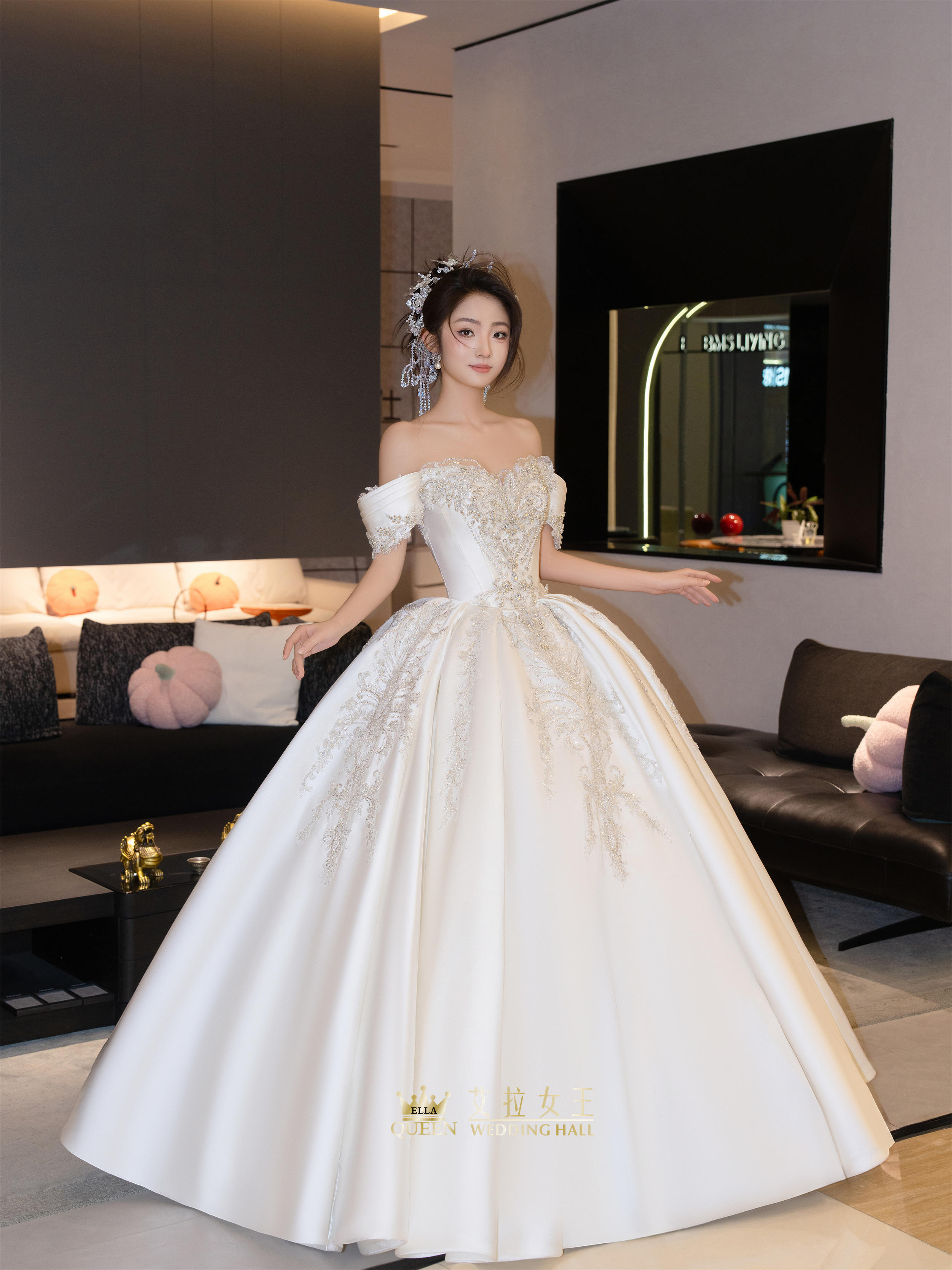 【甜美减龄】缎钻一字肩齐地婚纱