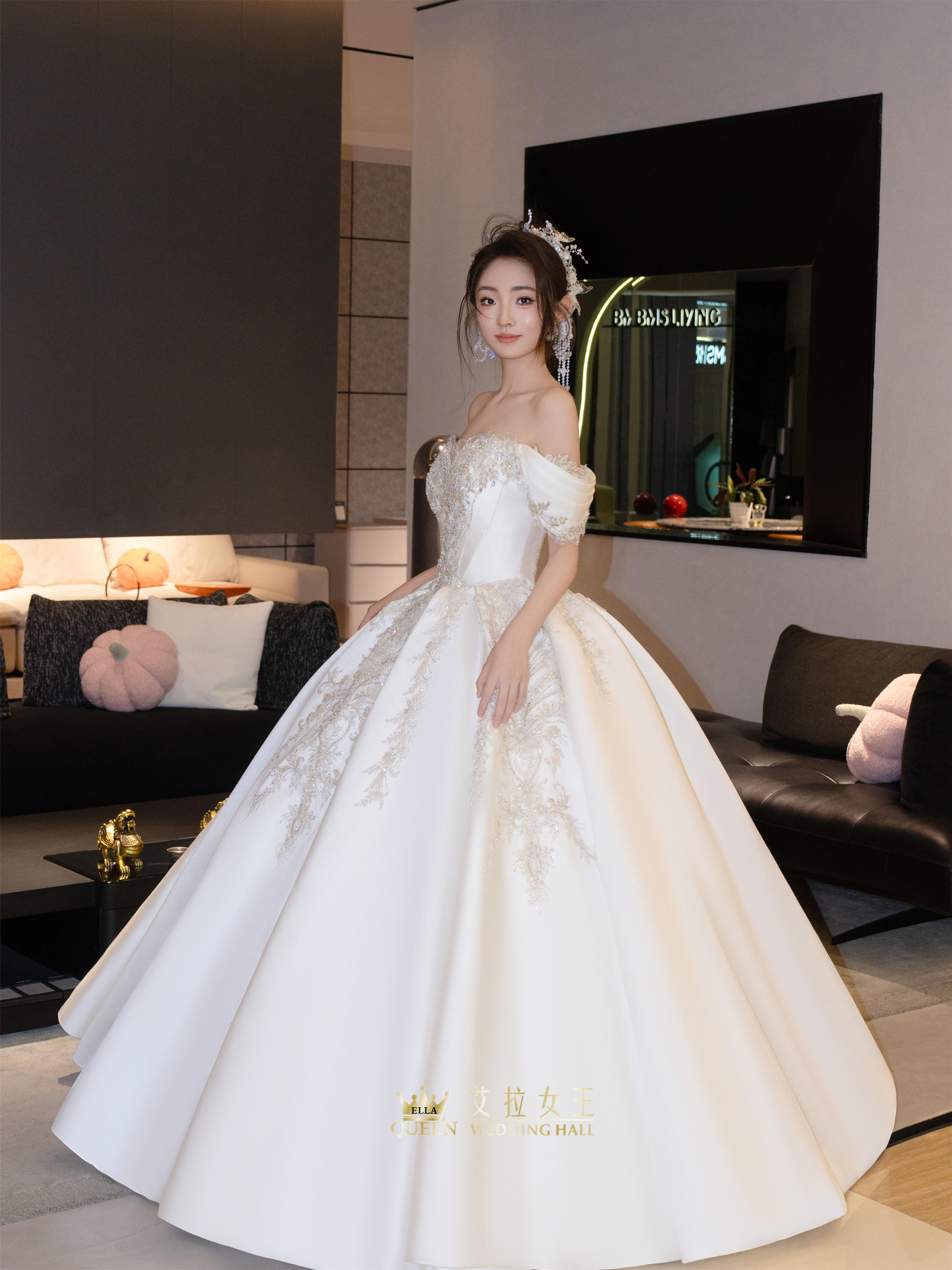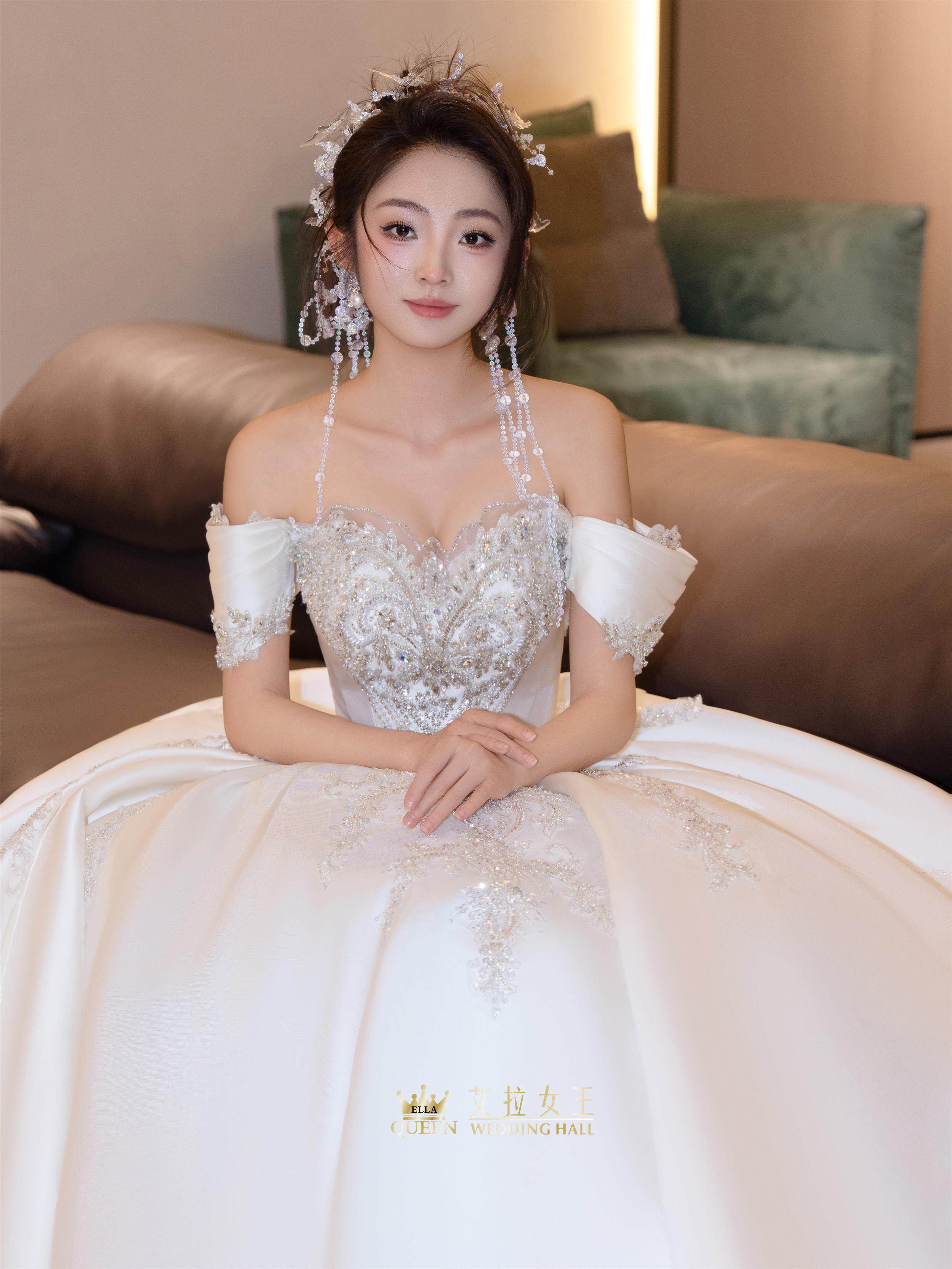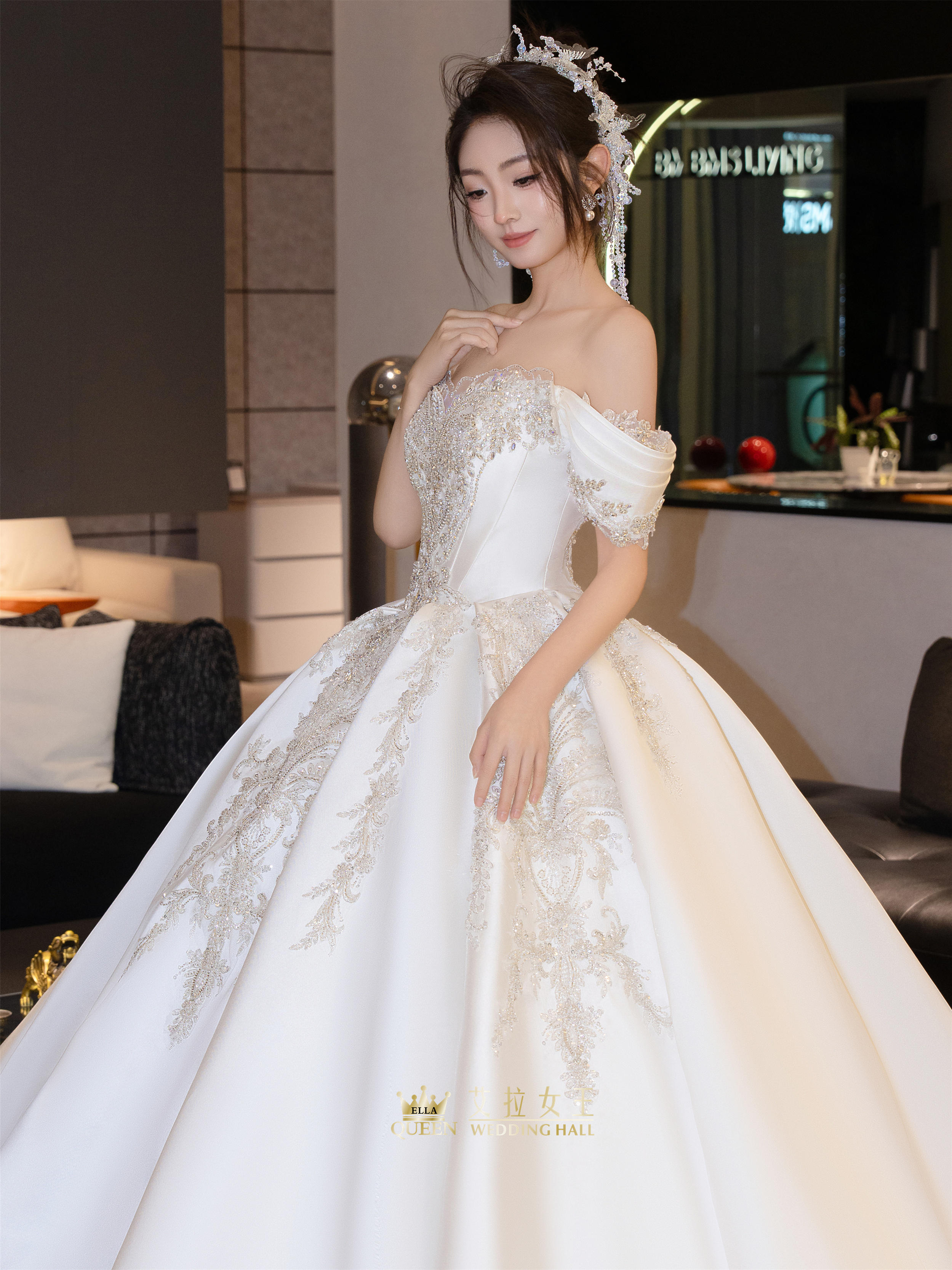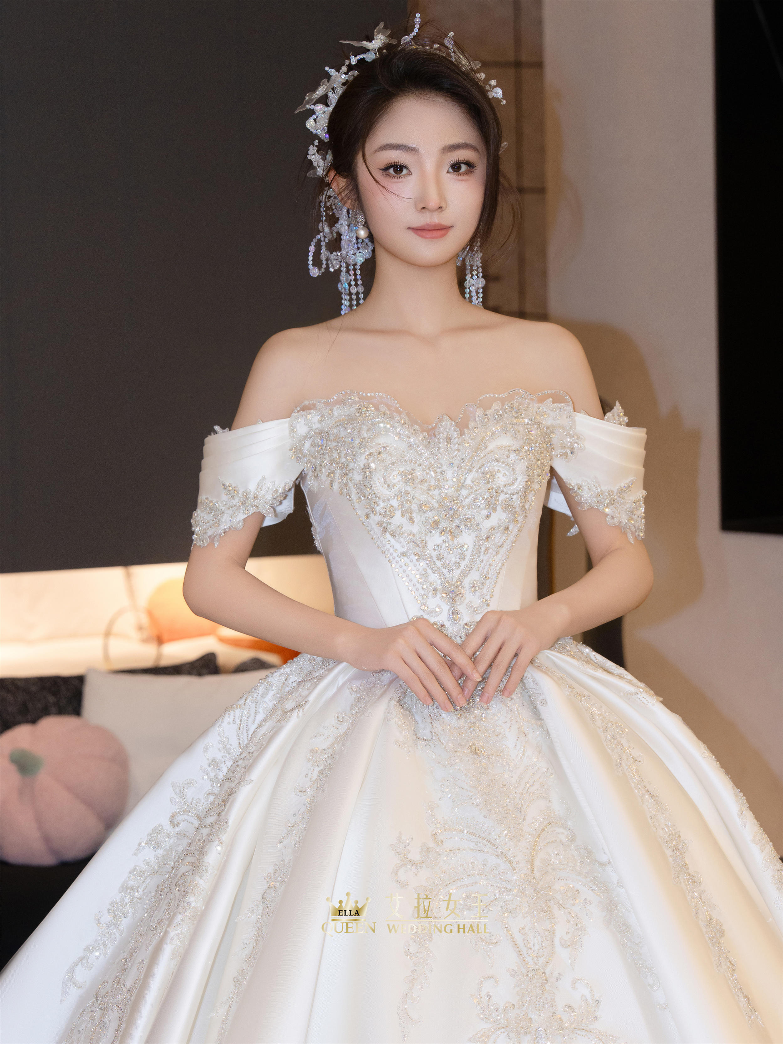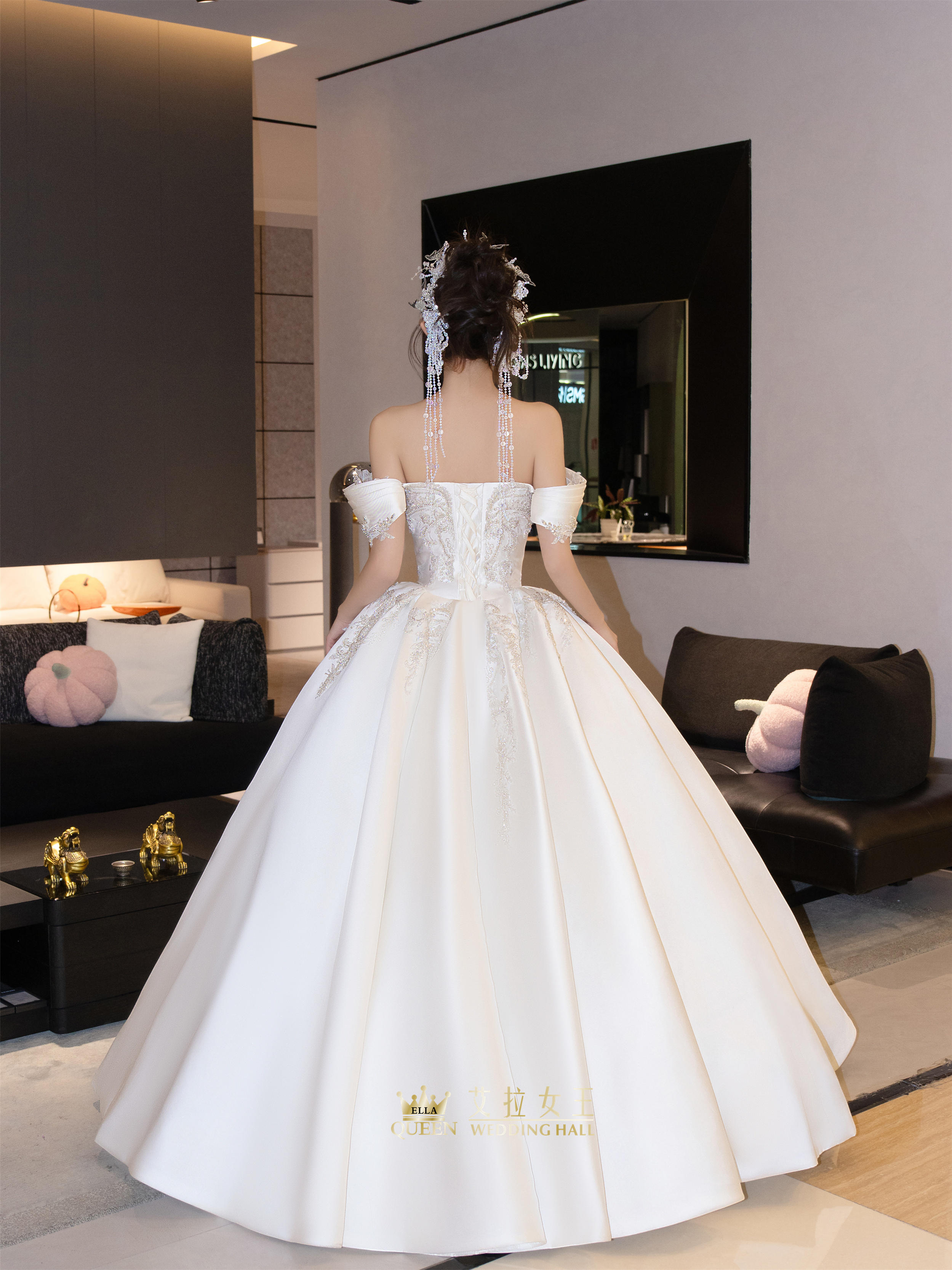 【甜美减龄】缎钻一字肩齐地婚纱