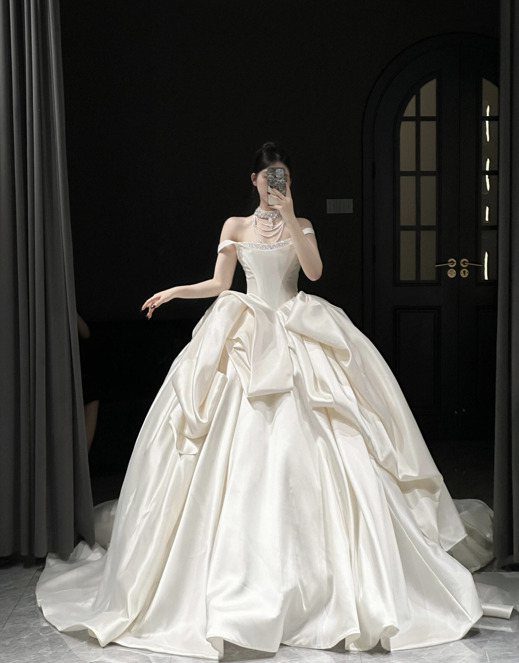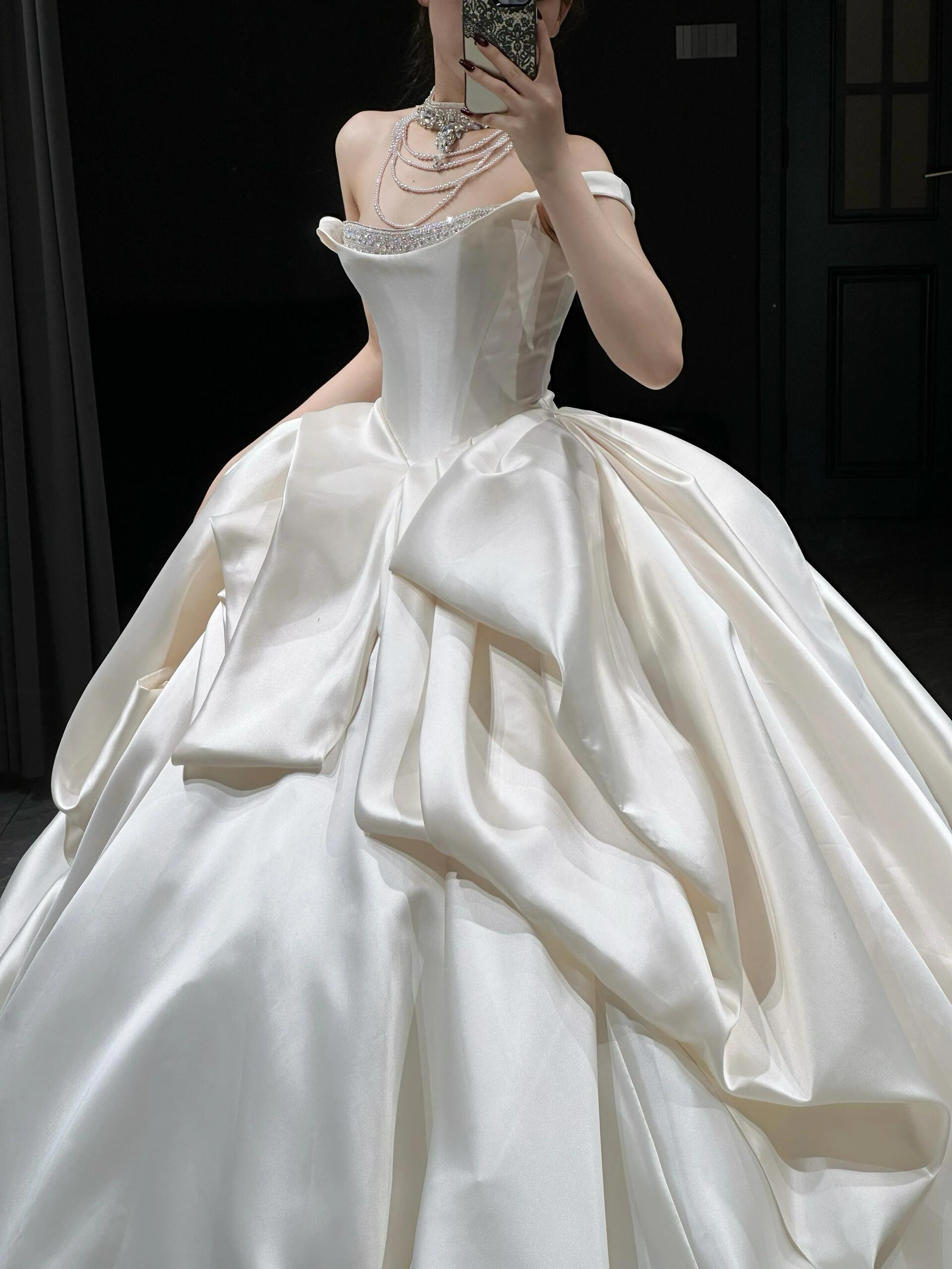 缎面一字肩高端轻婚纱