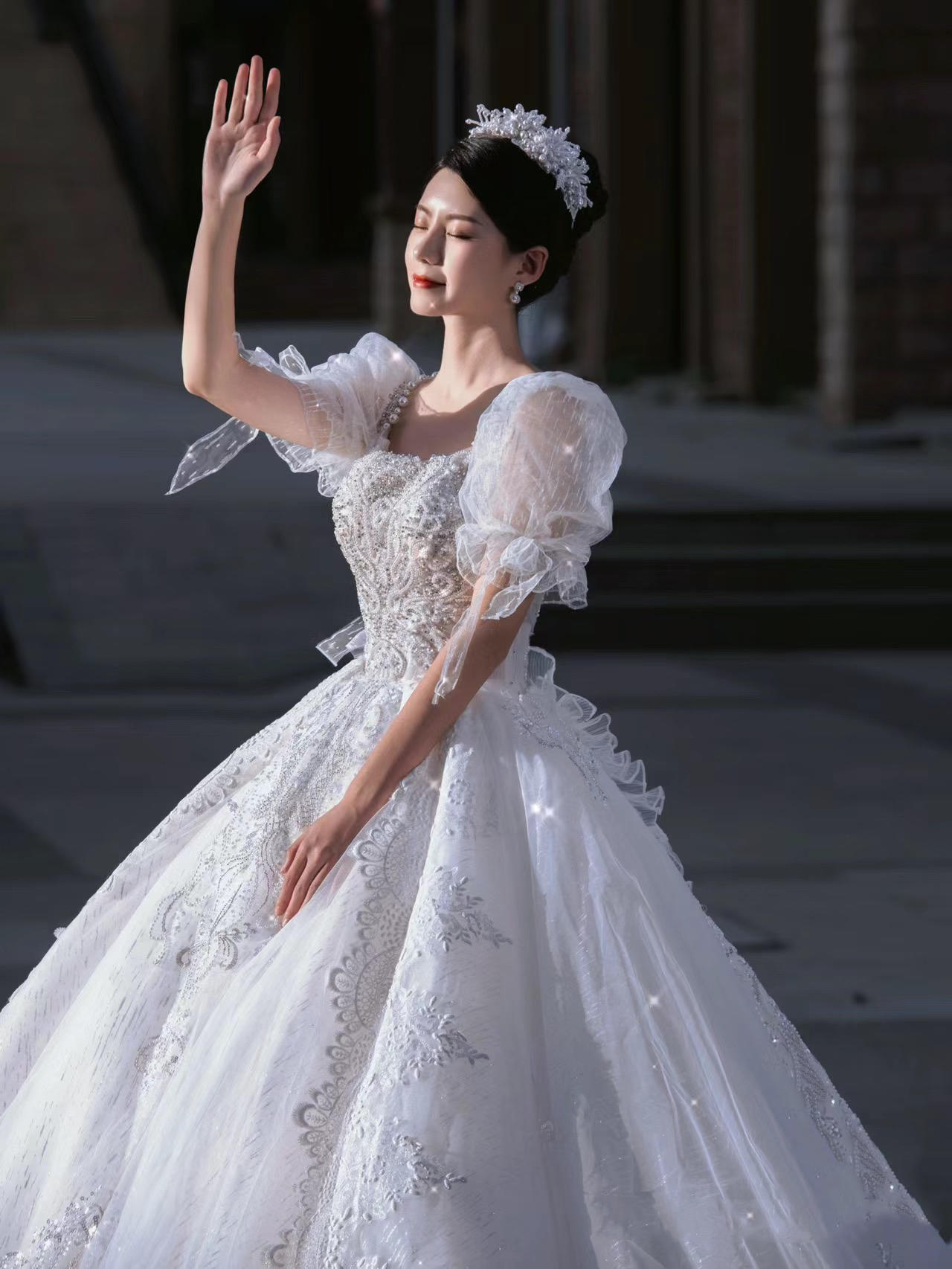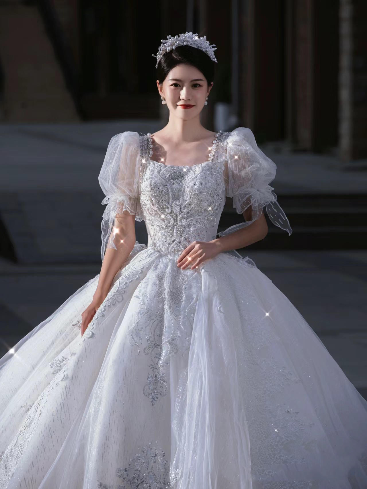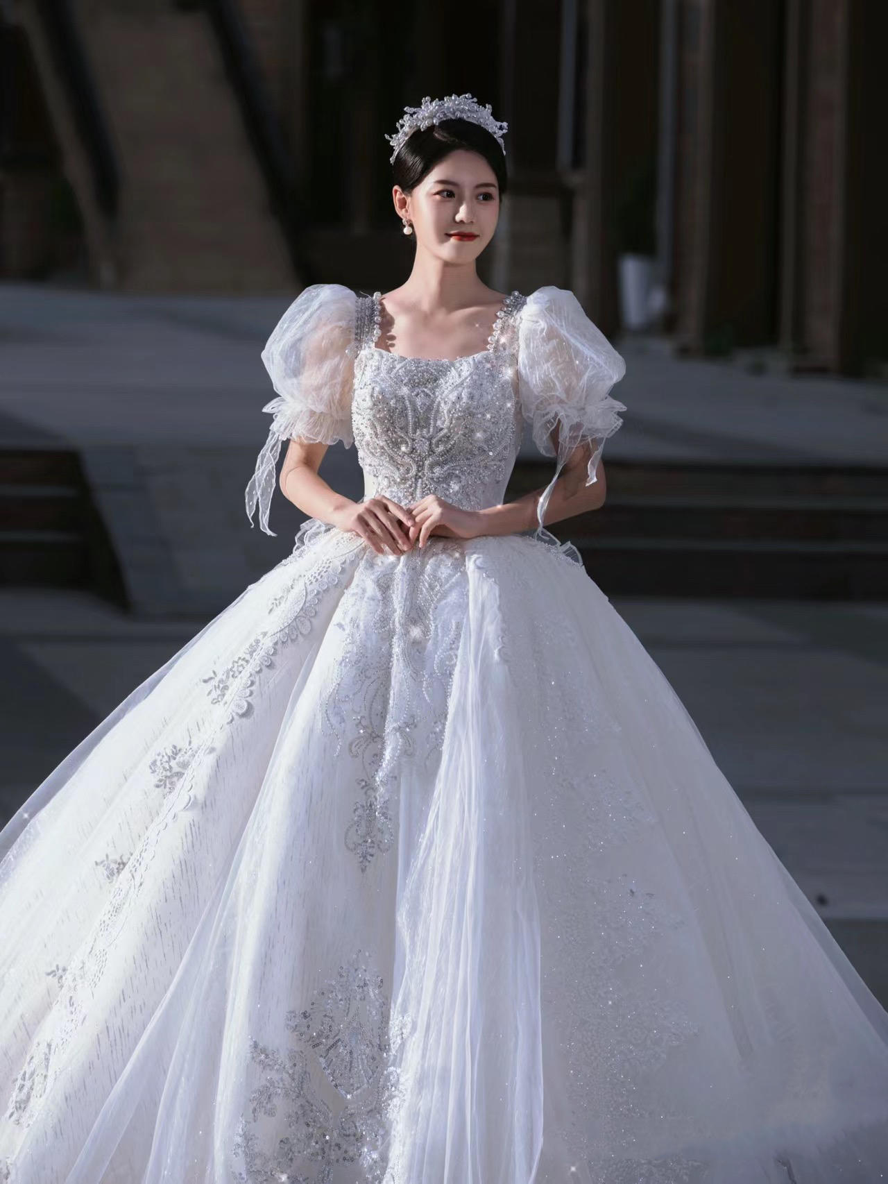 《艺境婚纱》公主袖方领超大拖主纱