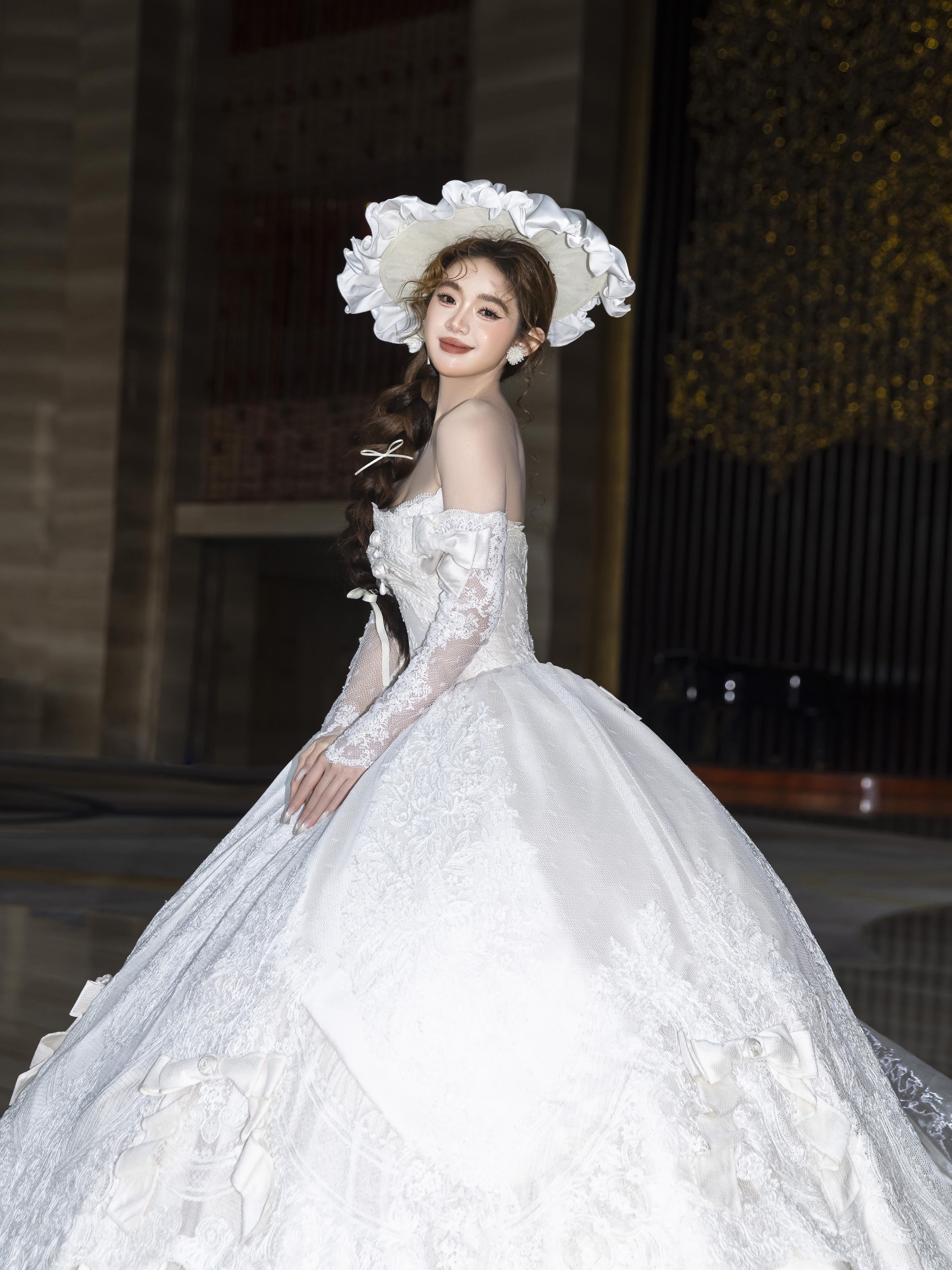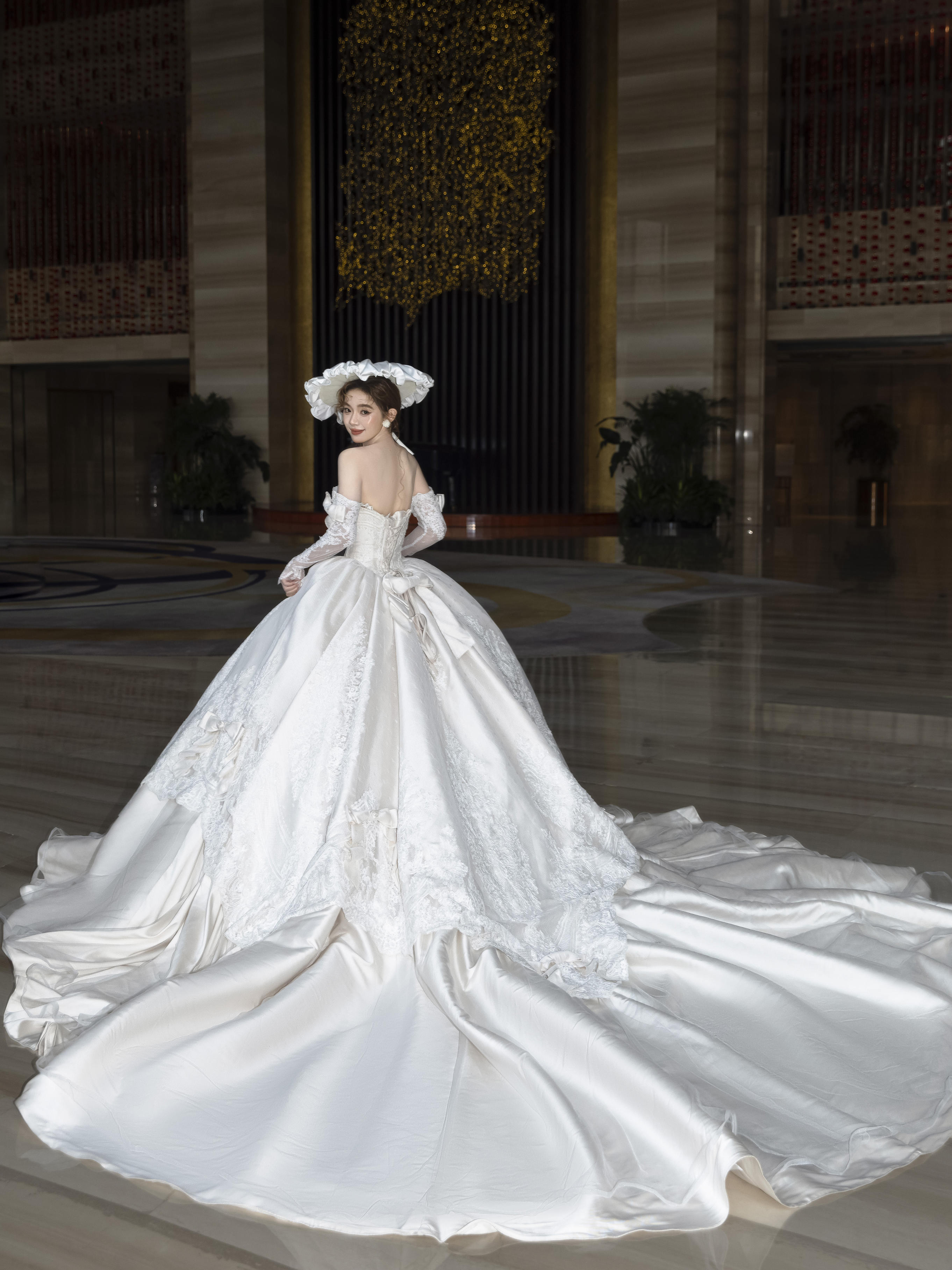 一字肩缎面婚纱