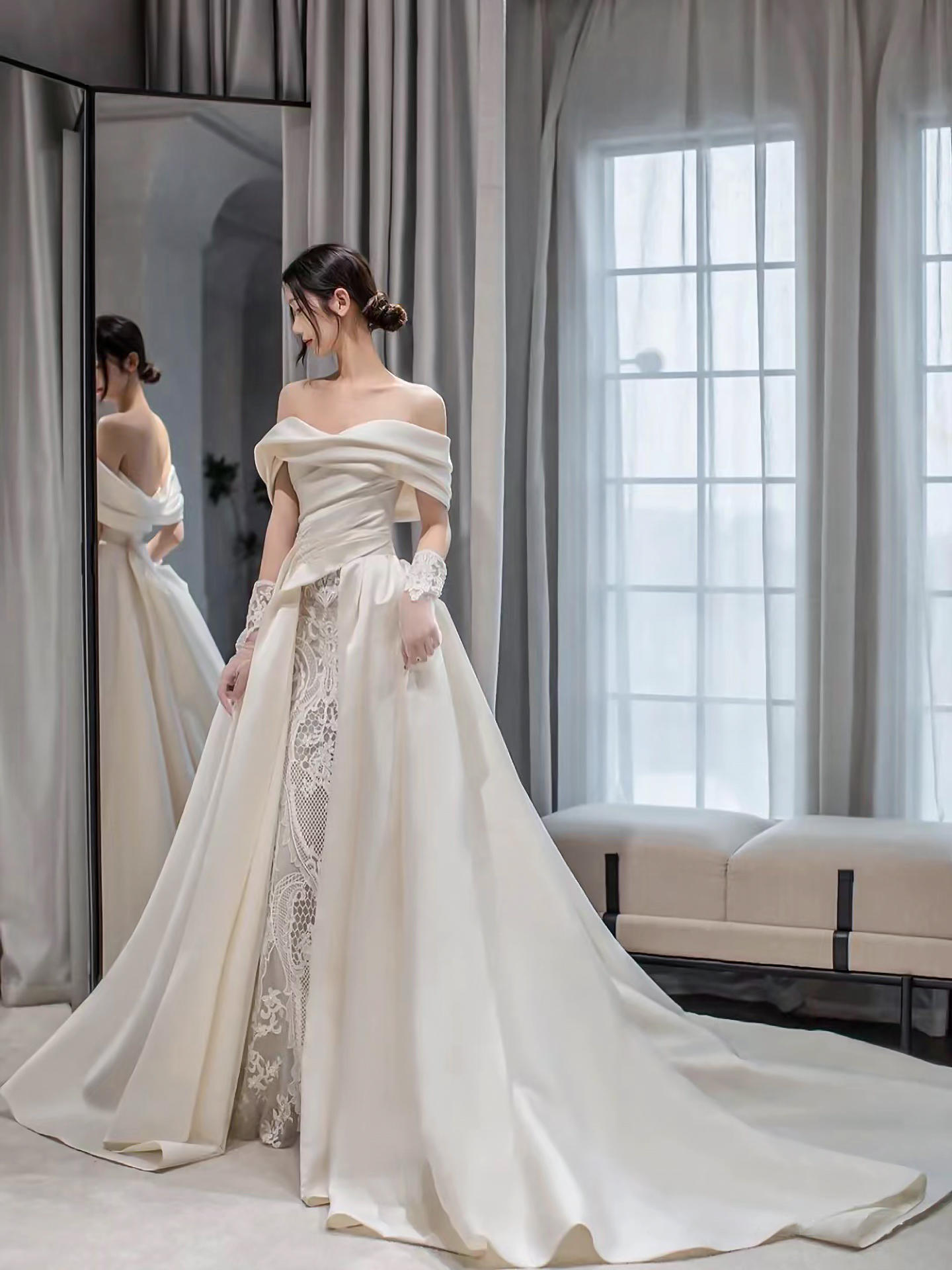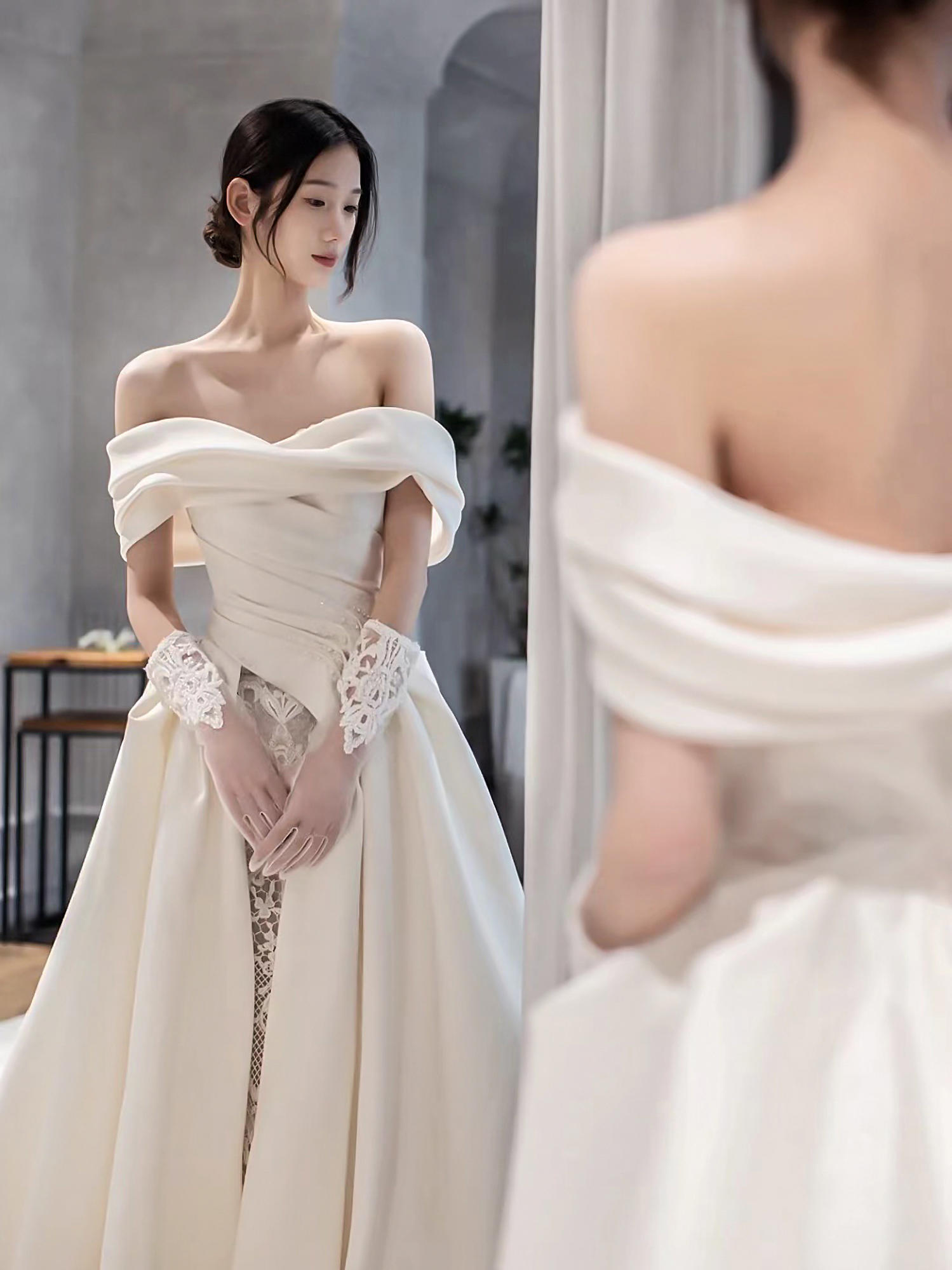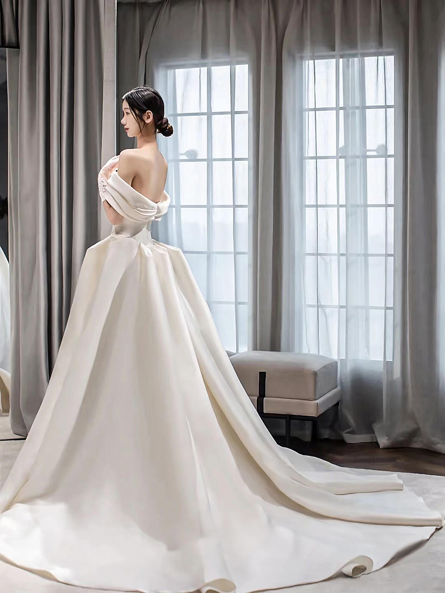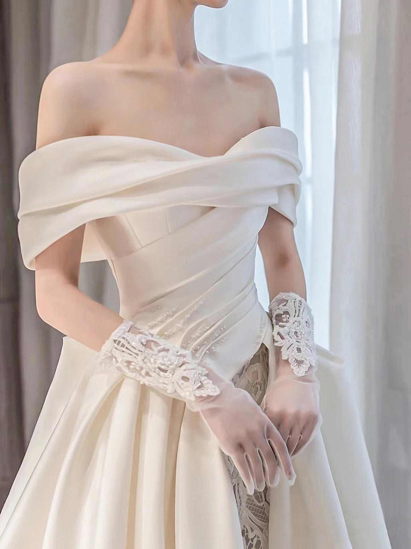 缎面一字肩气质款主纱纯白高级