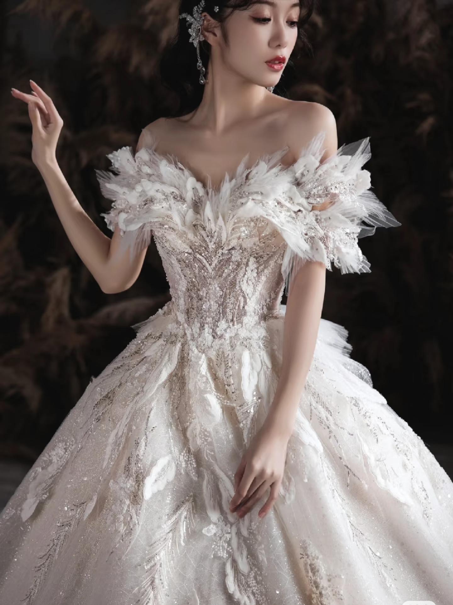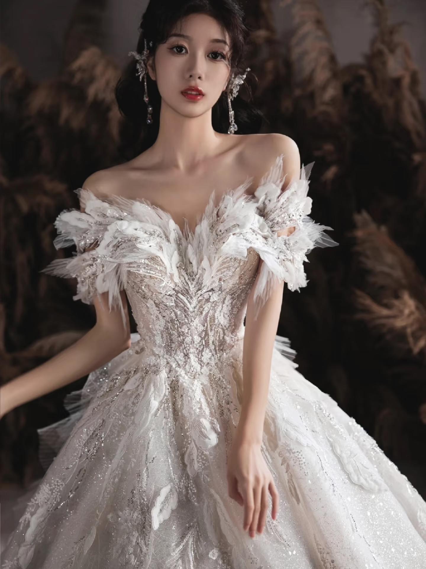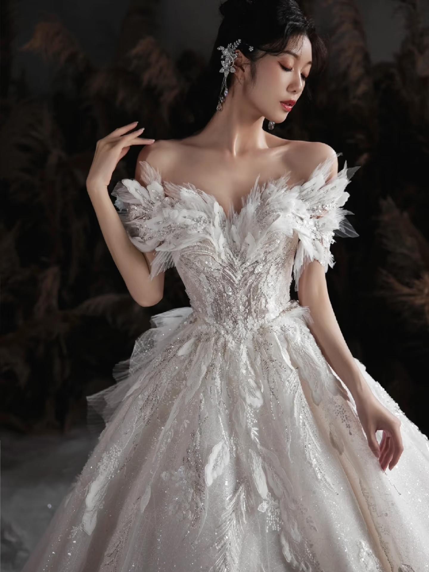 羽毛装饰婚纱,营造浪漫梦幻氛围