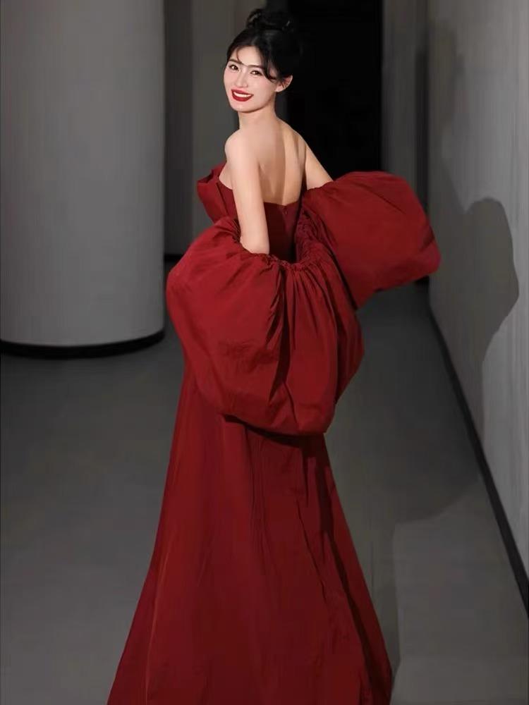 绯云挽袖-红绸泡泡袖拖尾裙