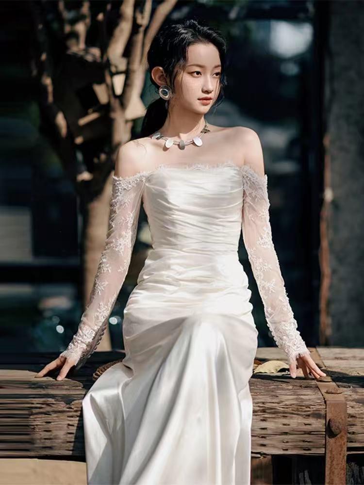 月下织纱-蕾丝袖缎面轻婚纱