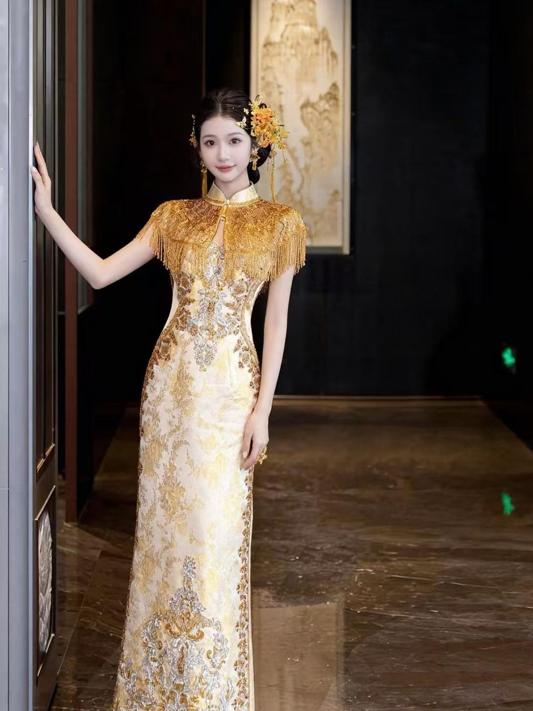 新中式旗袍搭配金色流苏披肩