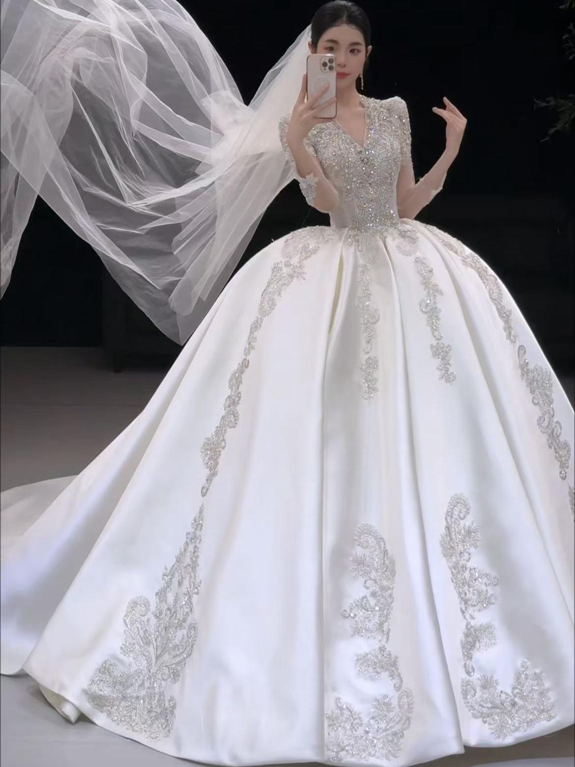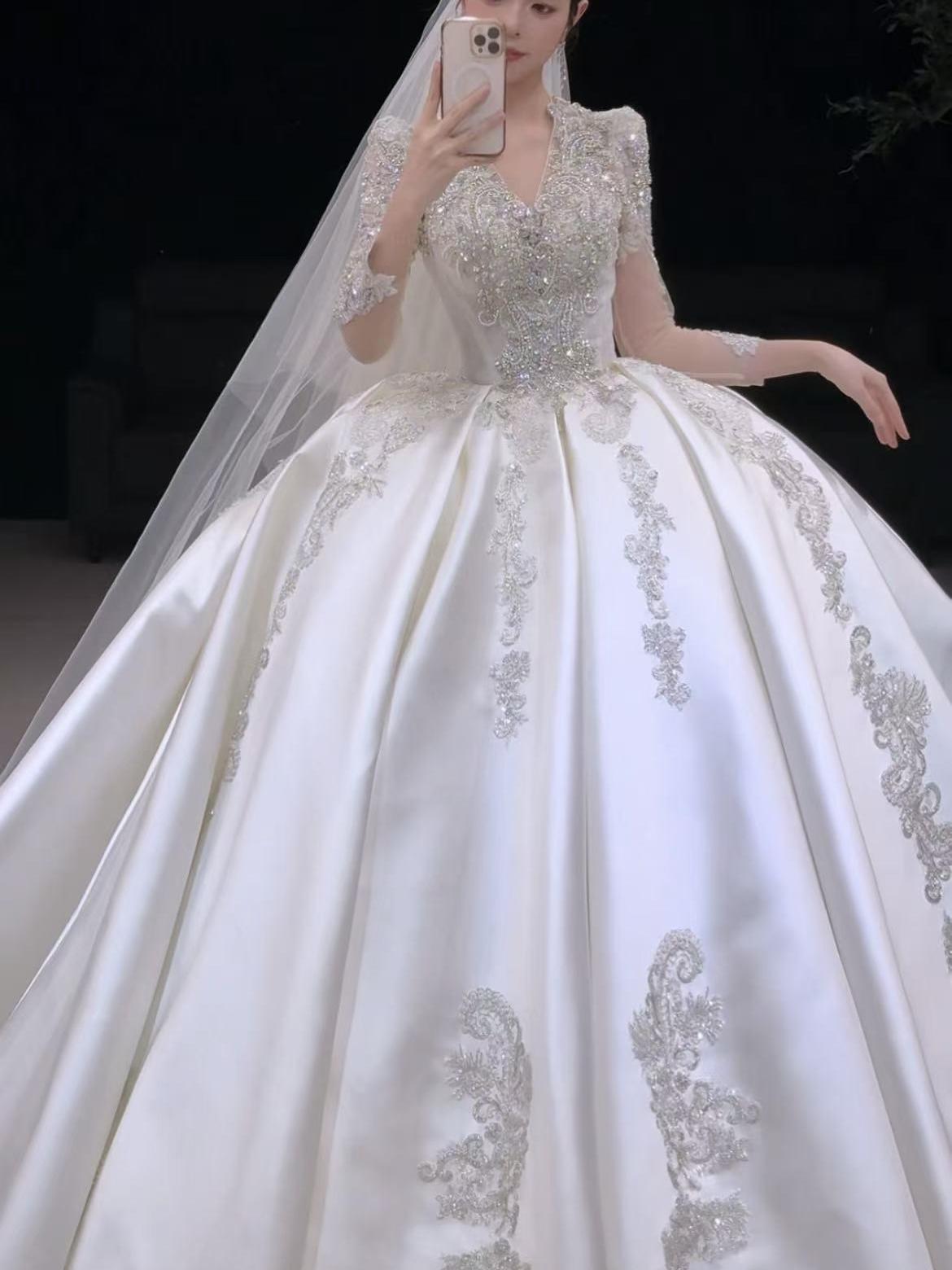 长袖V领缎面钻闪主纱