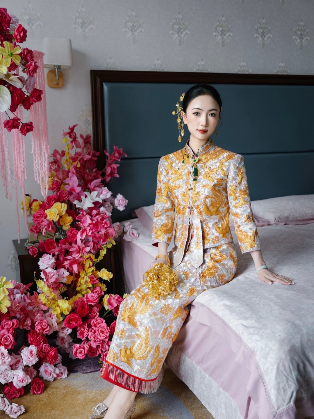 新中式旗袍搭配金色流苏披肩