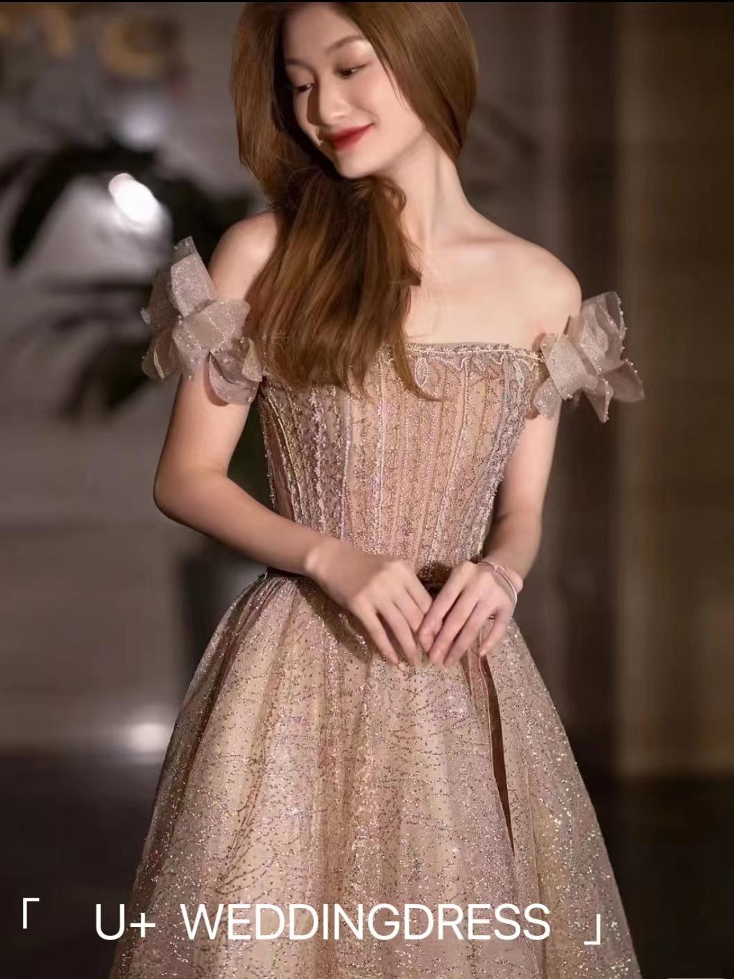 一字肩香槟俏皮礼服
