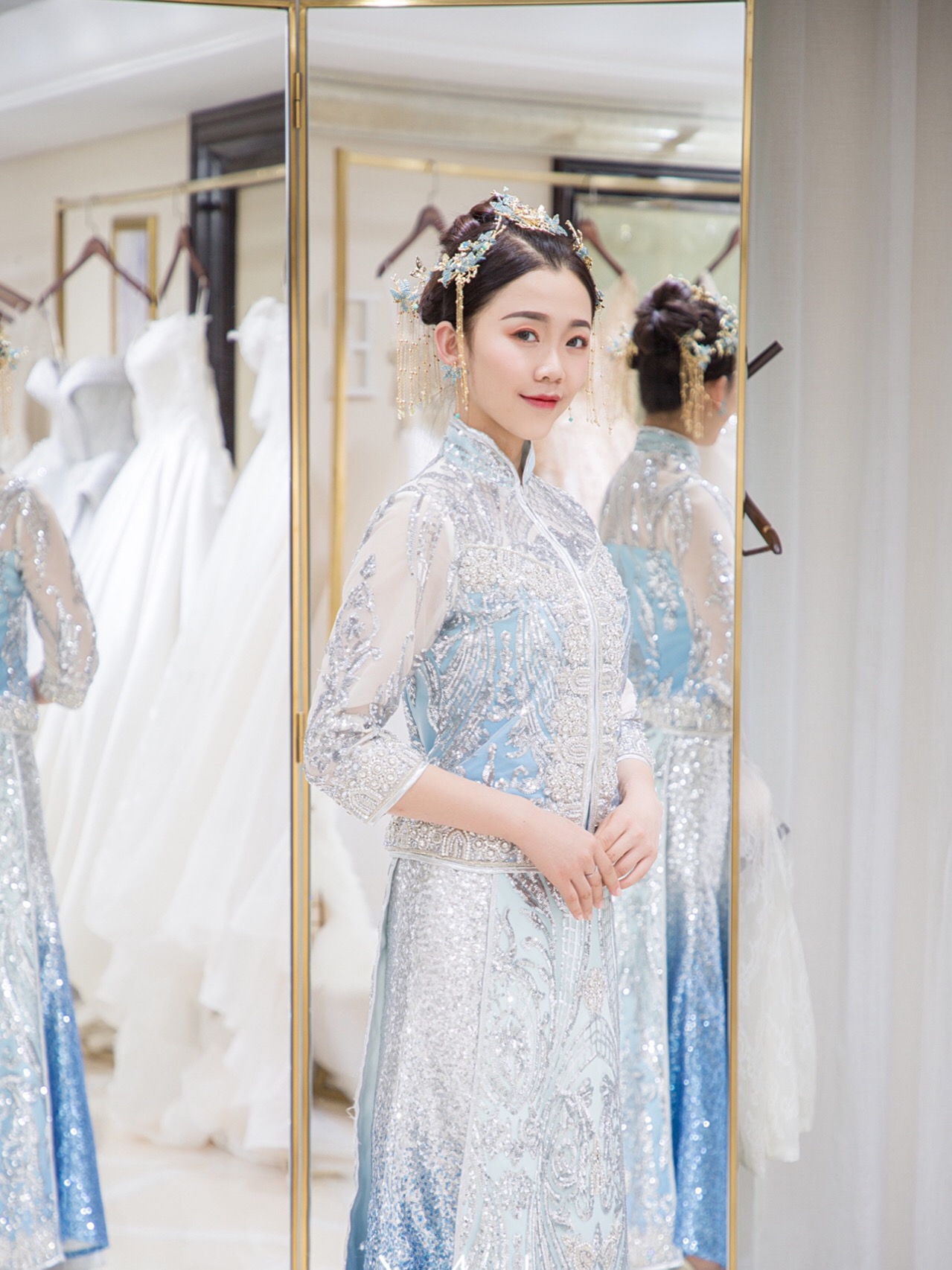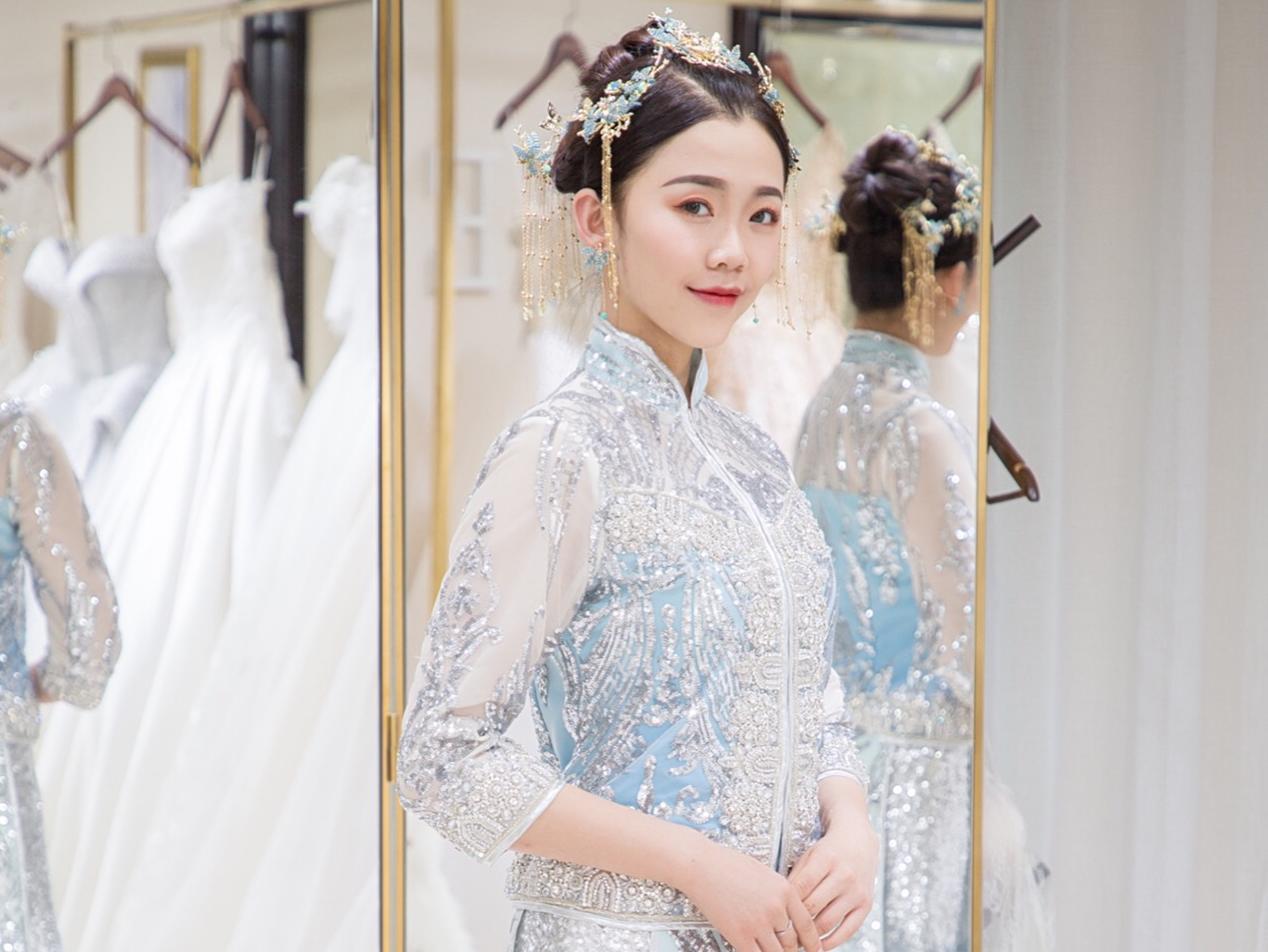 此套餐包括<br />新娘全程跟妆 + 新娘出门纱一套+新娘豪华婚纱一套 + 新娘敬酒服 一套+伴娘服<br /> 套餐内容: 2-5 妆面<br /> 2-5 造型<br /> 包括新娘化妆造型和礼服所需配备的头饰耳环<br />