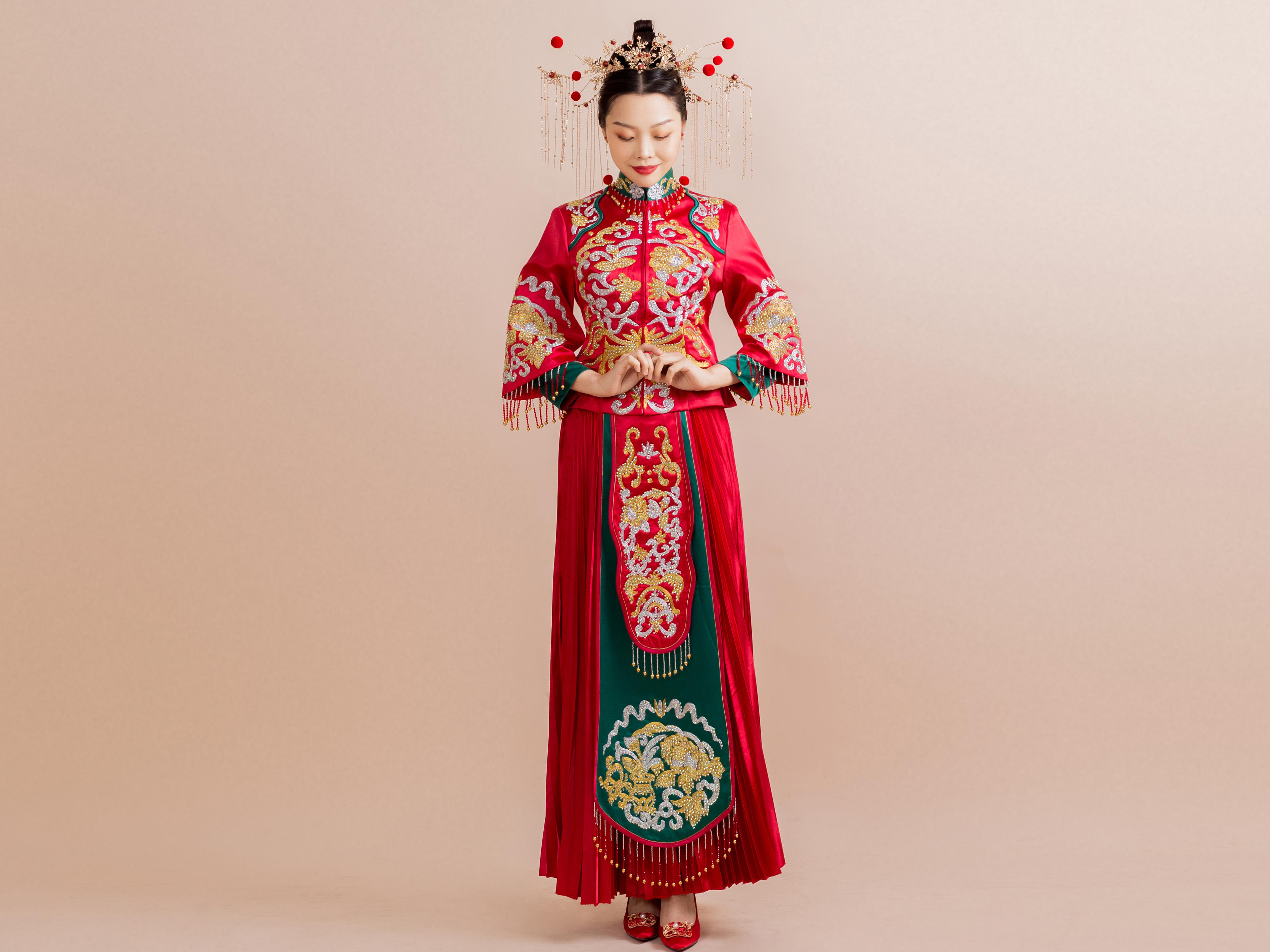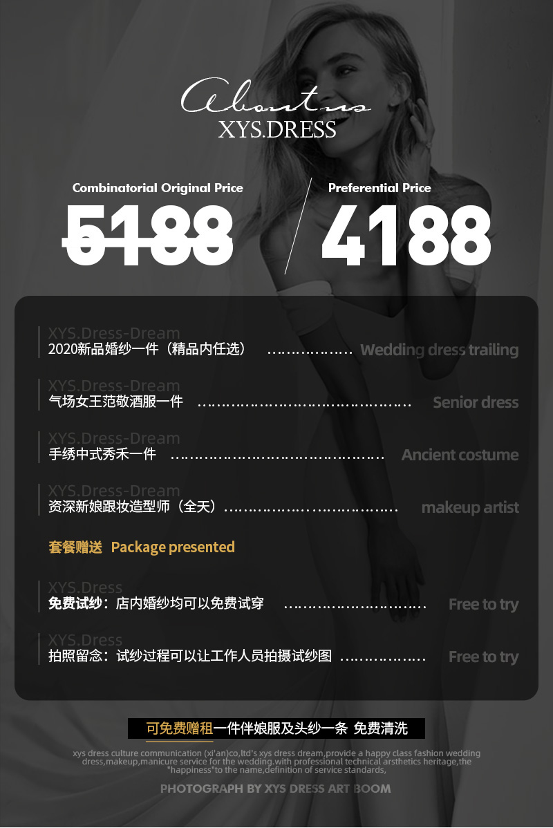 ———此套餐为婚纱+跟妆组合套餐——— <br />包含2020新品婚纱一件(精品内任选)/精品敬酒服一件/精品秀禾服一件/资深跟妆老师(全天)<br />注:(精品内任选) <br />