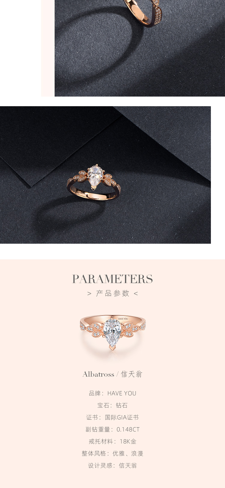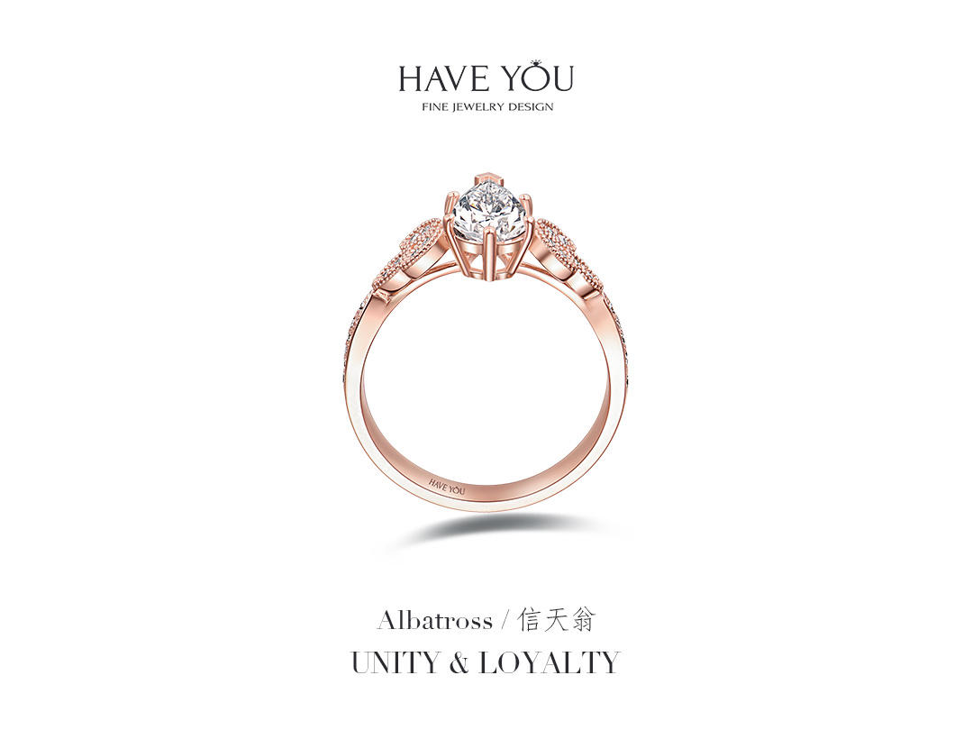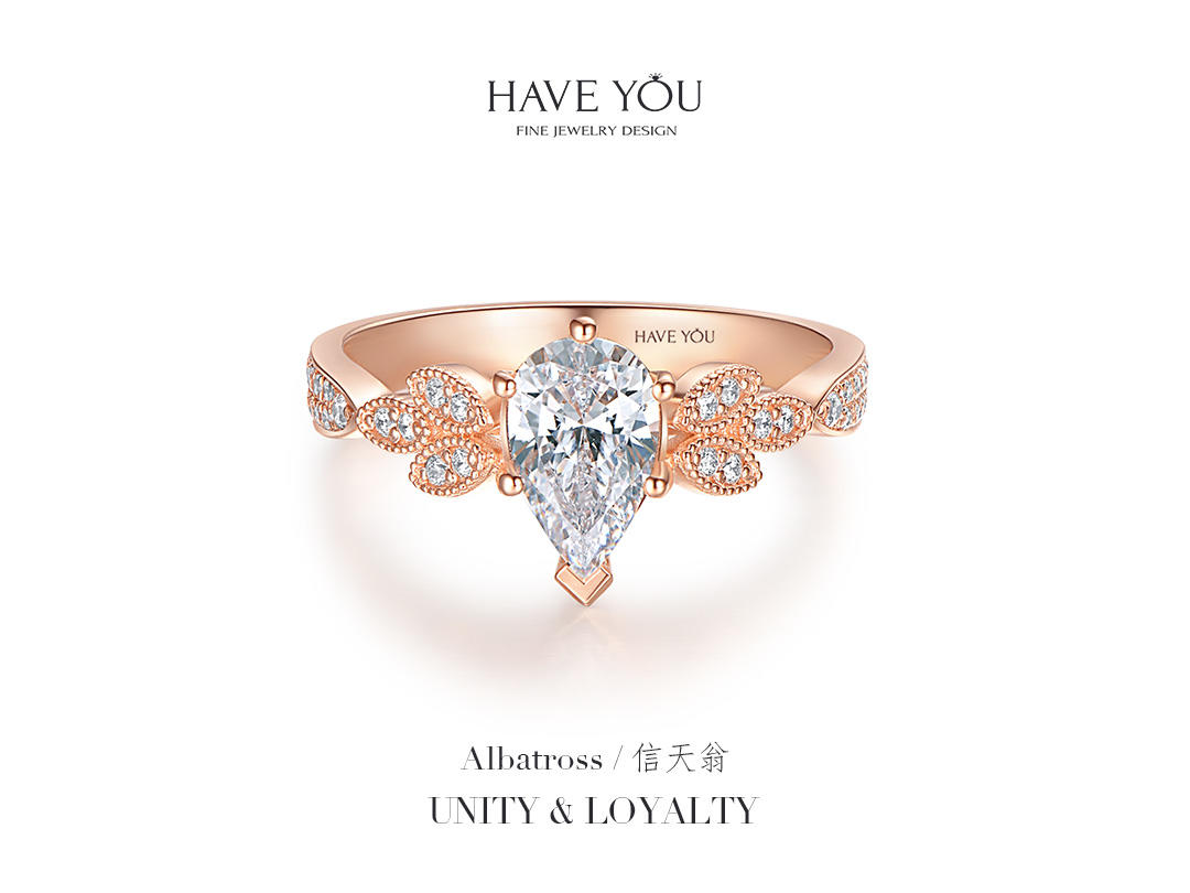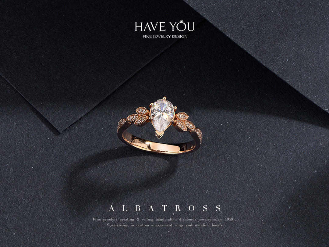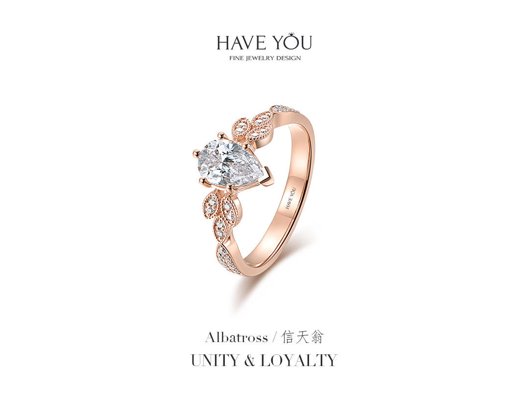 就我自己的观点说啦,好看的钻戒不一定要是循规蹈矩,也不一定是花里胡哨,它一定是有那个亮点,能够抓住人的眼球的。 - 看过了不少戒指,对【HAVEYOU】的一款信天翁还是印象比较深刻的。起初是被它的名字吸引,觉得很特别,后来真正端详它,又发觉这样的设计才是我想要的与众不同。水滴形的主钻也是六爪包围,但是其中一爪是呈v字型,保护着水滴的尖尖的。主钻一克拉多一点,真的很有排面哈,戒托是一颗颗小的水滴,但不是钻石的哦,这时做了玫瑰金的雕刻设计,而且排列和拼接的方式也是 -有规律的,一组一组的呈现,真的很有创意。【HAVEYOU】不愧是深圳珠宝中的一员,一个出众的佼佼者,让我这种完美主义者看了都觉得美的无可挑剔,那就点个大大的赞吧。