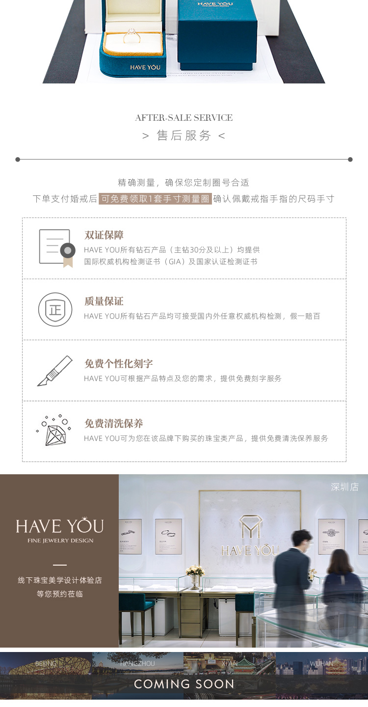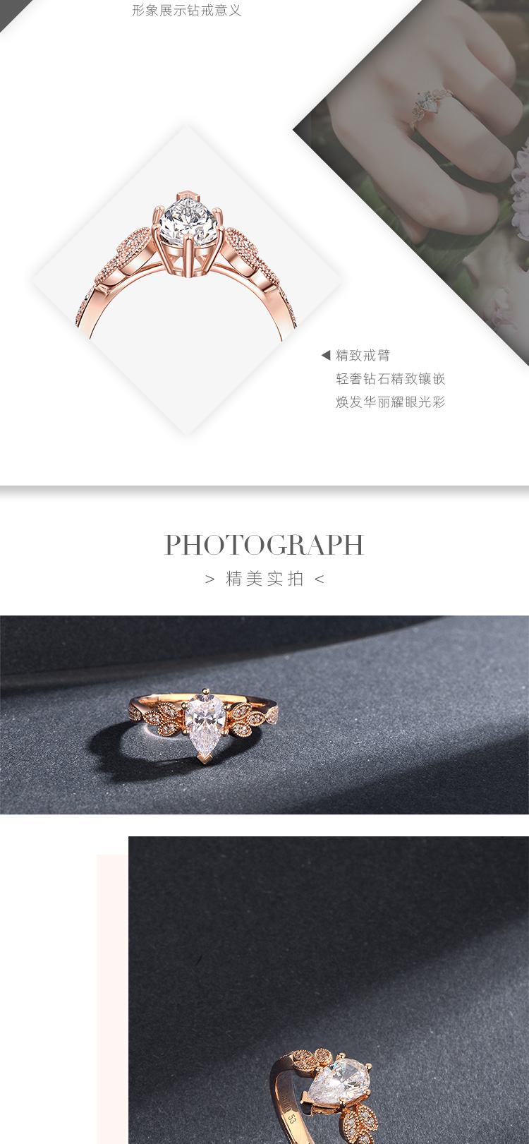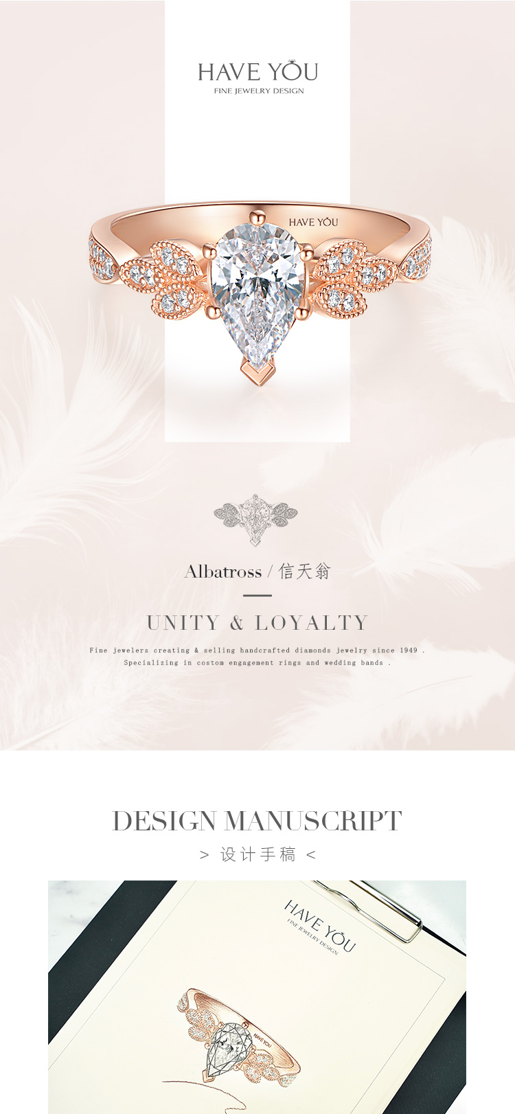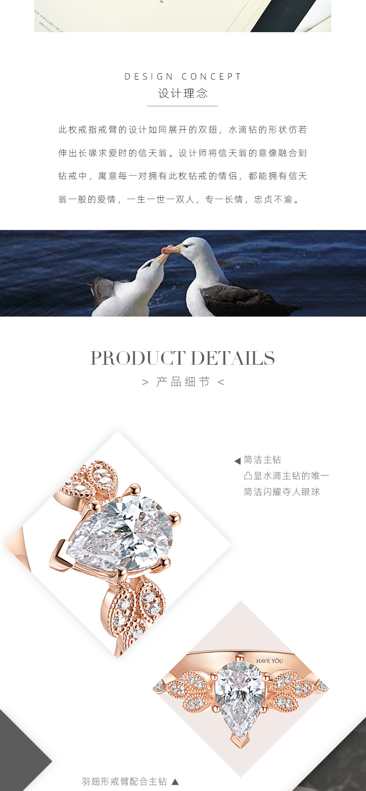 就我自己的观点说啦,好看的钻戒不一定要是循规蹈矩,也不一定是花里胡哨,它一定是有那个亮点,能够抓住人的眼球的。 - 看过了不少戒指,对【HAVEYOU】的一款信天翁还是印象比较深刻的。起初是被它的名字吸引,觉得很特别,后来真正端详它,又发觉这样的设计才是我想要的与众不同。水滴形的主钻也是六爪包围,但是其中一爪是呈v字型,保护着水滴的尖尖的。主钻一克拉多一点,真的很有排面哈,戒托是一颗颗小的水滴,但不是钻石的哦,这时做了玫瑰金的雕刻设计,而且排列和拼接的方式也是 -有规律的,一组一组的呈现,真的很有创意。【HAVEYOU】不愧是深圳珠宝中的一员,一个出众的佼佼者,让我这种完美主义者看了都觉得美的无可挑剔,那就点个大大的赞吧。