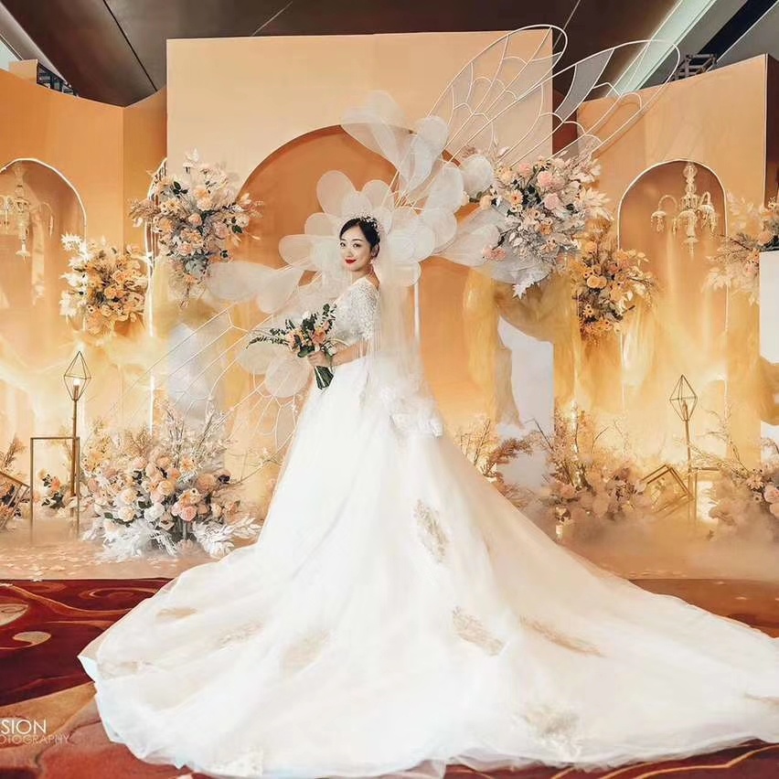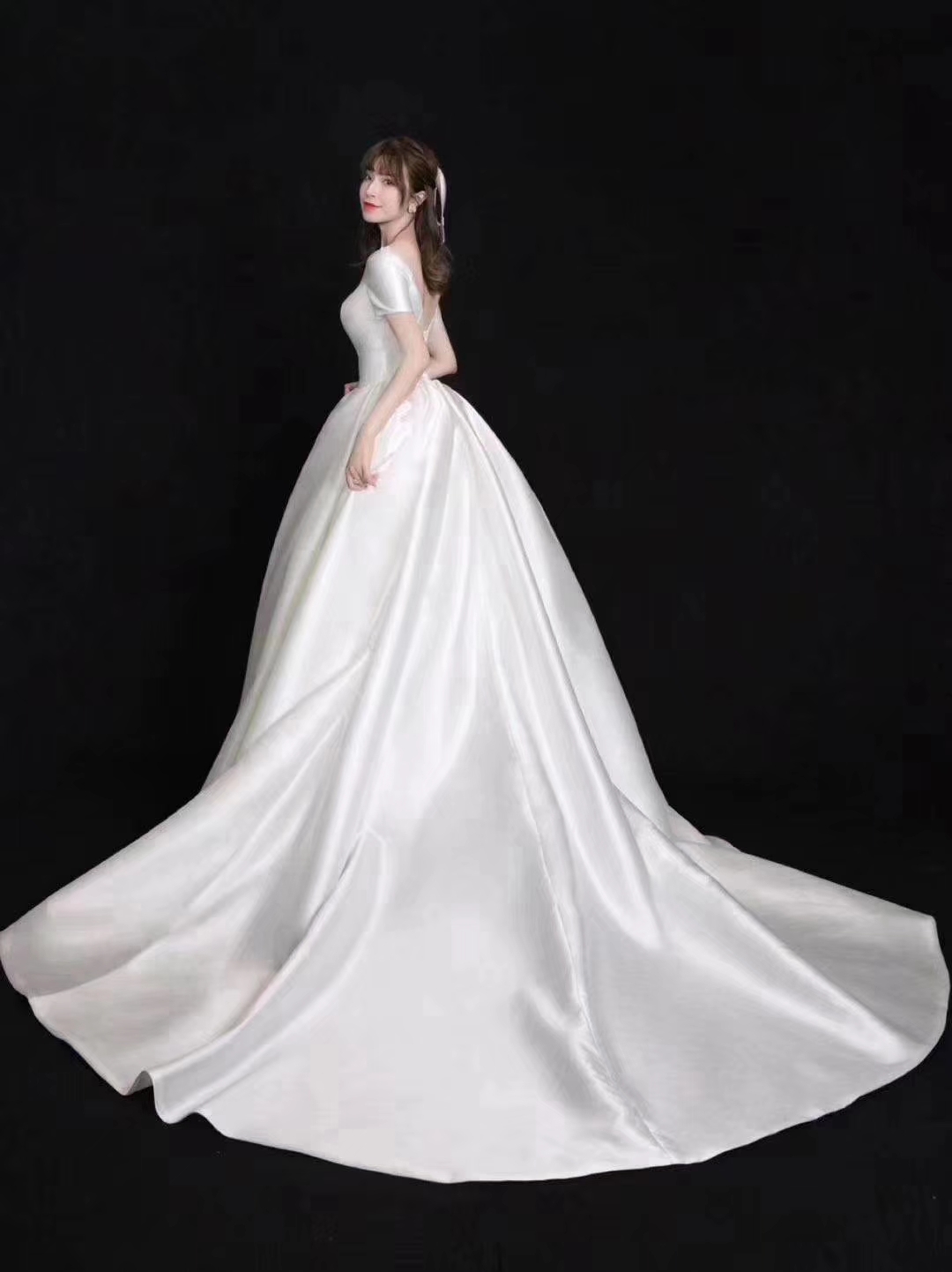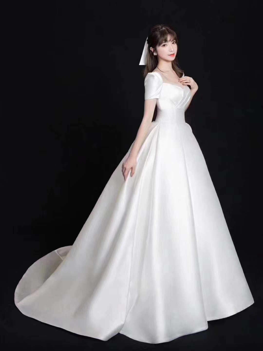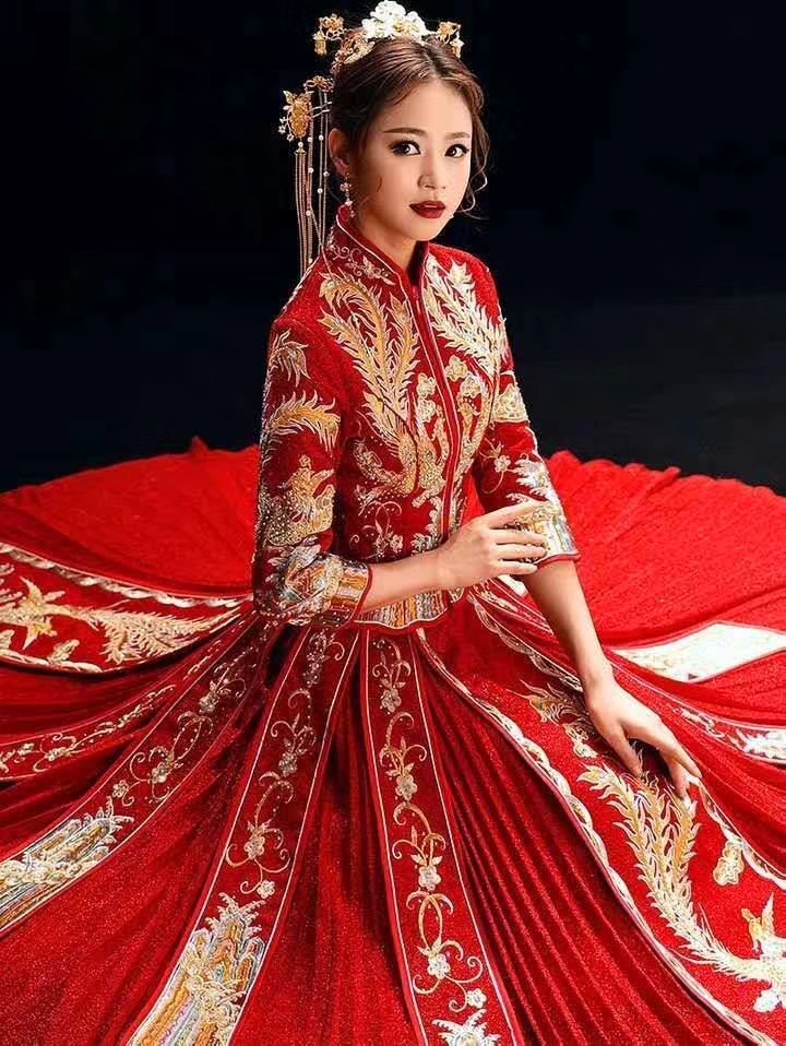 韩式主题缎面婚纱礼服,轻纱拖尾婚纱,中式秀禾服定制款