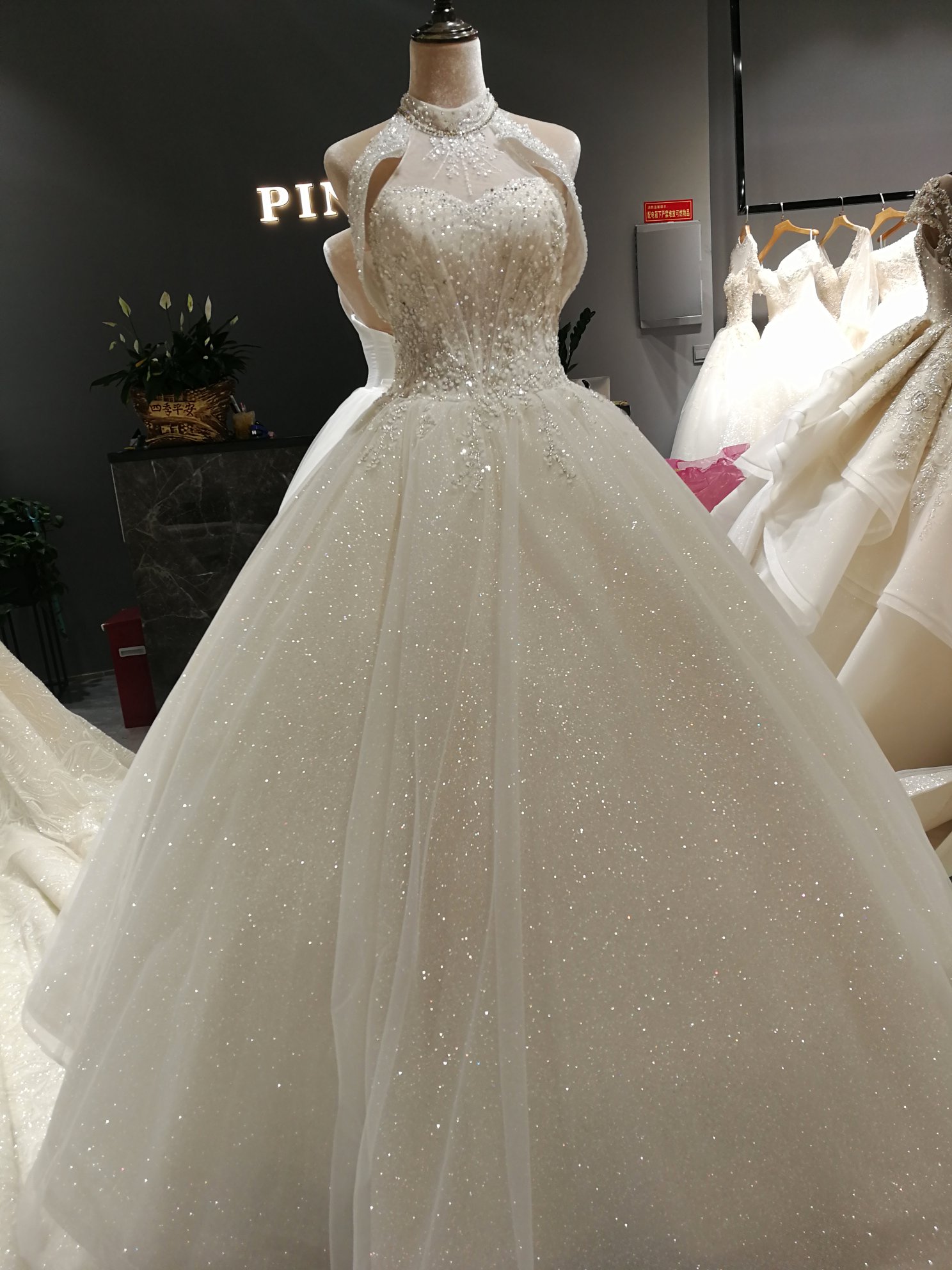 非常气质的一款齐地纱,不同与一字肩,肩袖刚好搭在大臂处,做了很好的修饰