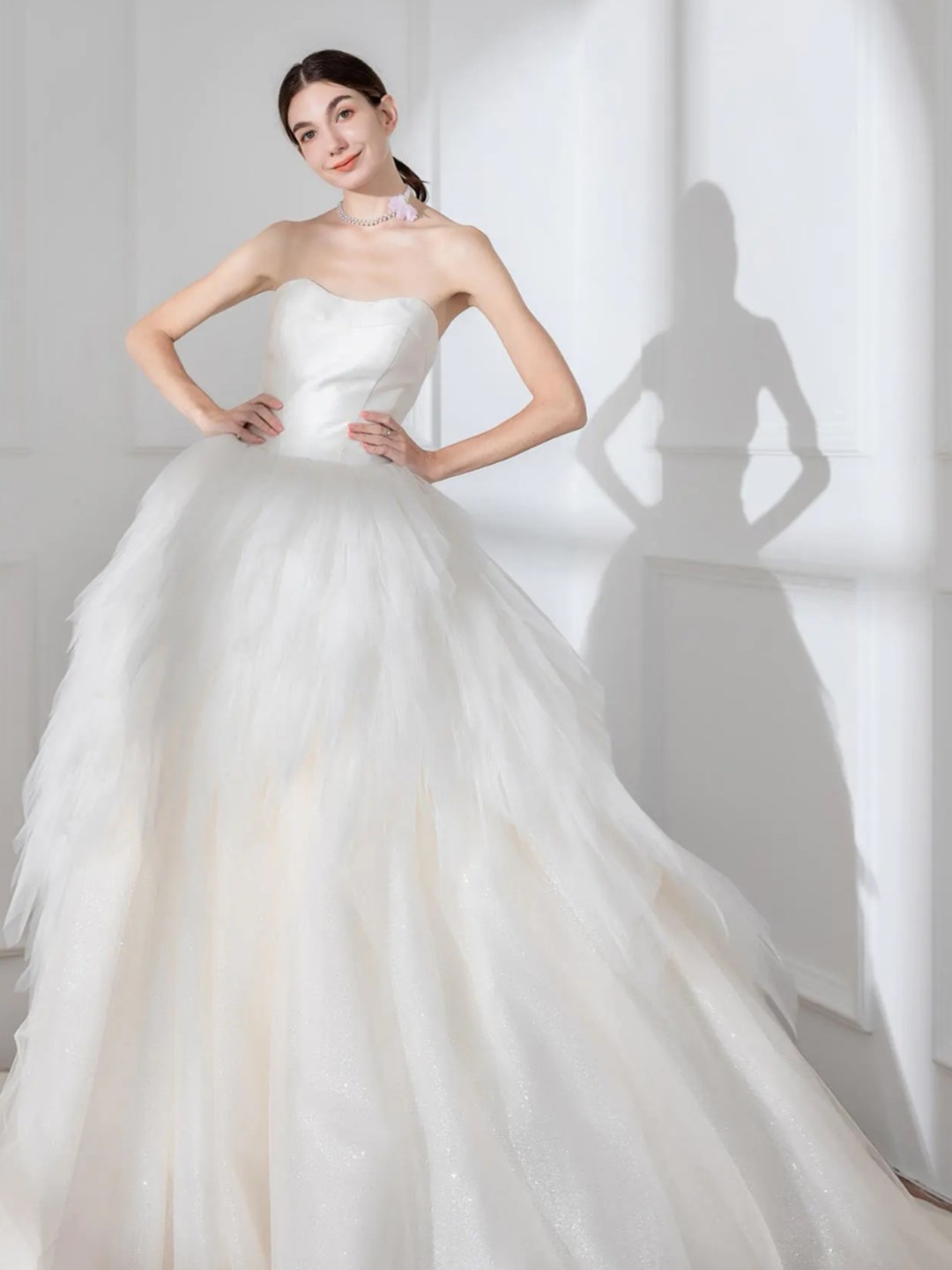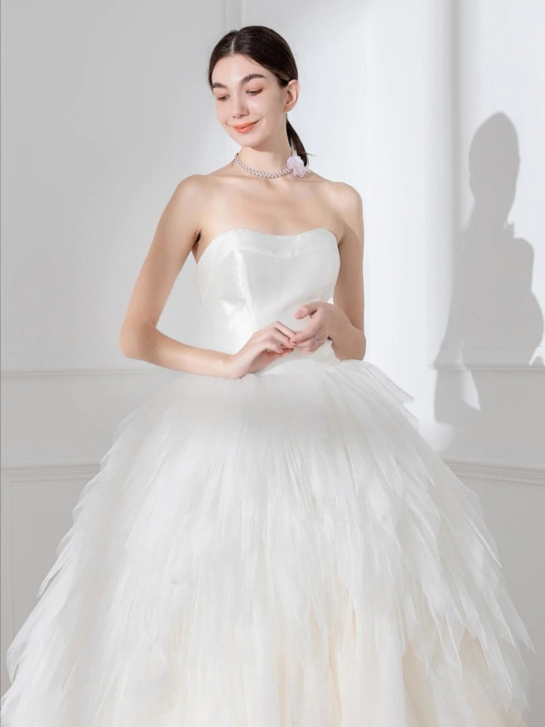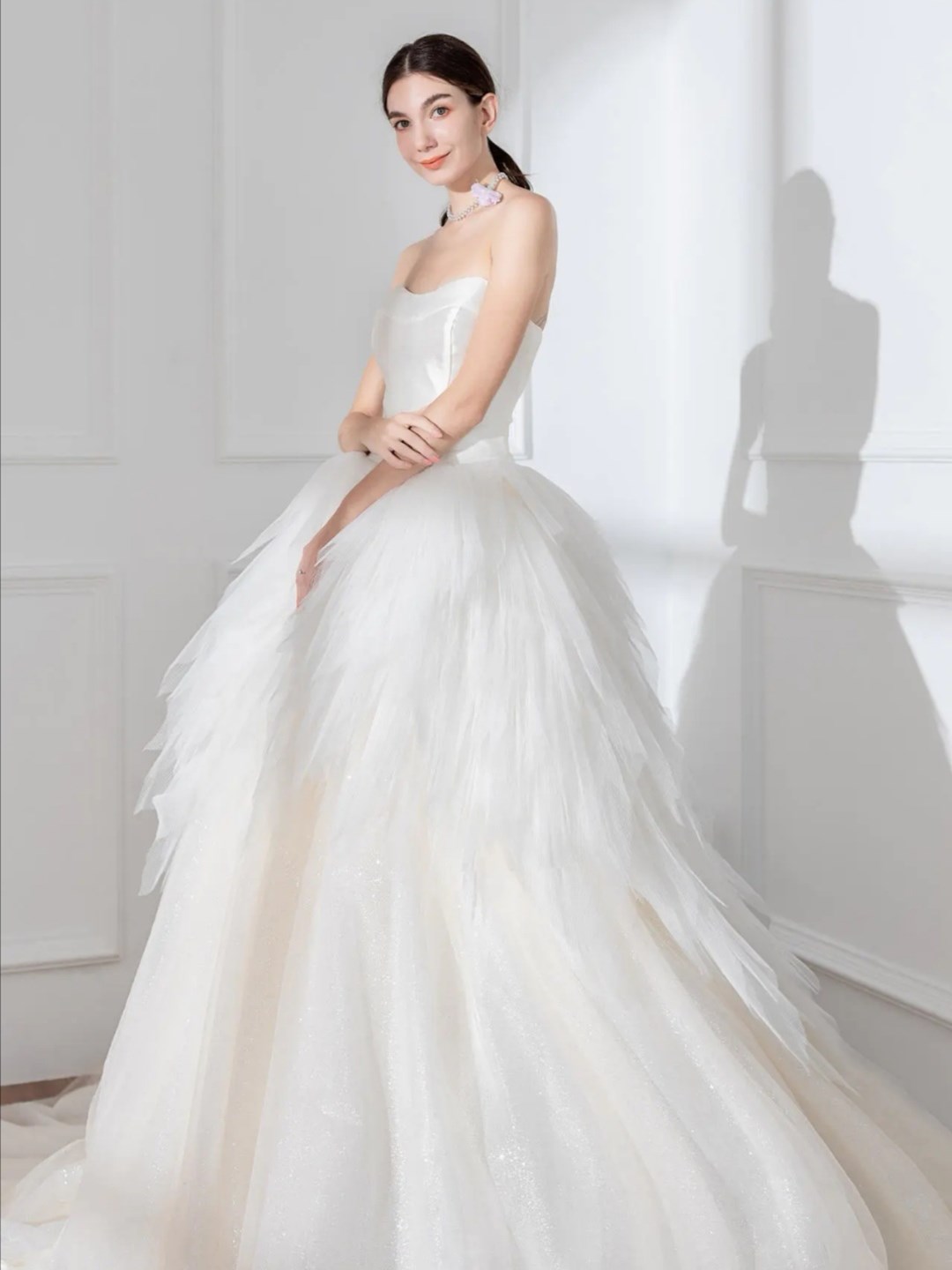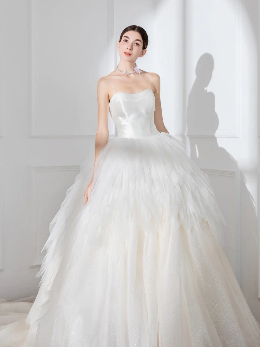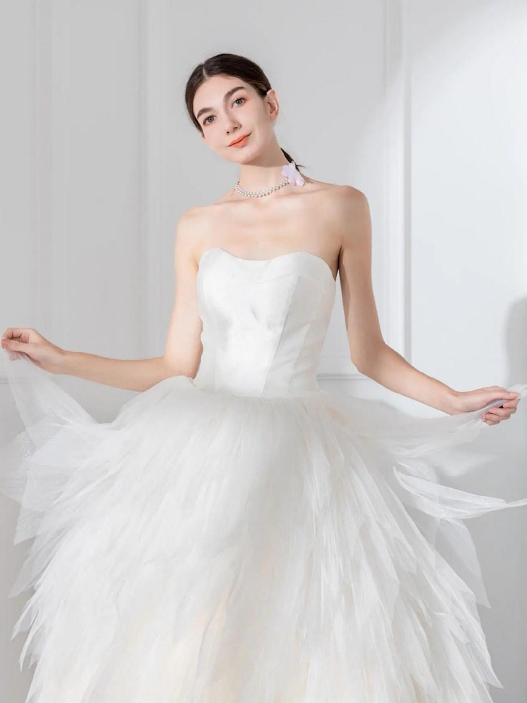 婚纱里的白月光 缎面和网纱的拼接让这件婚纱可盐可甜 下裙摆做的蛋糕裙 很有亮点和特别的剪裁