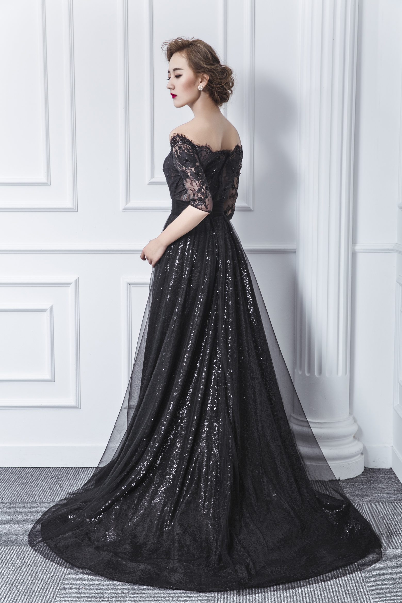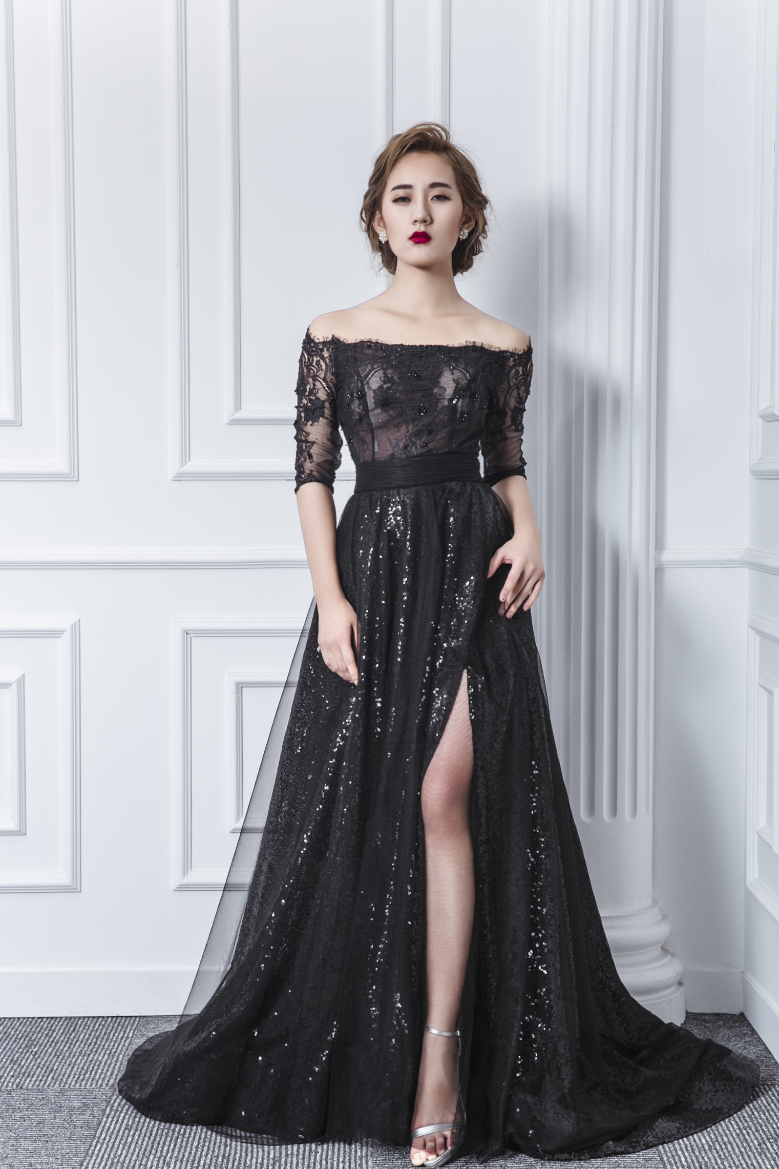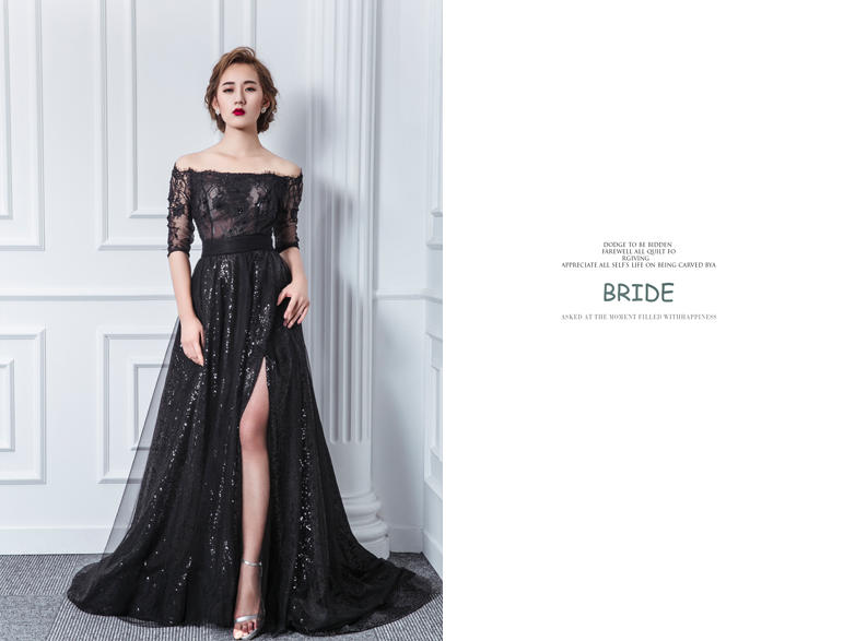 一字肩 黑色蕾丝开叉晚礼服